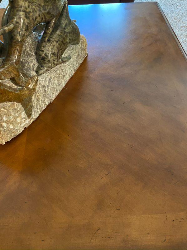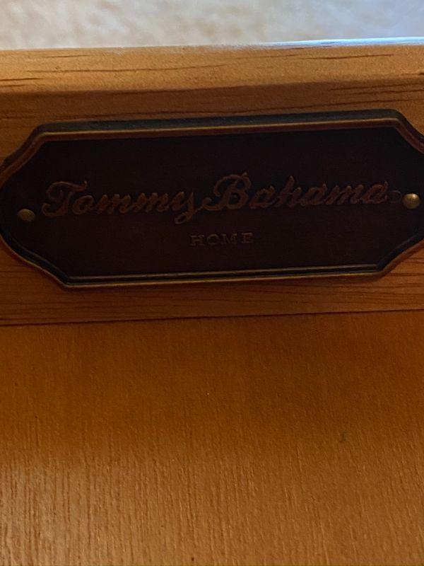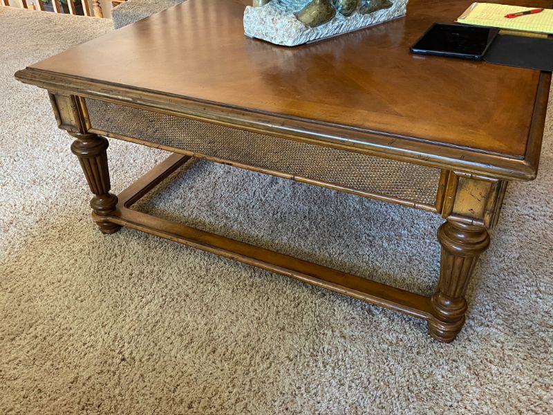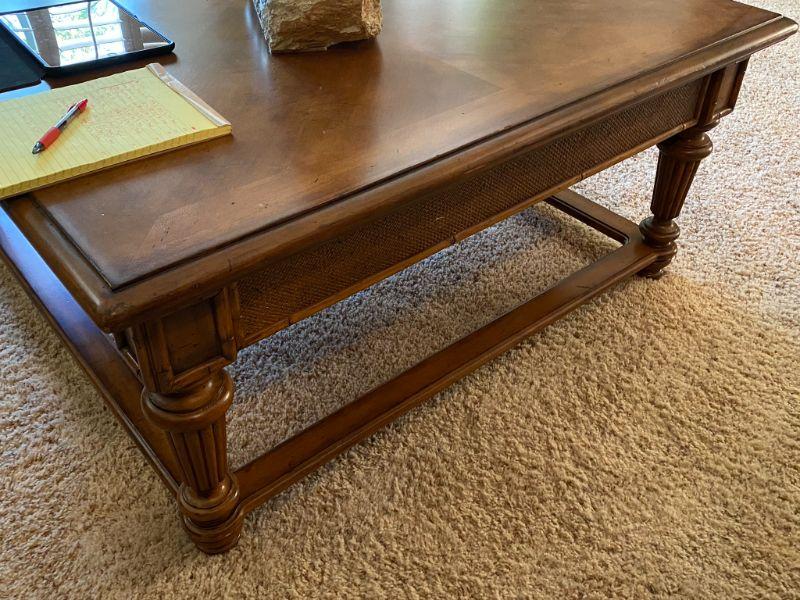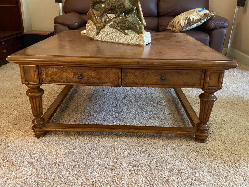 Large Tommy Bahama Home Solid Wood Coffee Table. Has double drawers on two sides. Great Condition. Measures 30'' H x 32'' W x 20'' D.