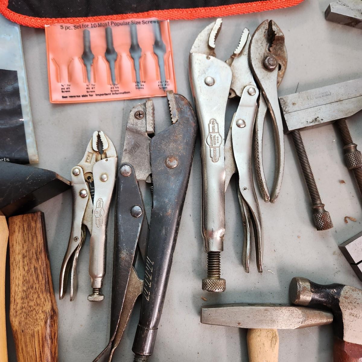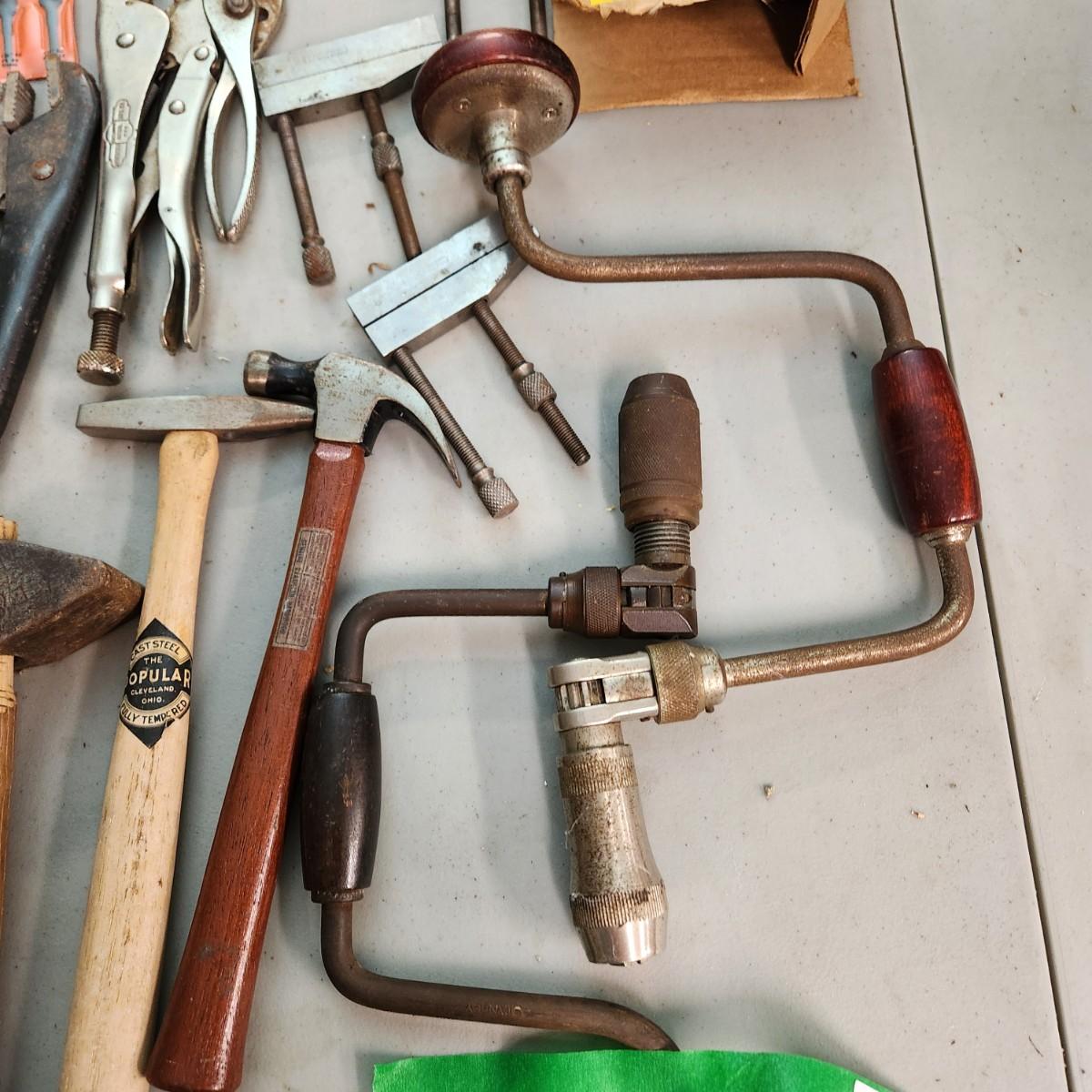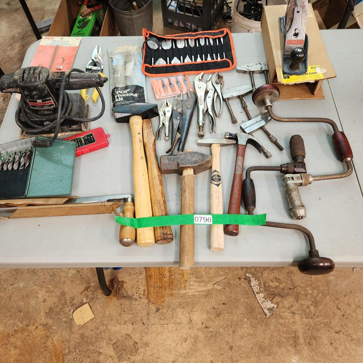Large Tool lot Vise Grips Hammers, Sander, Hanson Drill Bits, Belknap , Stanley Plane