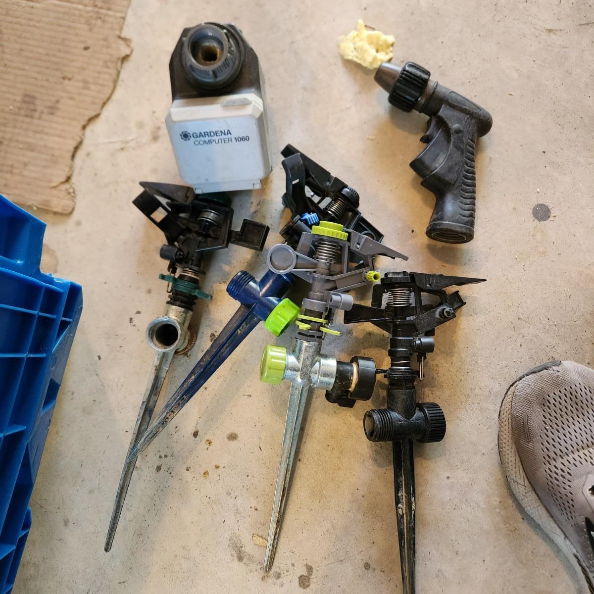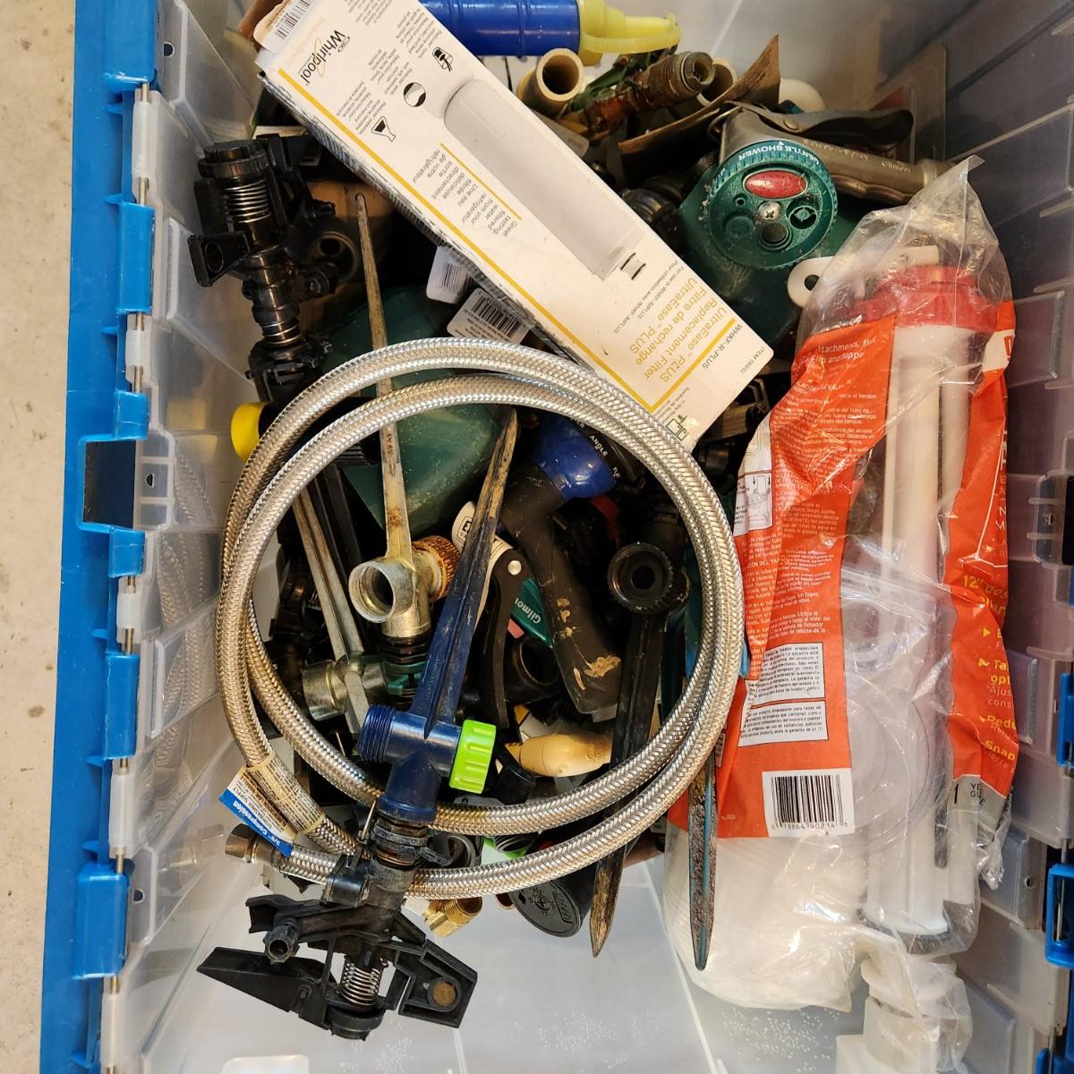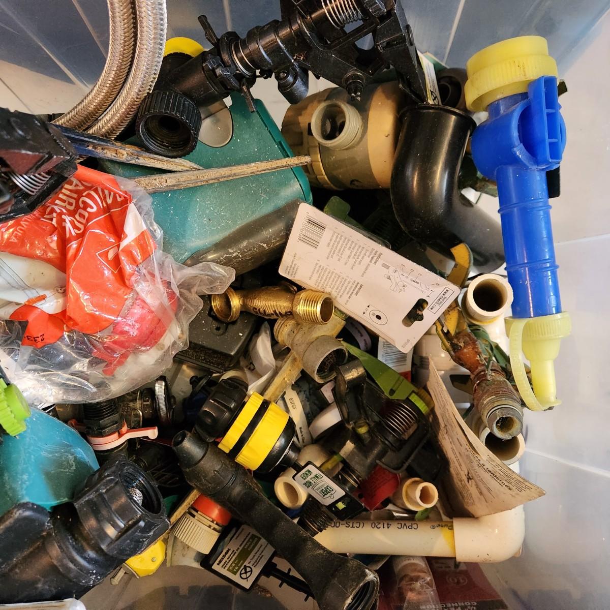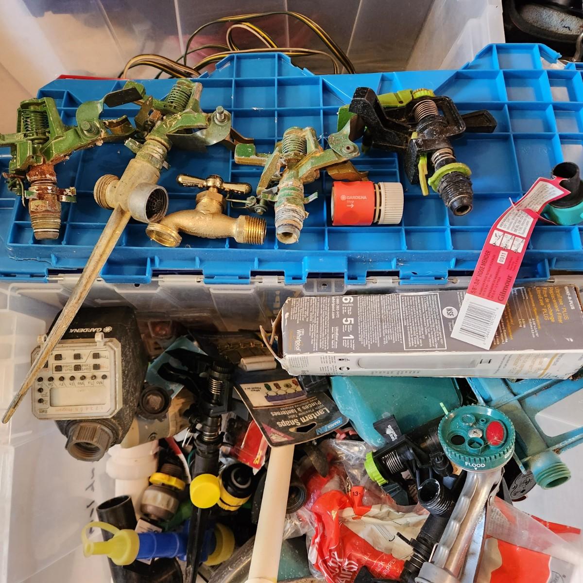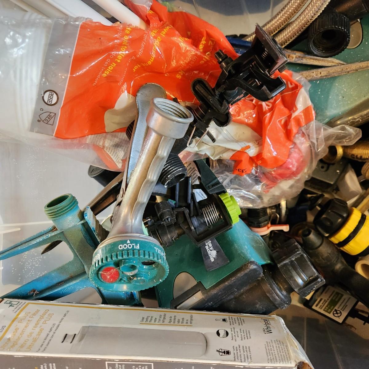 Large Tote filled with Garden Sprinklers Hose Attachments