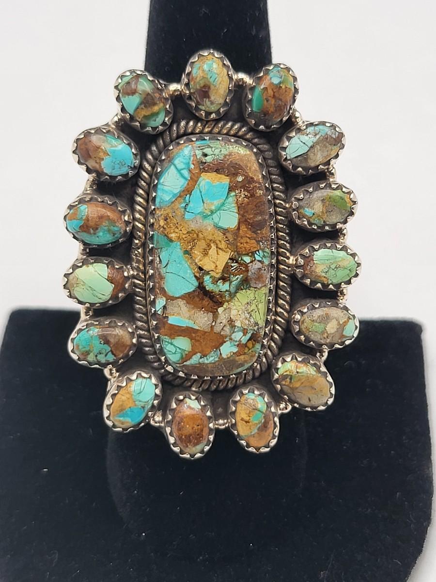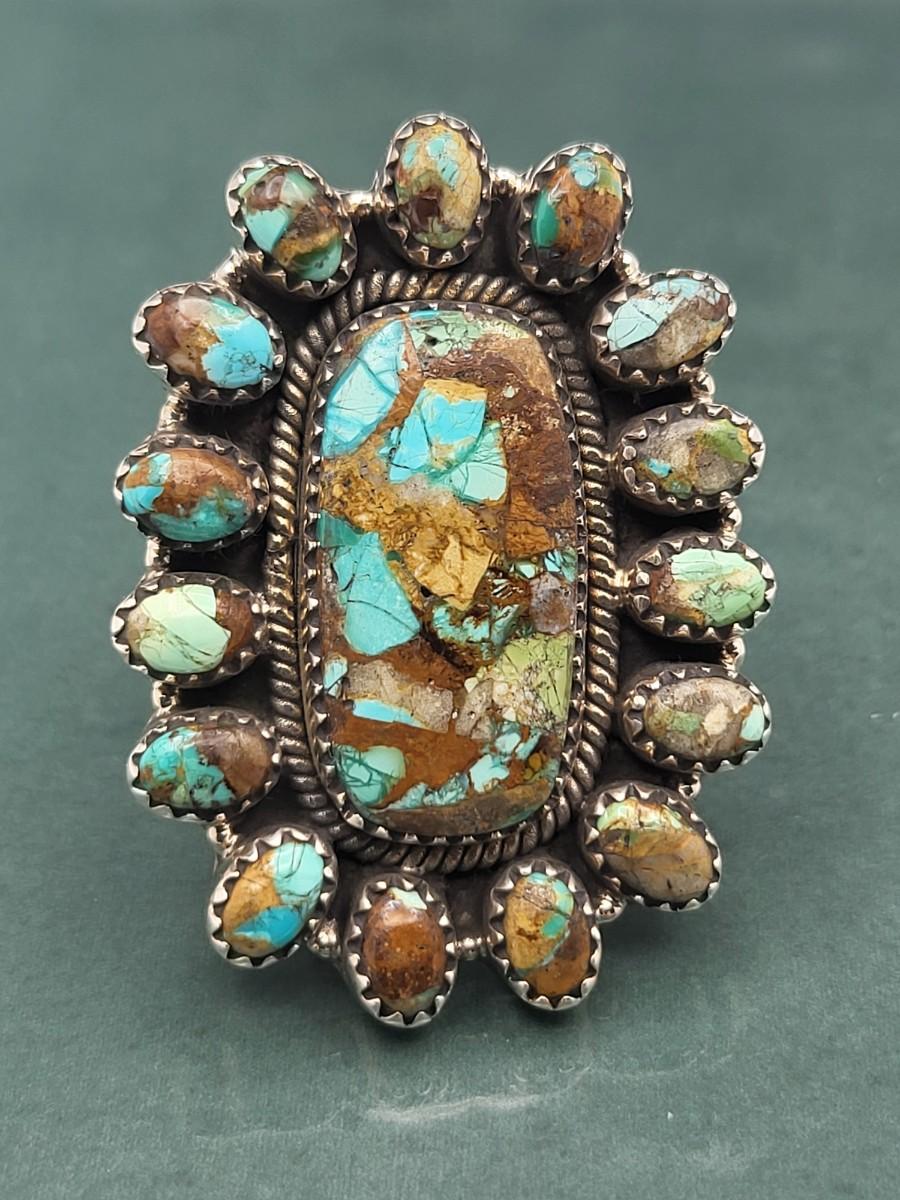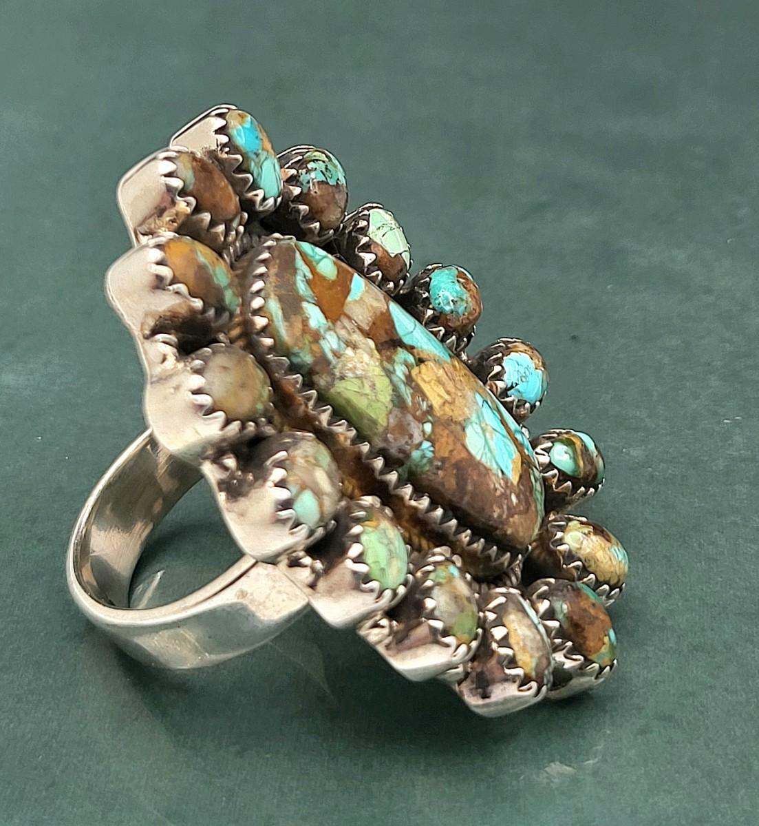 This is a beautiful handmade multi tone spice Turquoise and Sterling Silver adjustable, cluster ring. Ring has 15 smaller oval stones surrounding beautiful center turquoise stone. Size 8, somewhat adjustable open band in solid 925 silver. Measures 1.75" long x 1.25" wide. Total weight is 20 grams.