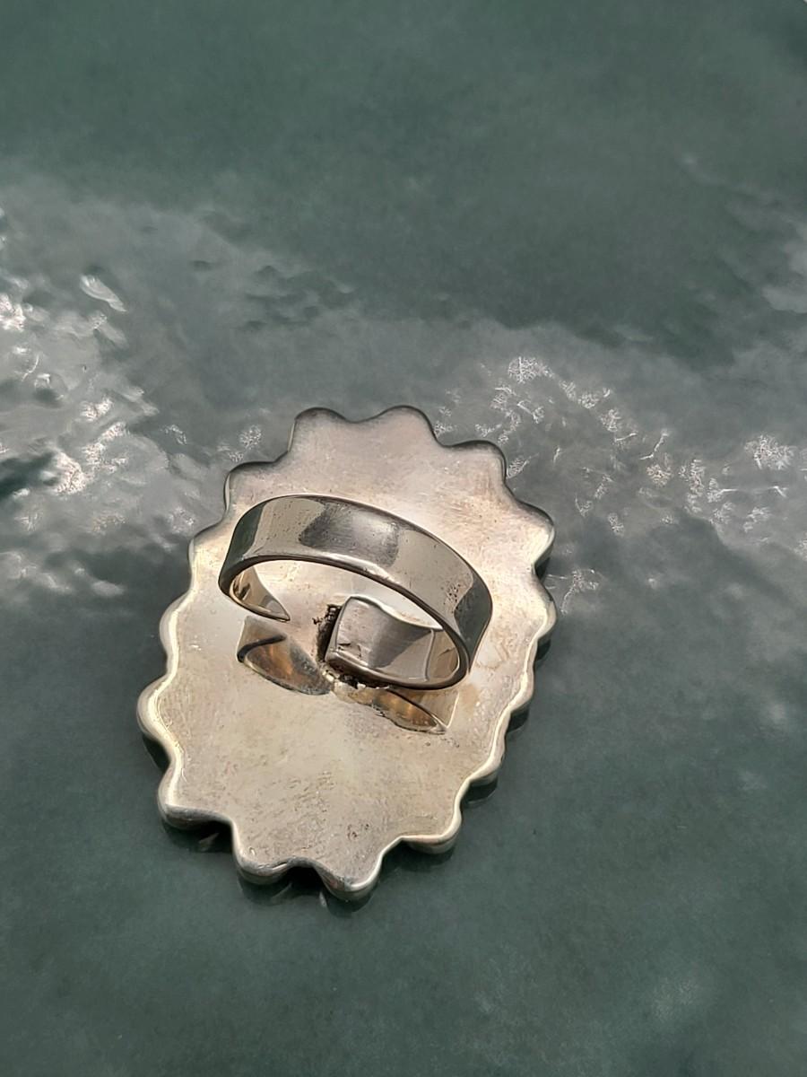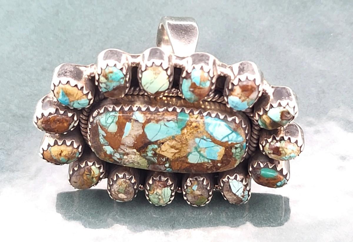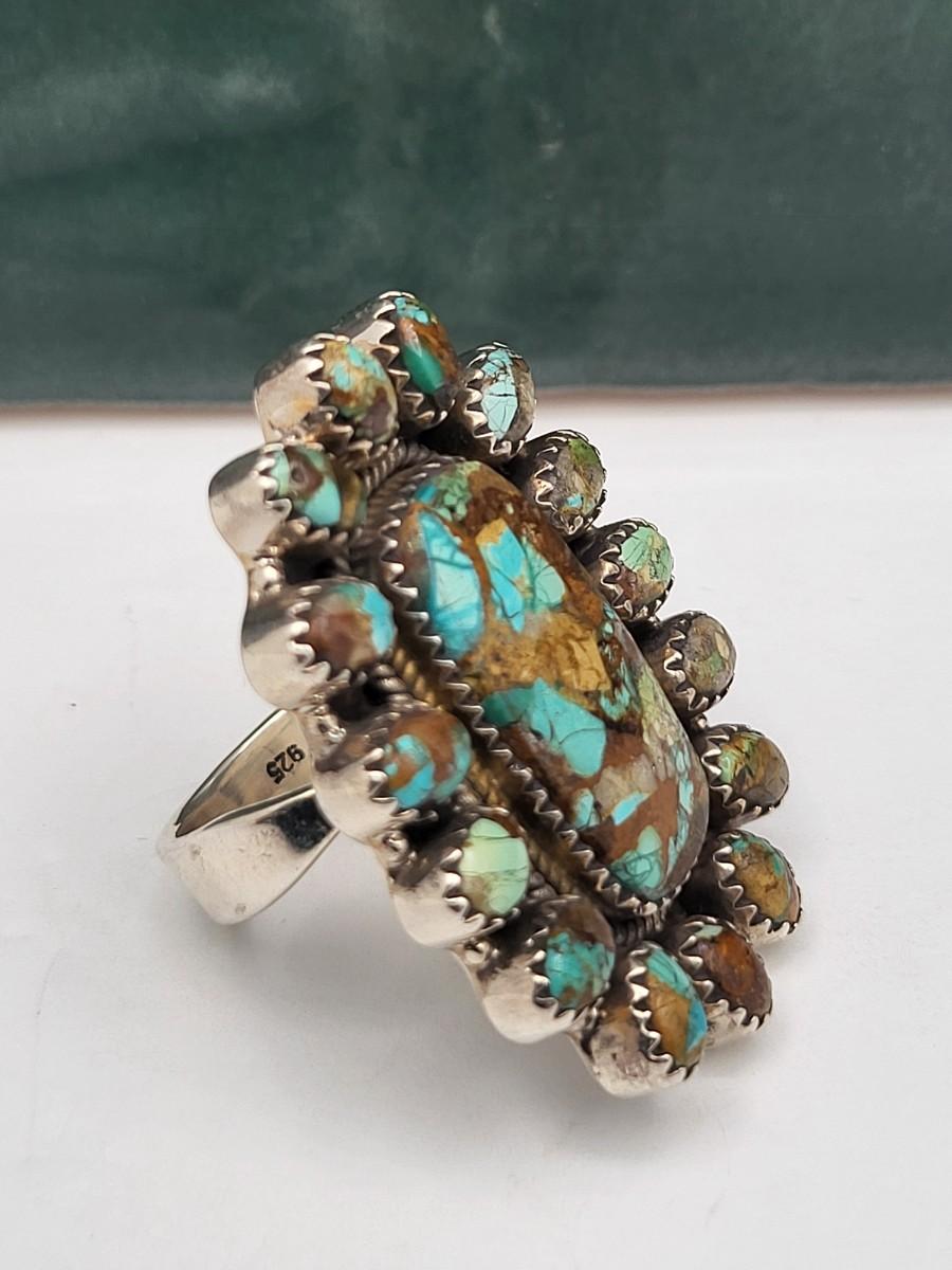 This is a beautiful handmade multi tone spice Turquoise and Sterling Silver adjustable, cluster ring. Ring has 15 smaller oval stones surrounding beautiful center turquoise stone. Size 8, somewhat adjustable open band in solid 925 silver. Measures 1.75" long x 1.25" wide. Total weight is 20 grams.
