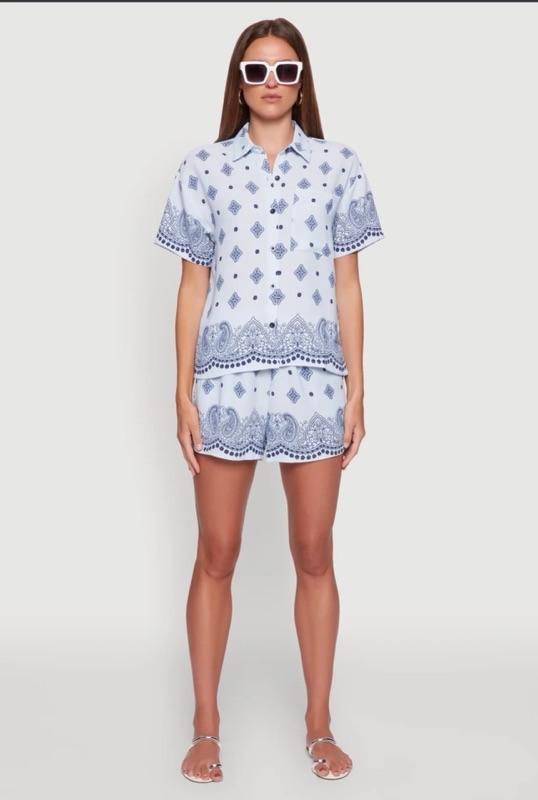 Large Two Piece Set Crepe Knit Bandana Print Shirt/Shorts - Blue