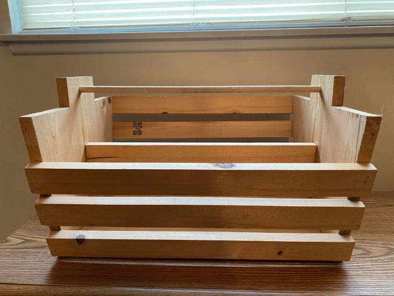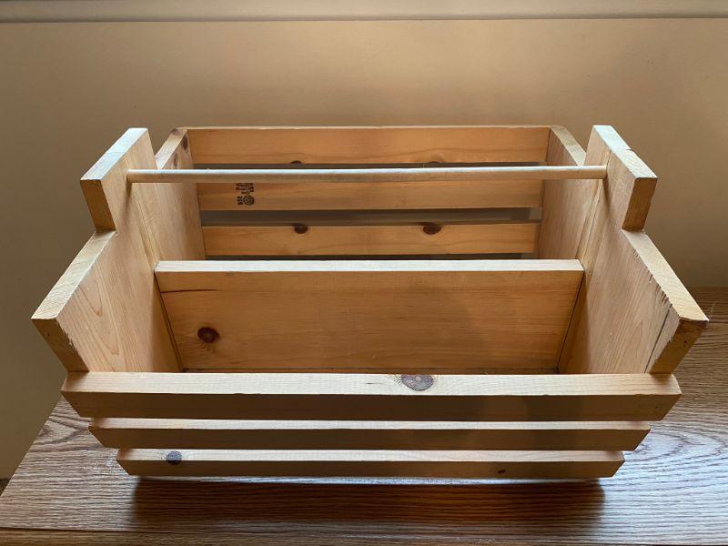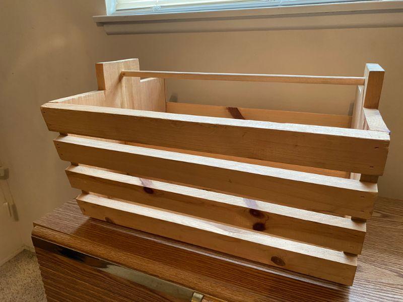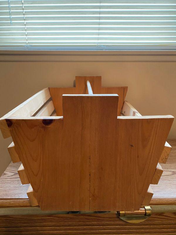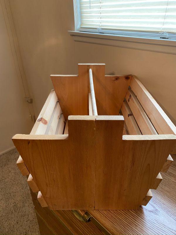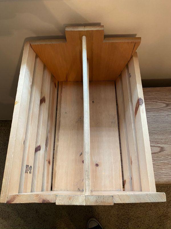 Large unfinished pine newspaper/ magazine rack. It is missing a slat on the top of one side. Unfinished, keep as is, stain it, or paint it. Looks homemade.