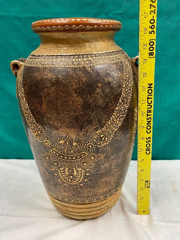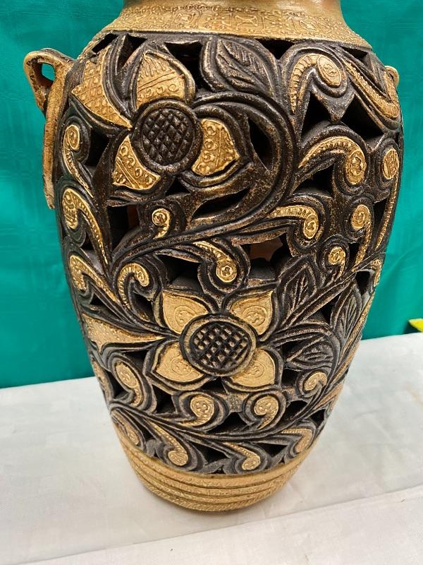 Large open work planter vase. Different designs on opposite sides. One side has an open work design. Large and heavy, about 17" tall. Great as is or as a vase for artificial plants.