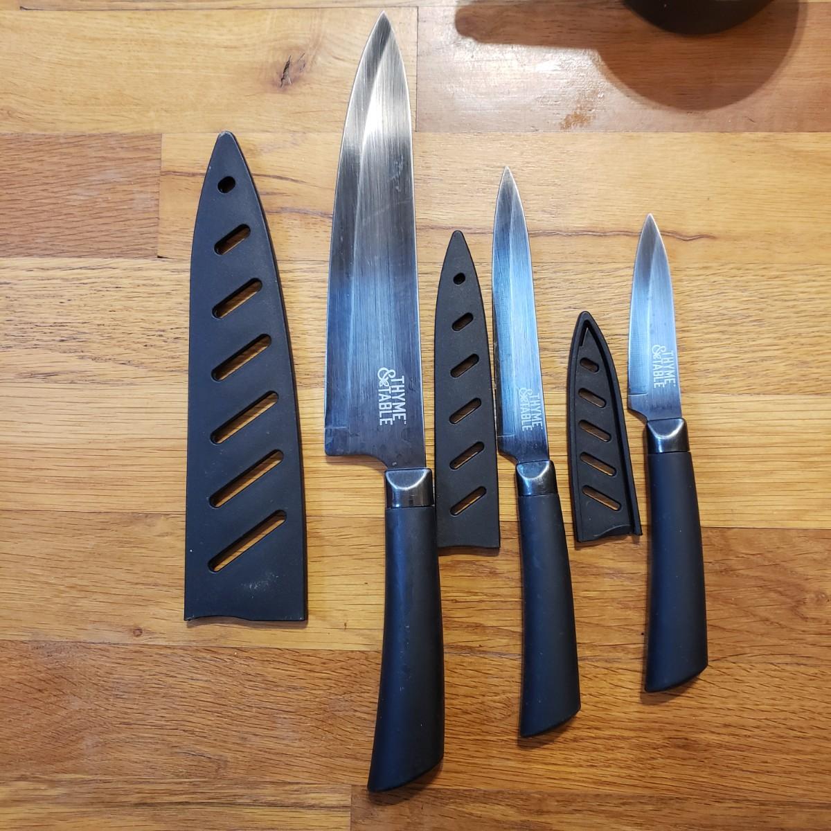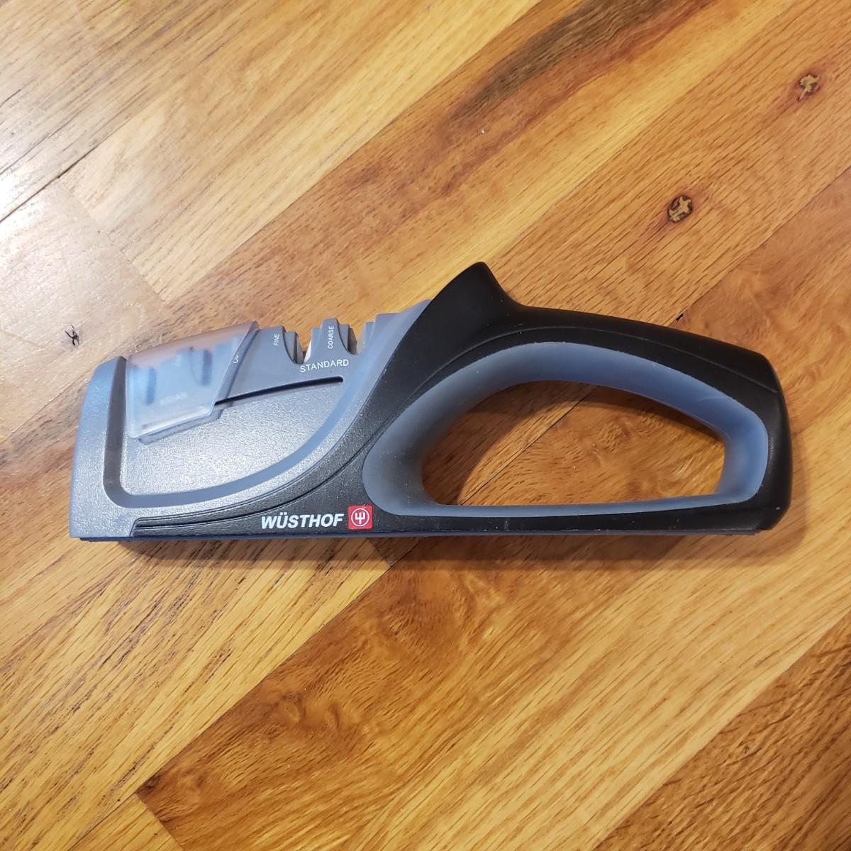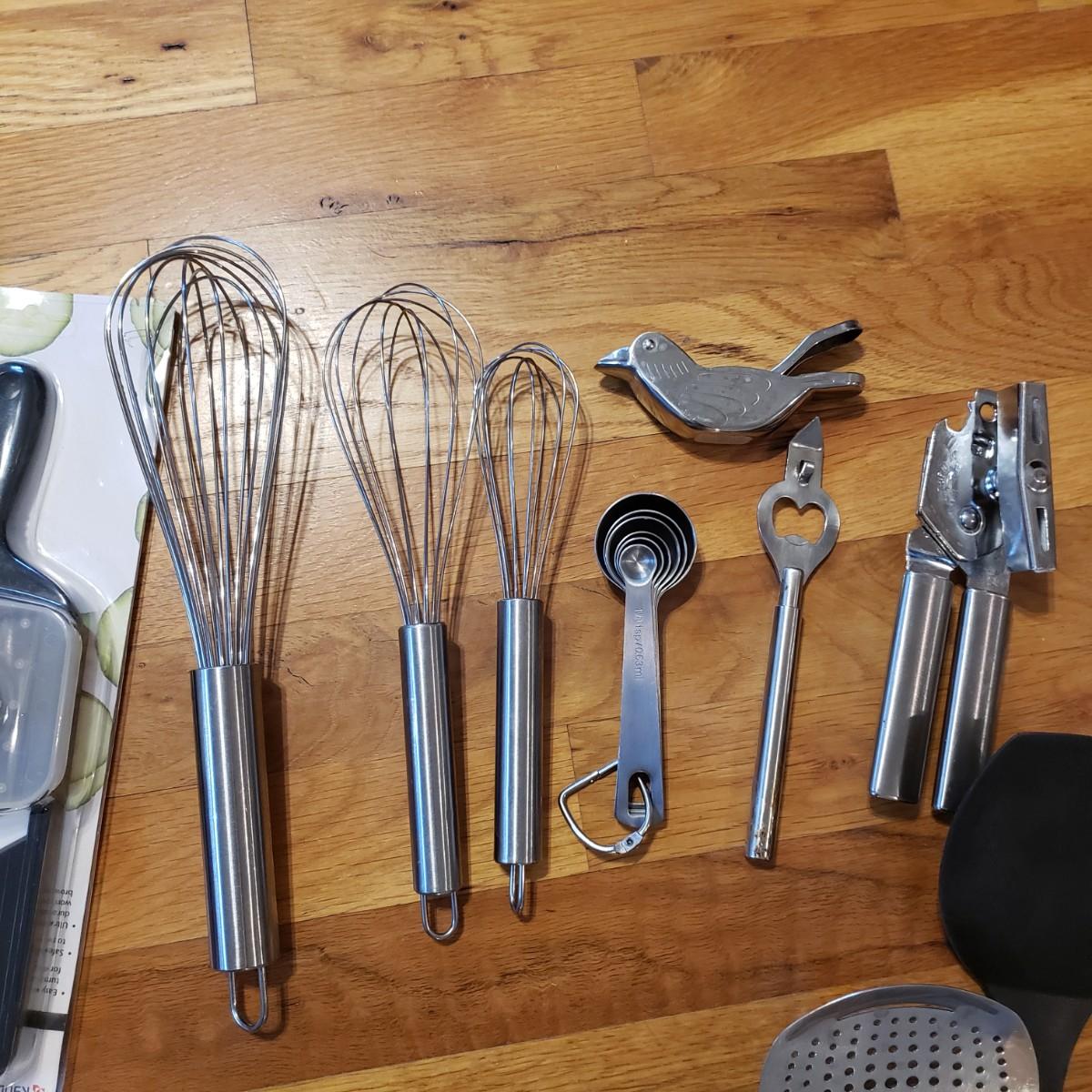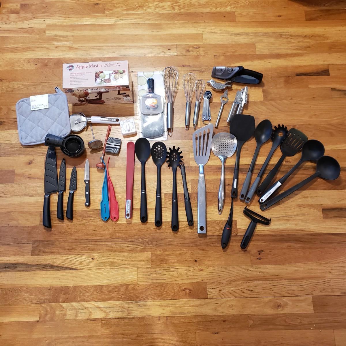 This is a large kitchen utensil lot. There is a three piece Thyme & Table set of knives. Also an OXO black spoon, draining spoon and noodle spoon. The Wusthof sharpener measures 9" x 3"H. The Norpro Apple Master looks barely used. See pictures for inventory and details.