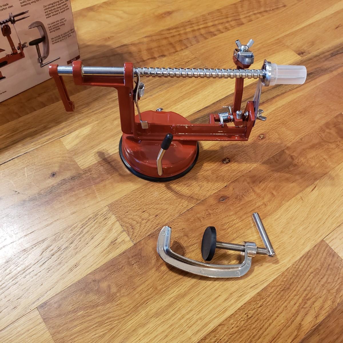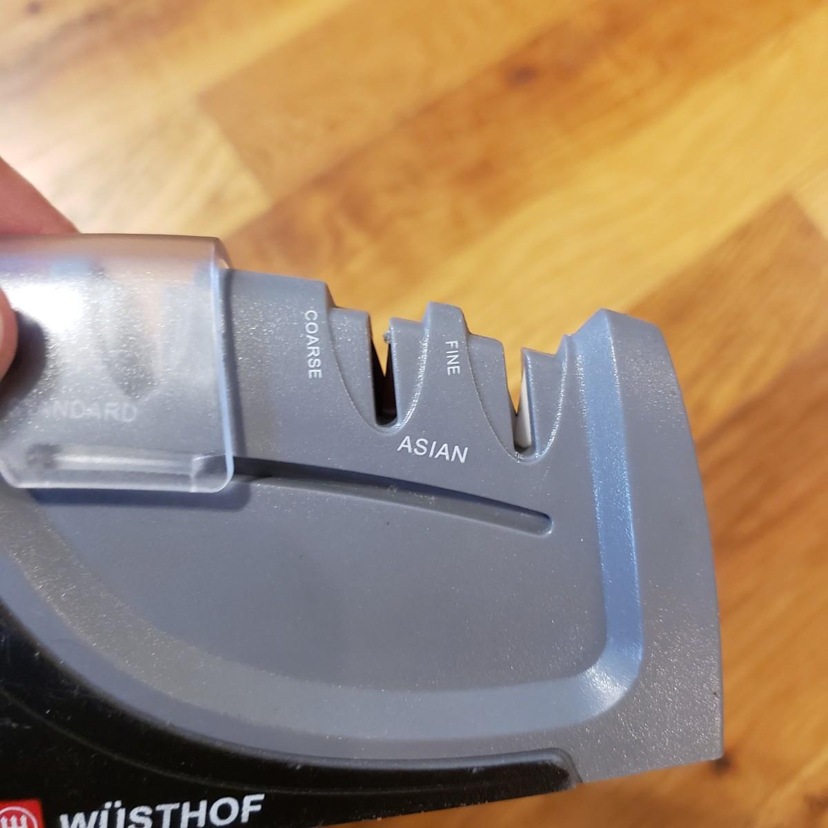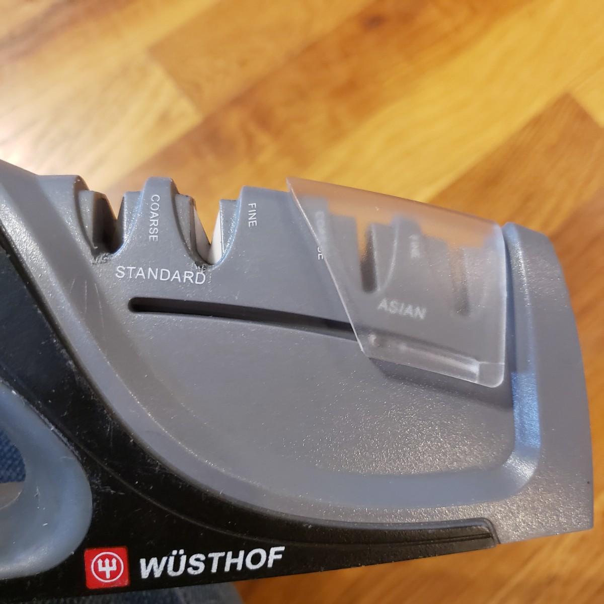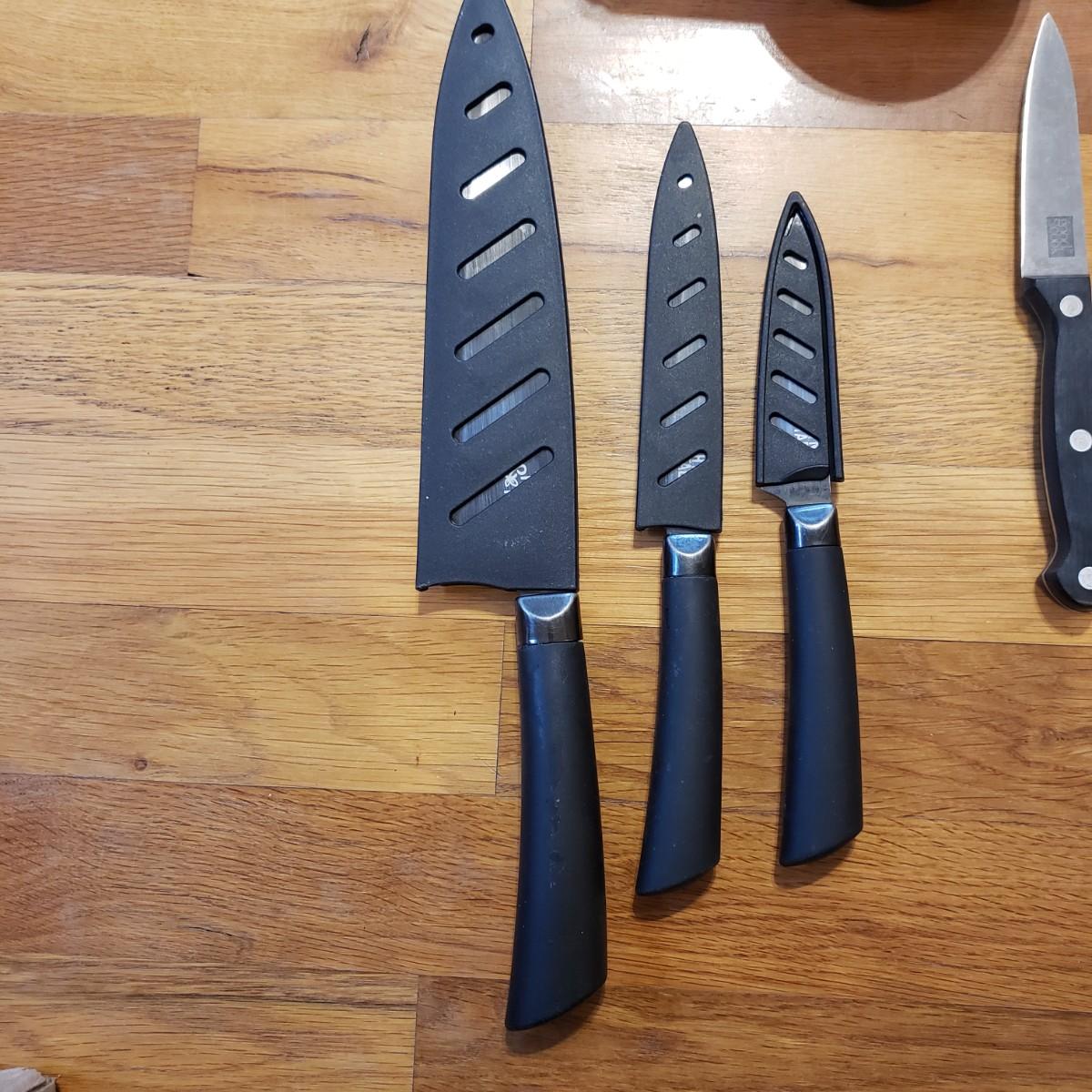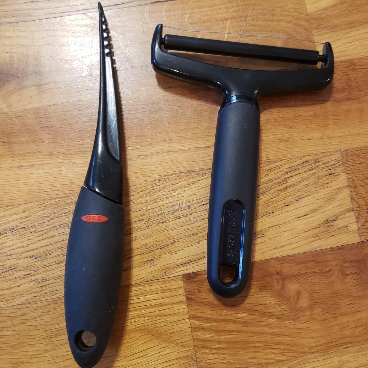 This is a large kitchen utensil lot. There is a three piece Thyme & Table set of knives. Also an OXO black spoon, draining spoon and noodle spoon. The Wusthof sharpener measures 9" x 3"H. The Norpro Apple Master looks barely used. See pictures for inventory and details.