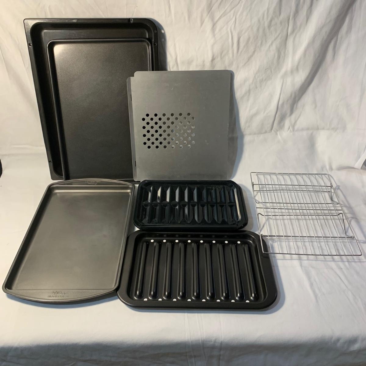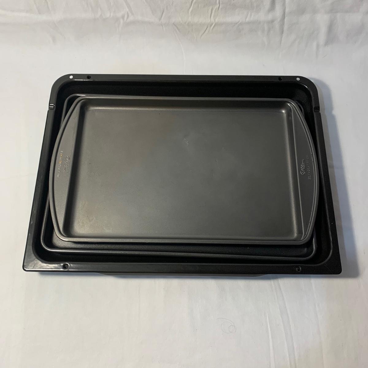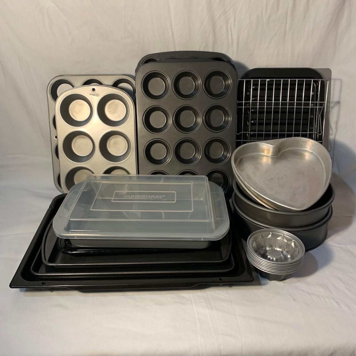 This lot includes a large variety of bakeware. You’ll find eight mini Bundt pans, six muffin pans, a springform pan with glass bottom, four roasting pans, one lidded baking pan, two cookie sheets, one deep roasting pan and more! Most items show signs of use. See photos for more details.