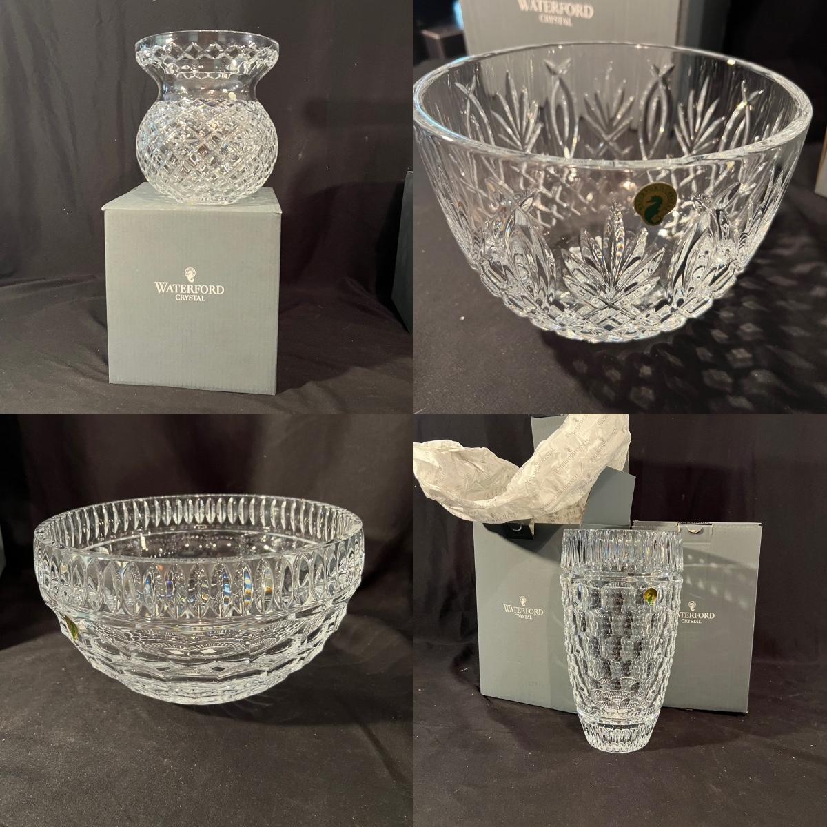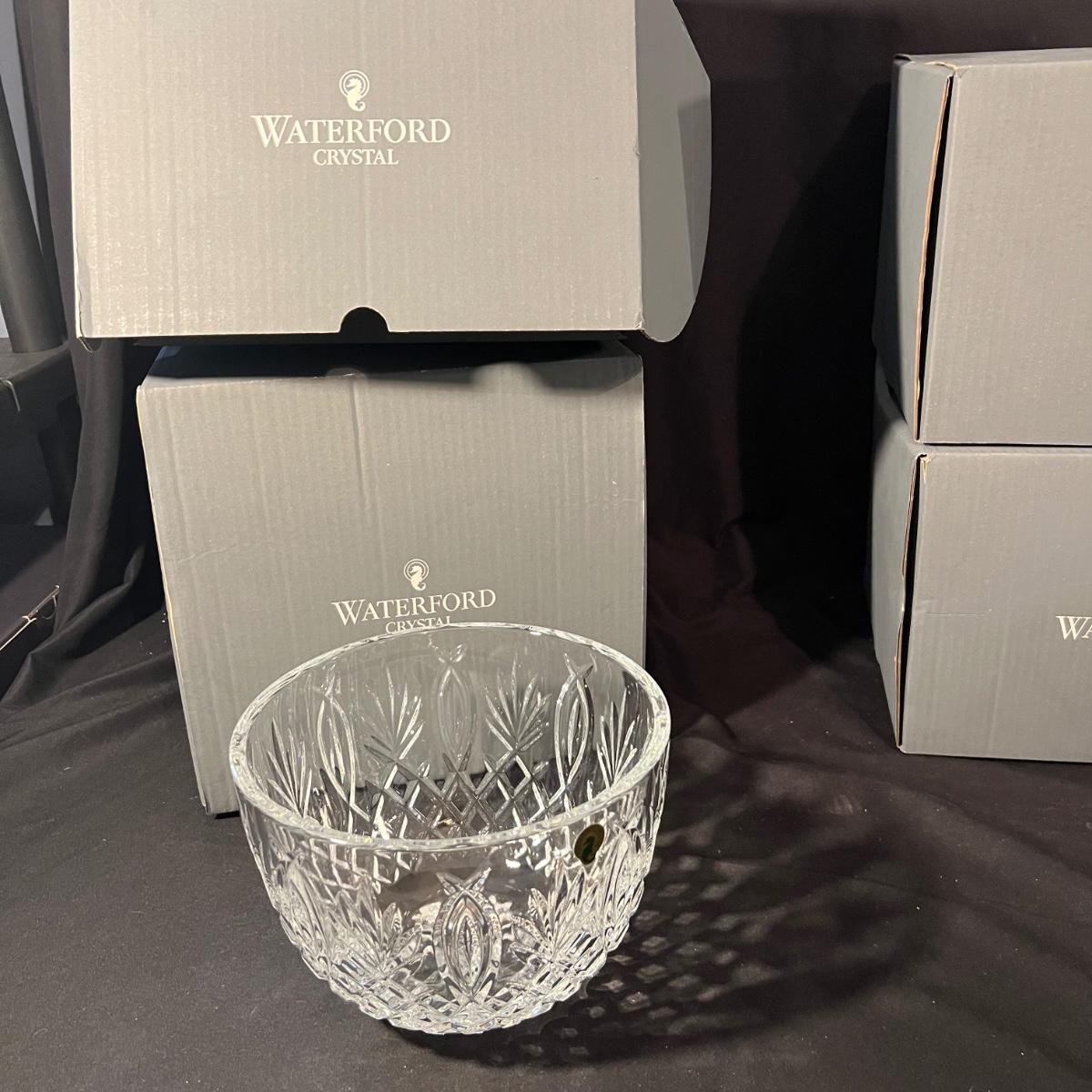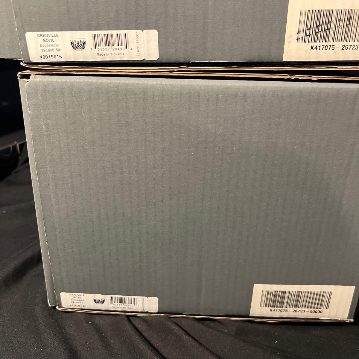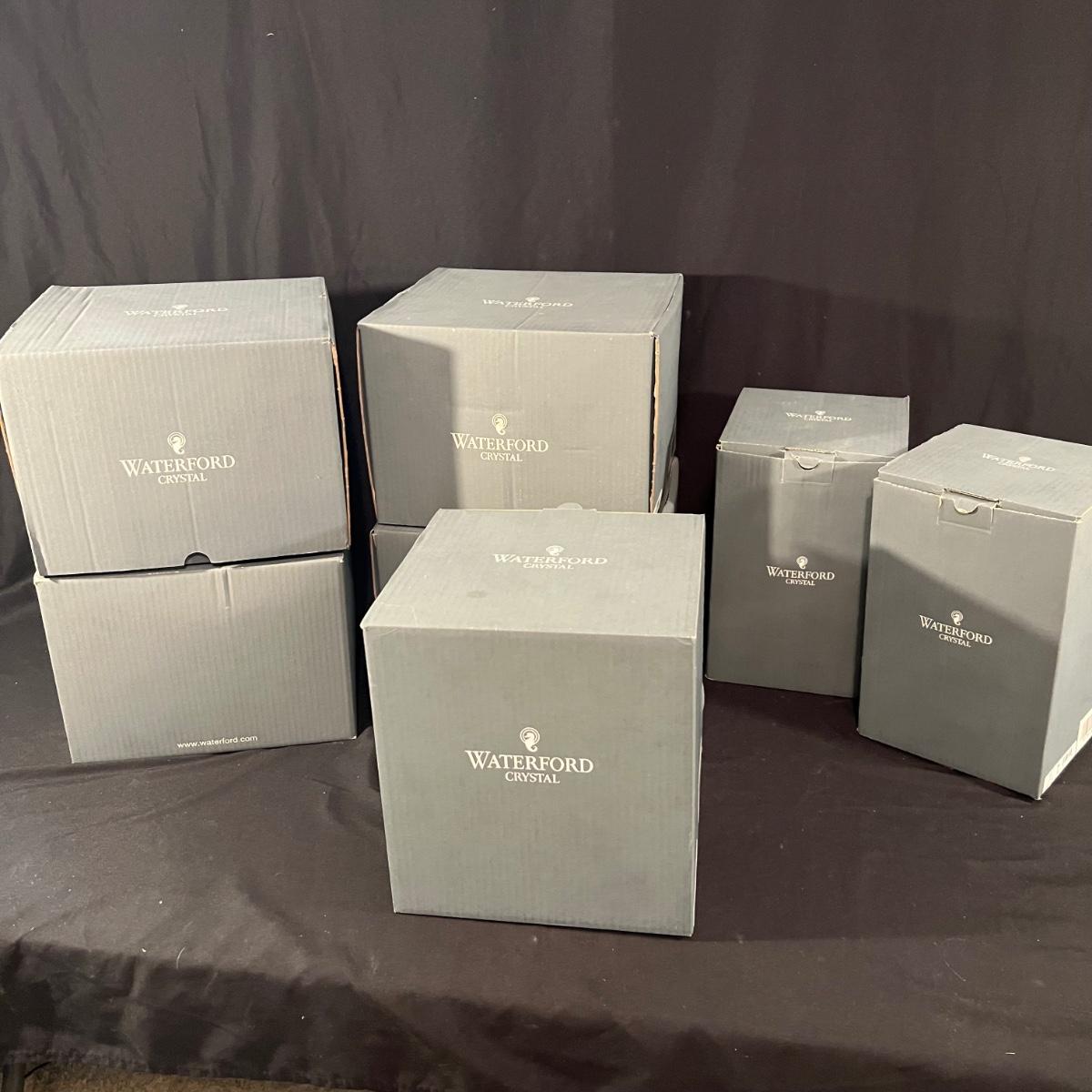 Seven large pieces of Waterford crystal here that all appear to be unopened except for us to photograph, therefore probably new in box. There are two matching Granville and two Honey bowls. See photos for full inventory and measurements listed on stickers. Shipping Available. Shipping can be costly. We suggest contacting our preferred local shipping provider, Postage Express, with dimensions and getting an estimate before bidding: 828-255-9250 or shipping@postageexpressnc.com
