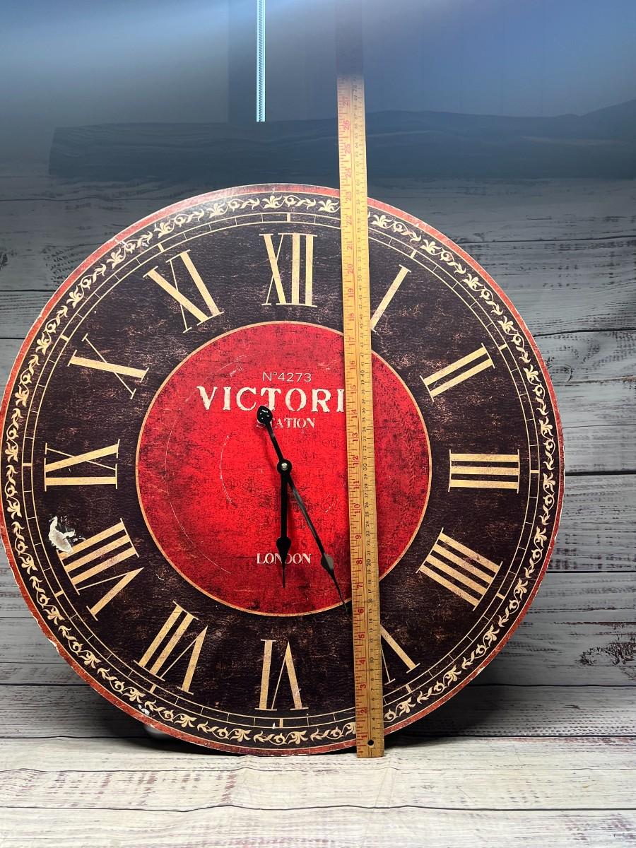 Large Victoria London Reproduction Station Clock Face, there is some chipping to the clock face and the clock hands are bent and do not work. Check pictures for more details and for sizing.