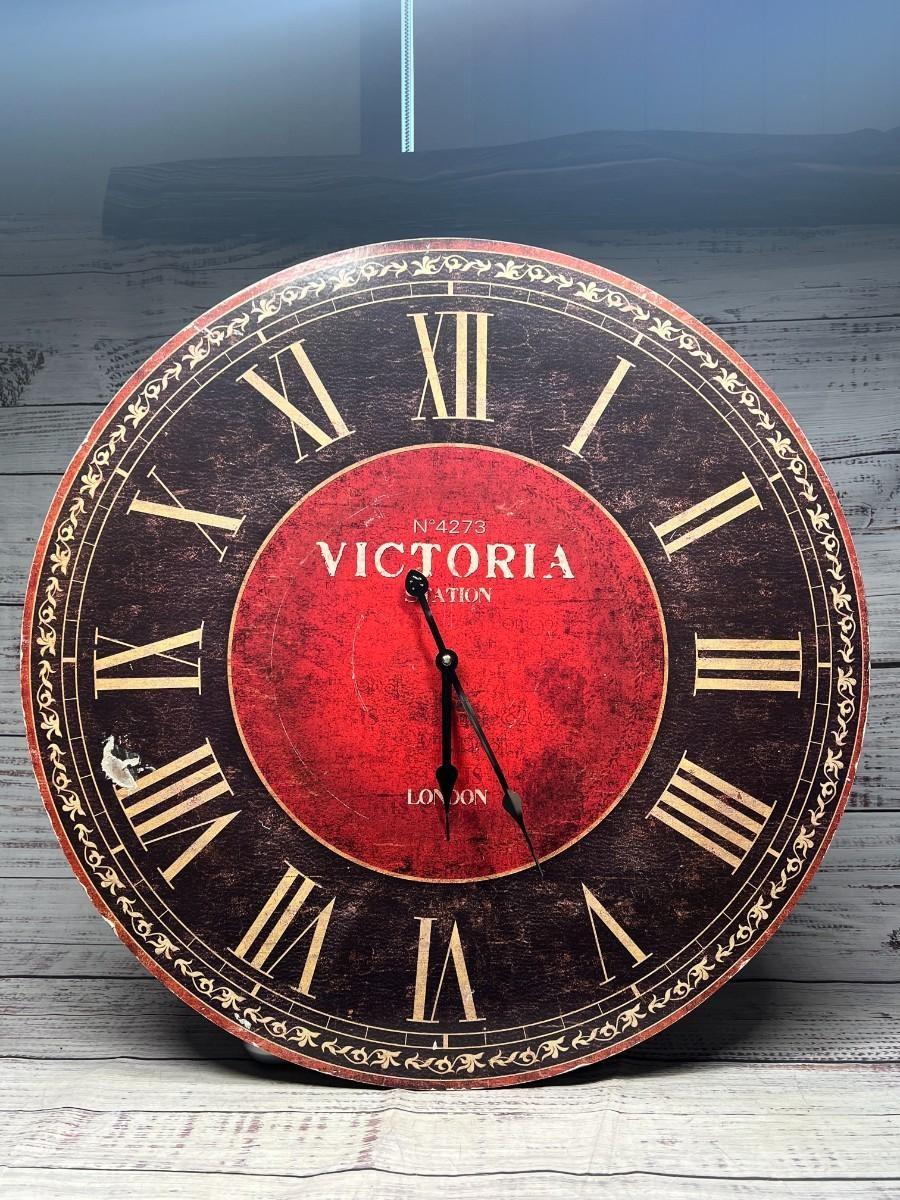 Large Victoria London Reproduction Station Clock Face, there is some chipping to the clock face and the clock hands are bent and do not work. Check pictures for more details and for sizing.