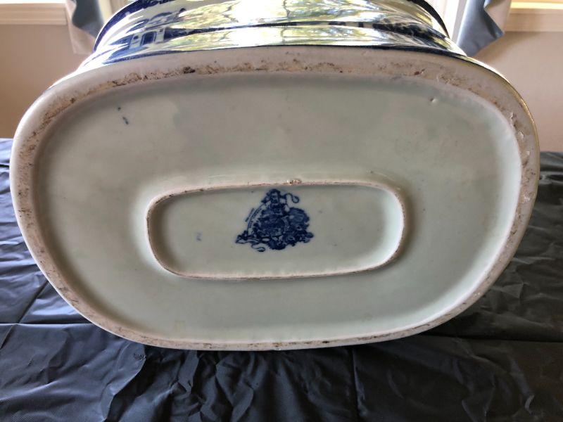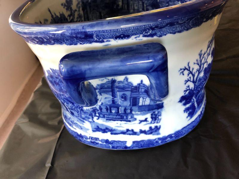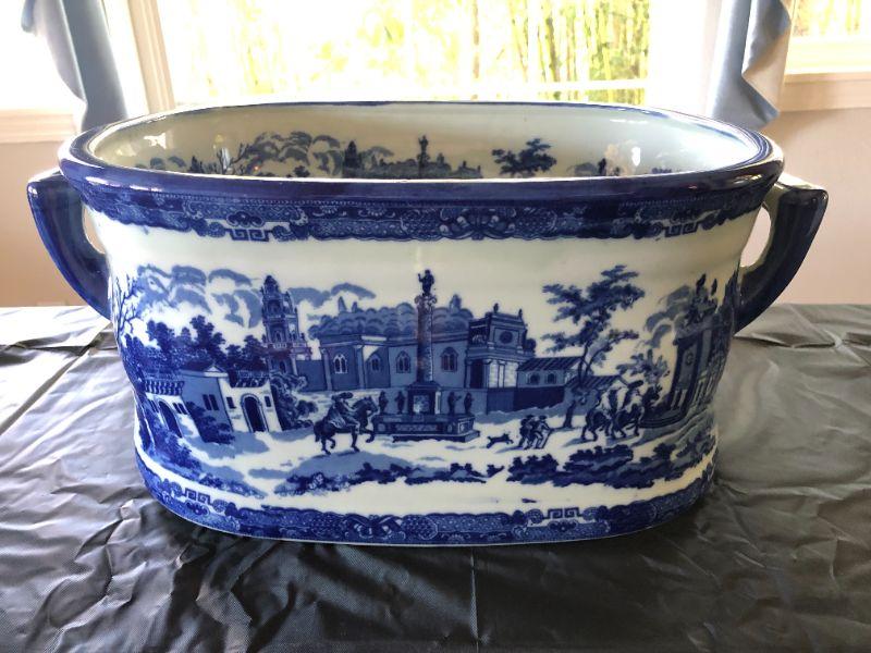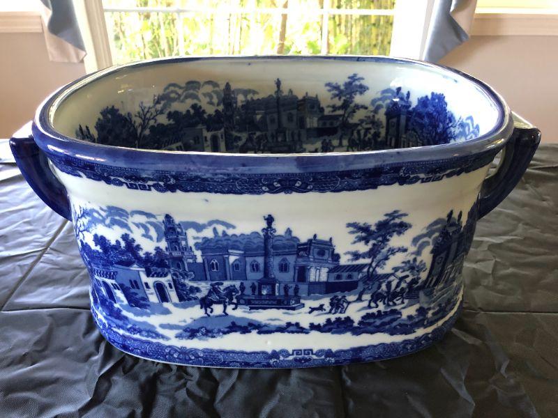 Beautiful antique Victoria Ware flow blue and white ironstone porcelain footbath or planter. In very good condition.