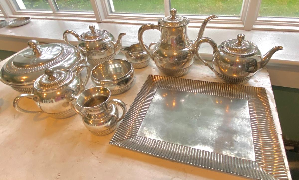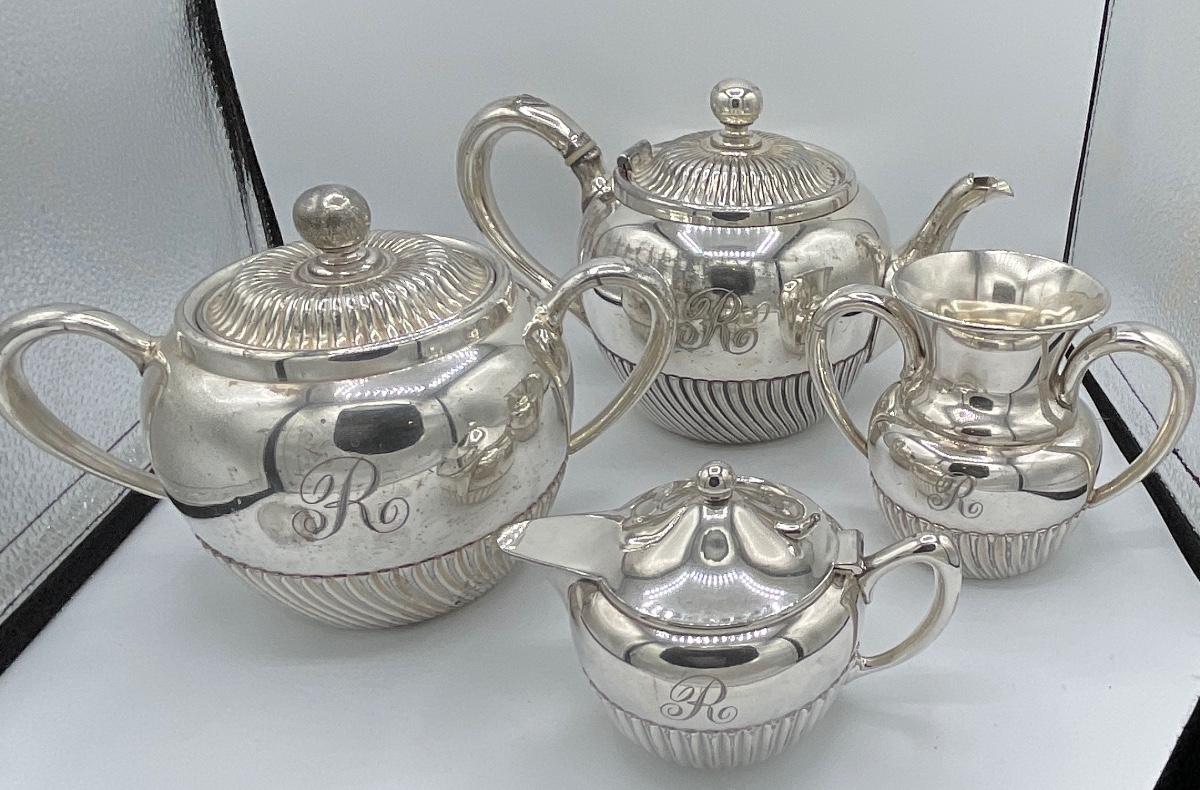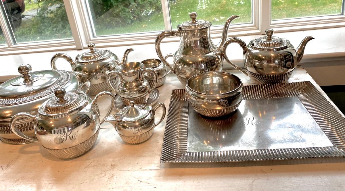 Lovely HUGE set of Victorian EPNS silver plated tableware by Wilcox Silver of Ct. Was owned by prominent Richardson family of Boston. Includes coffee pot w lid , TWO ball tea pots, handled vase, server with lid and glass insert , double handled waste bowl, sugar bowl, two creamers and large rectangular serving tray. With R monogram. Wear to plate as shown.
