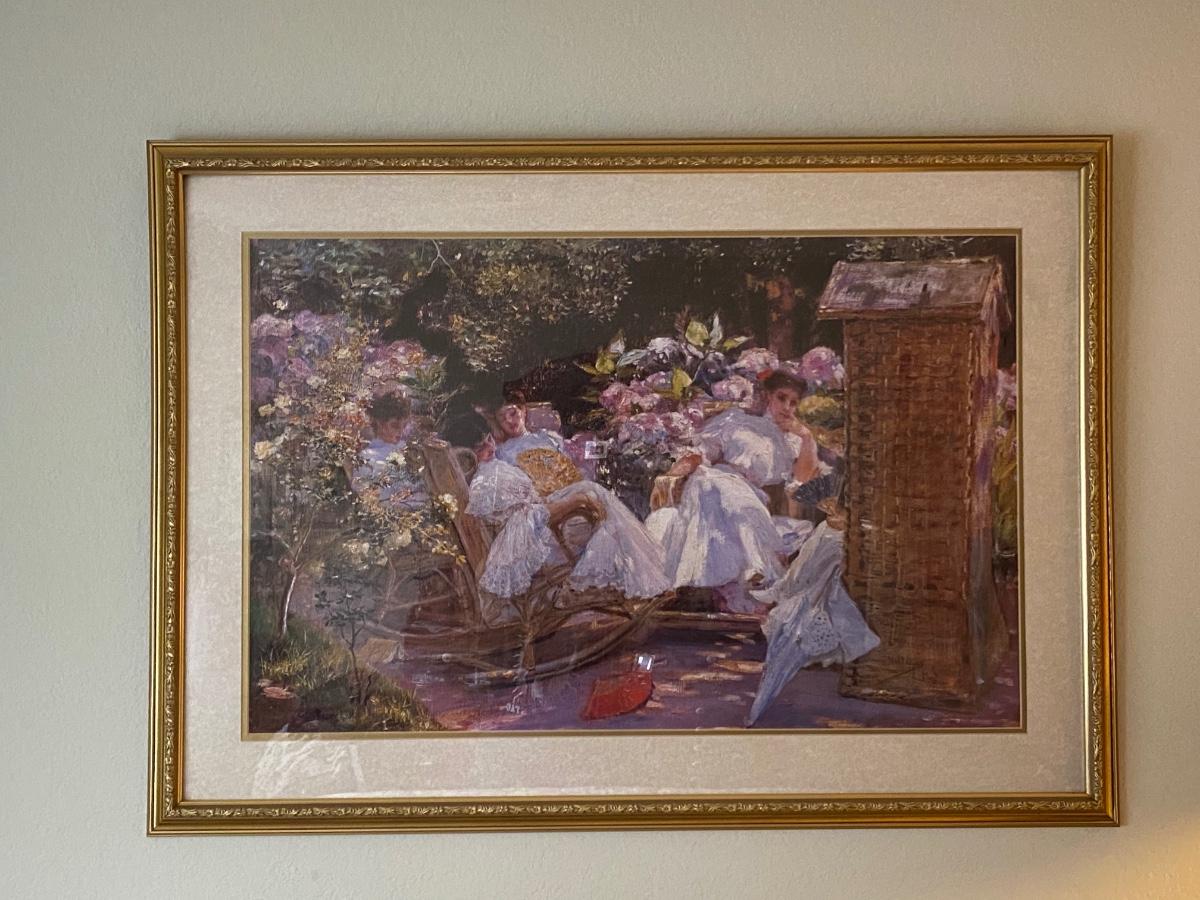 Large Victorian Framed Art Print Ladies in a Garden by Jose Villegas y Cordero. Nice gold tone frame. About 30"x40" size. **Currently off site in Brea, owner downsizing. Pick up will be after July 14th, we will schedule with winning bidders after that date.**