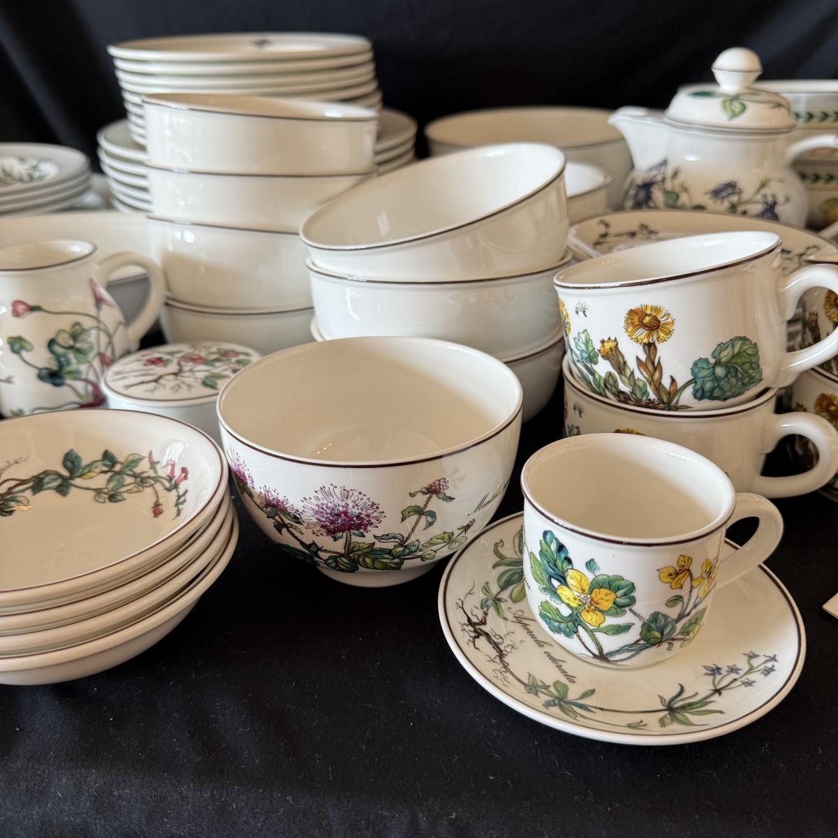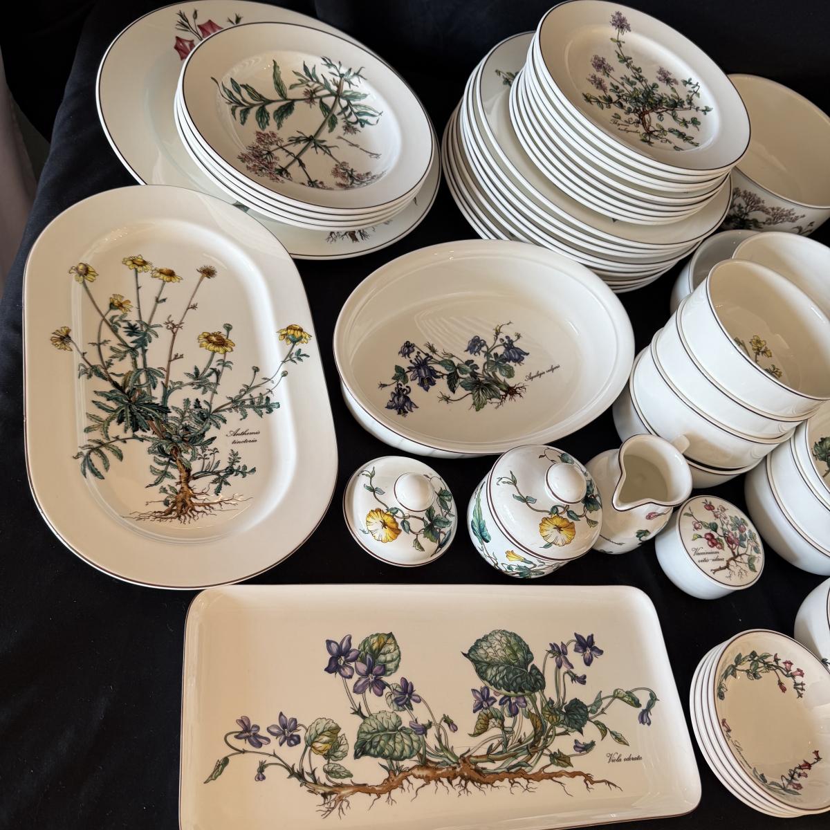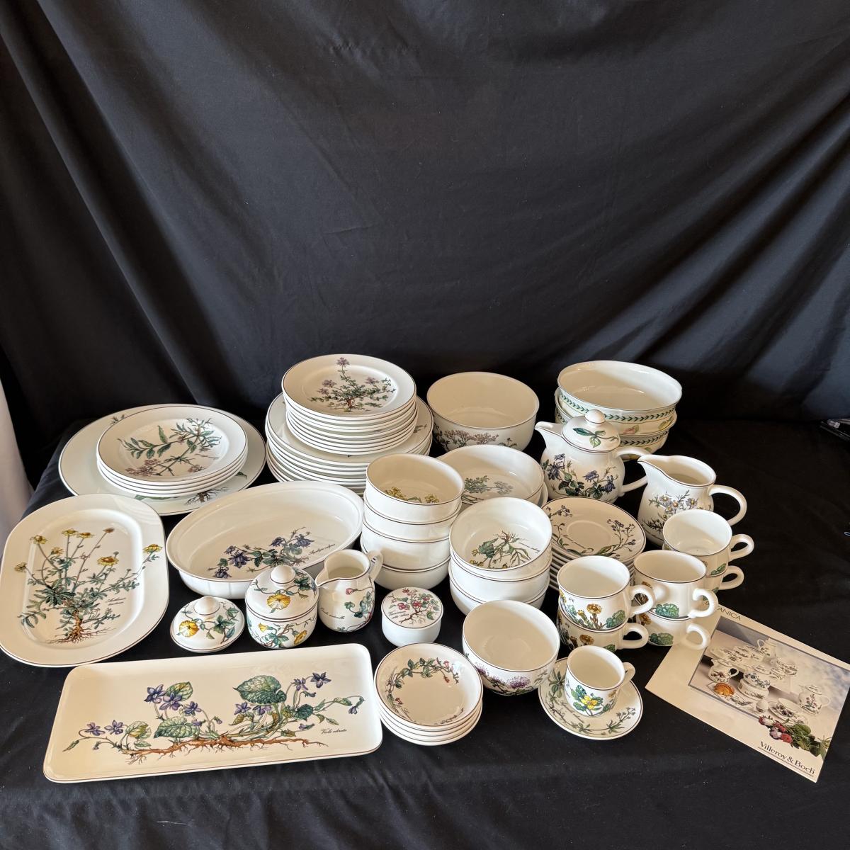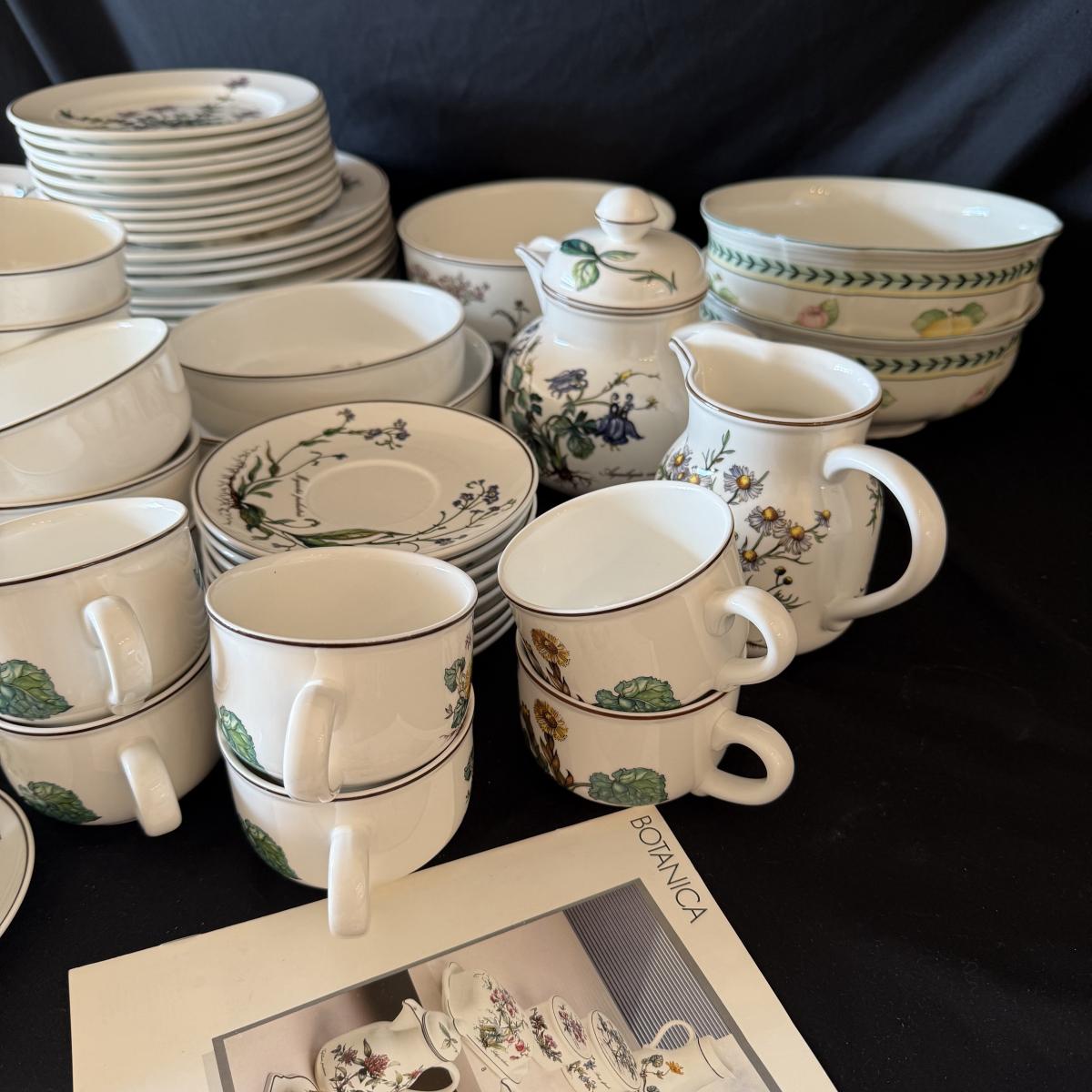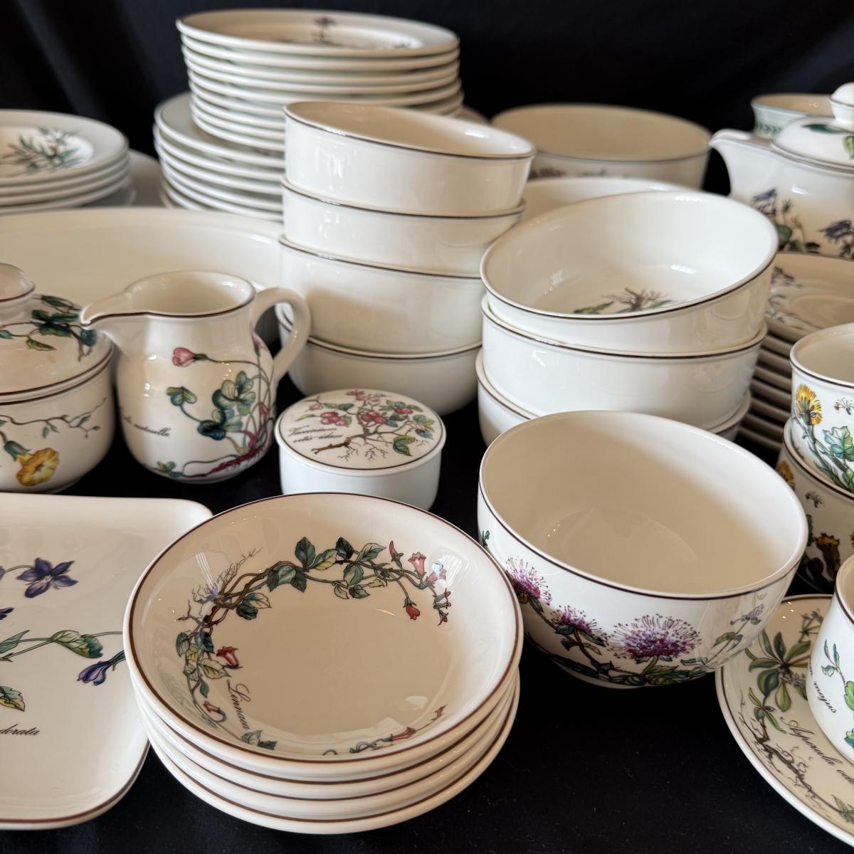 Large set of Villeroy & Boch ‘Botanica’ dishes includes over 60 pieces! Set includes a variety of plates, bowls, serving dishes, teacups, and more. One extra lid for the sugar bowl is included. For a size reference, the rectangular Viola Adorata dish seen at the bottom of the picture that includes the total lot inventory (picture #2), the dish measures 13.25” x 6.25”. Please see photos for inventory.