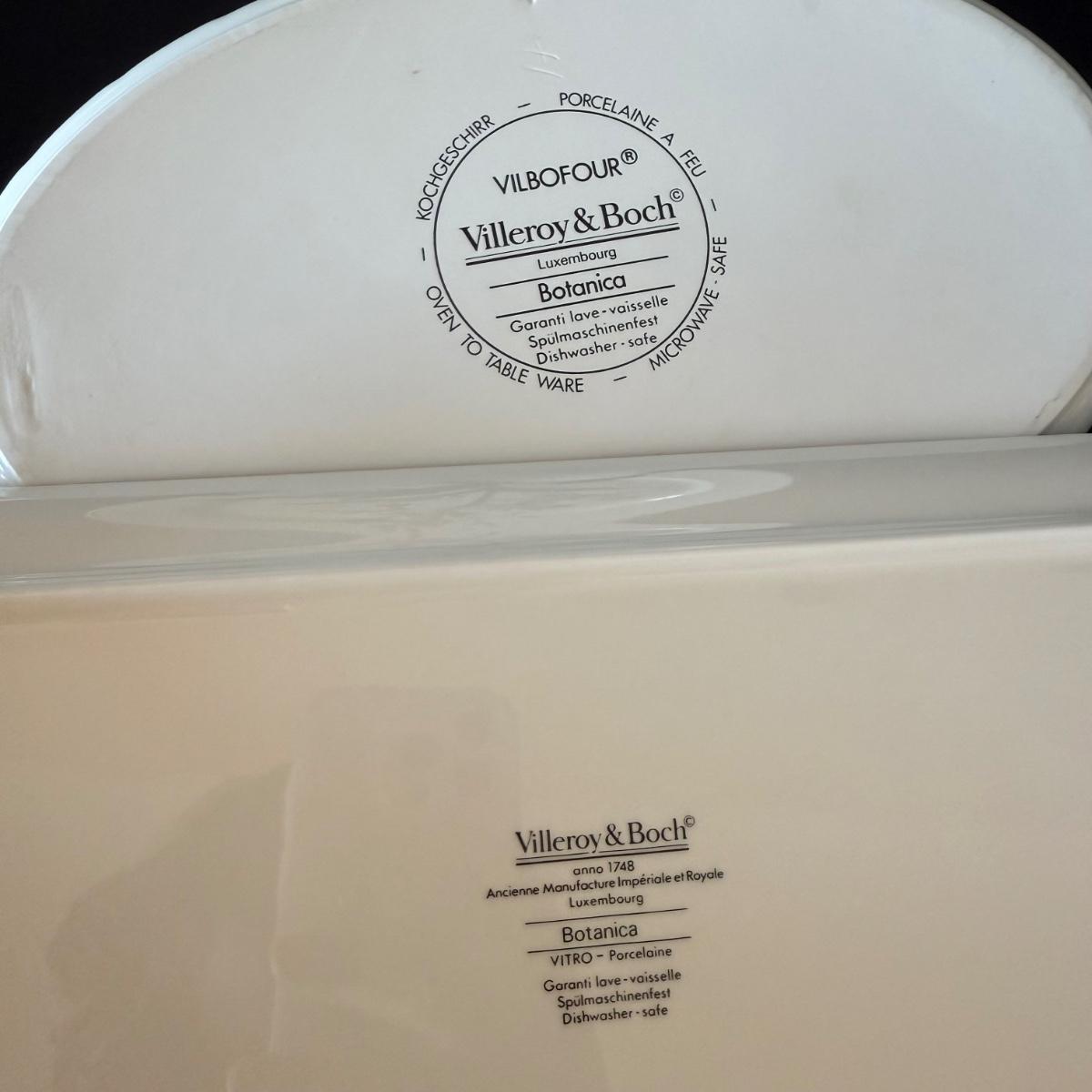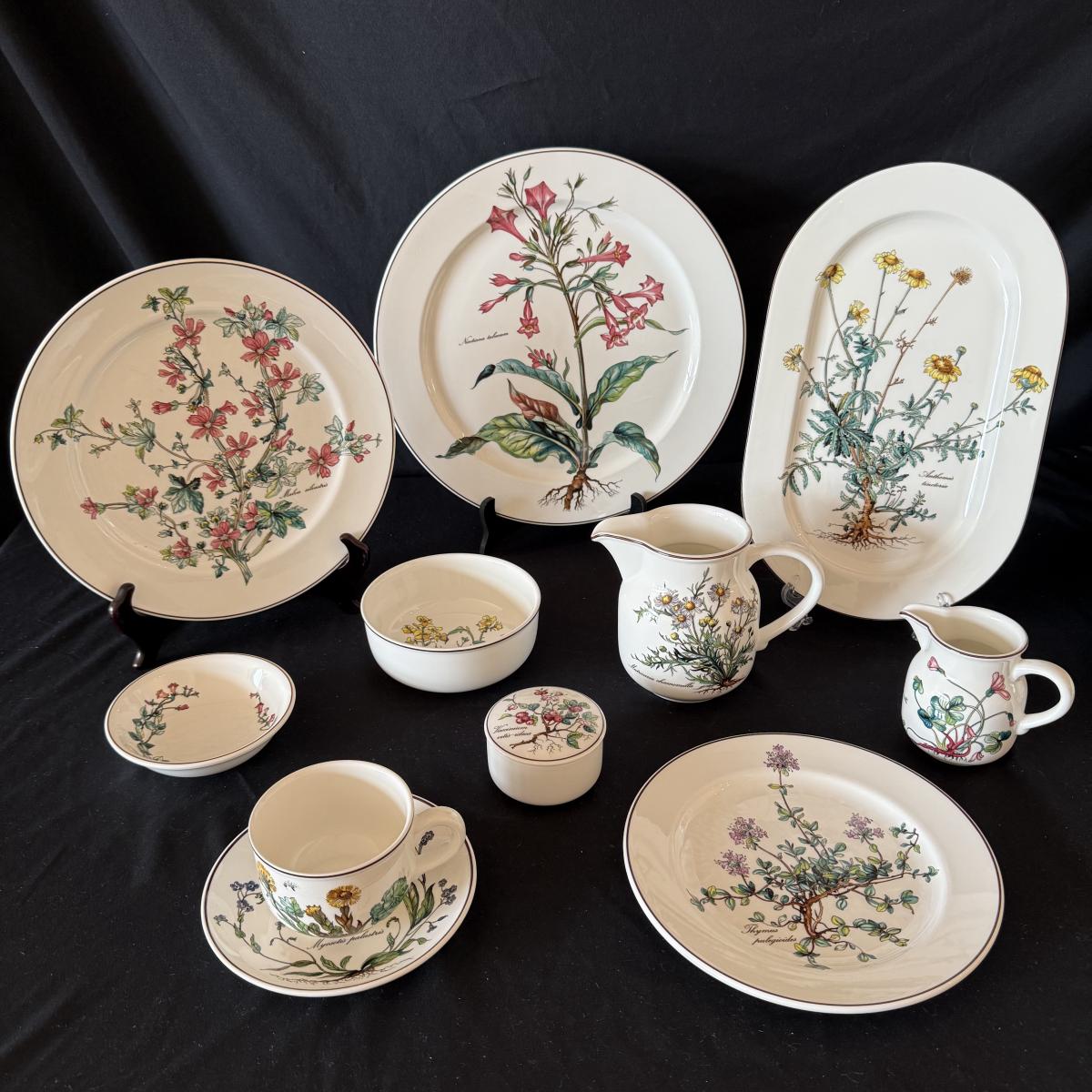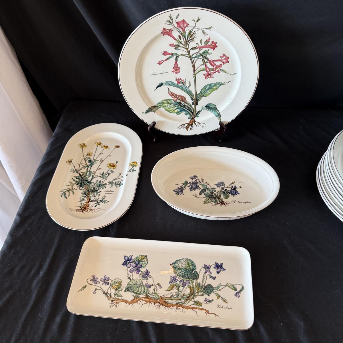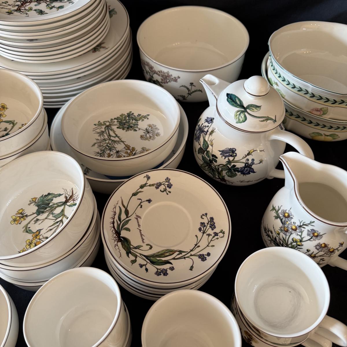 Large set of Villeroy & Boch ‘Botanica’ dishes includes over 60 pieces! Set includes a variety of plates, bowls, serving dishes, teacups, and more. One extra lid for the sugar bowl is included. For a size reference, the rectangular Viola Adorata dish seen at the bottom of the picture that includes the total lot inventory (picture #2), the dish measures 13.25” x 6.25”. Please see photos for inventory.