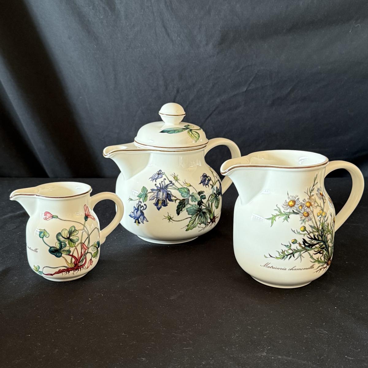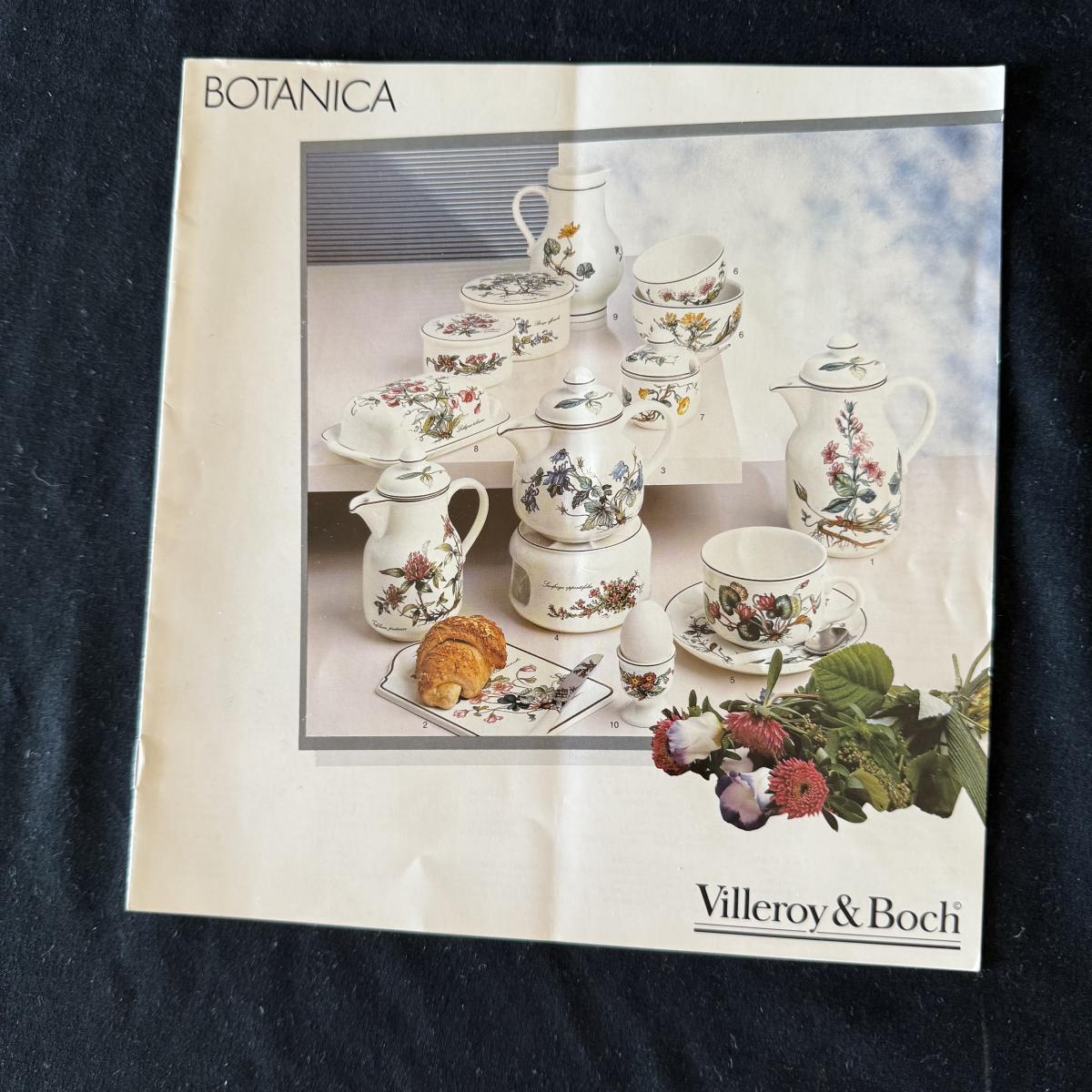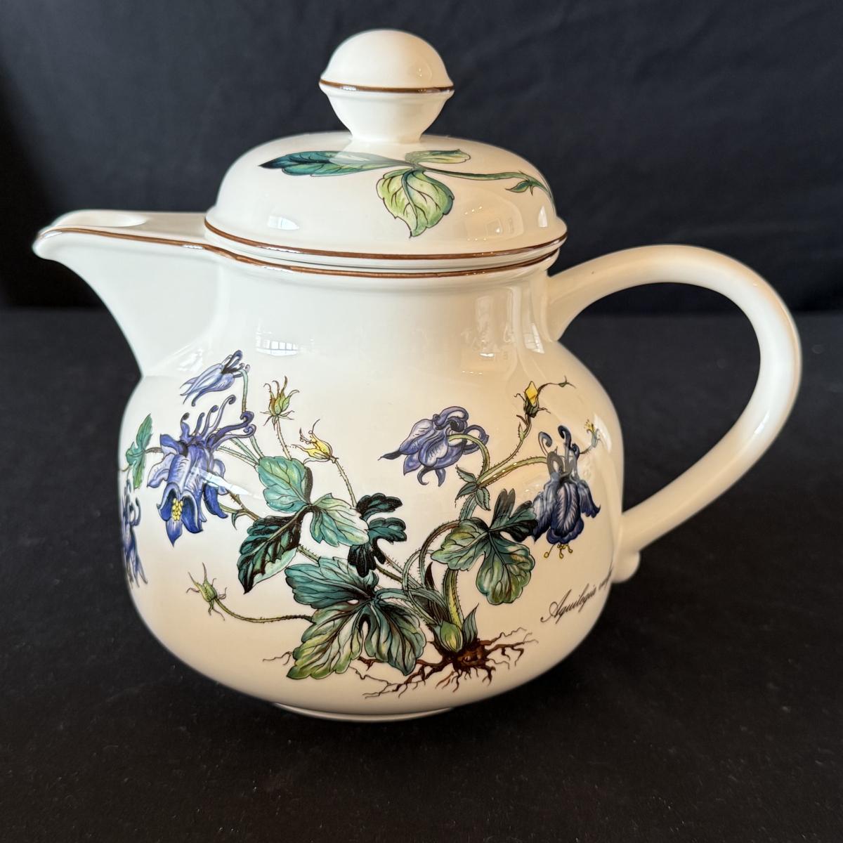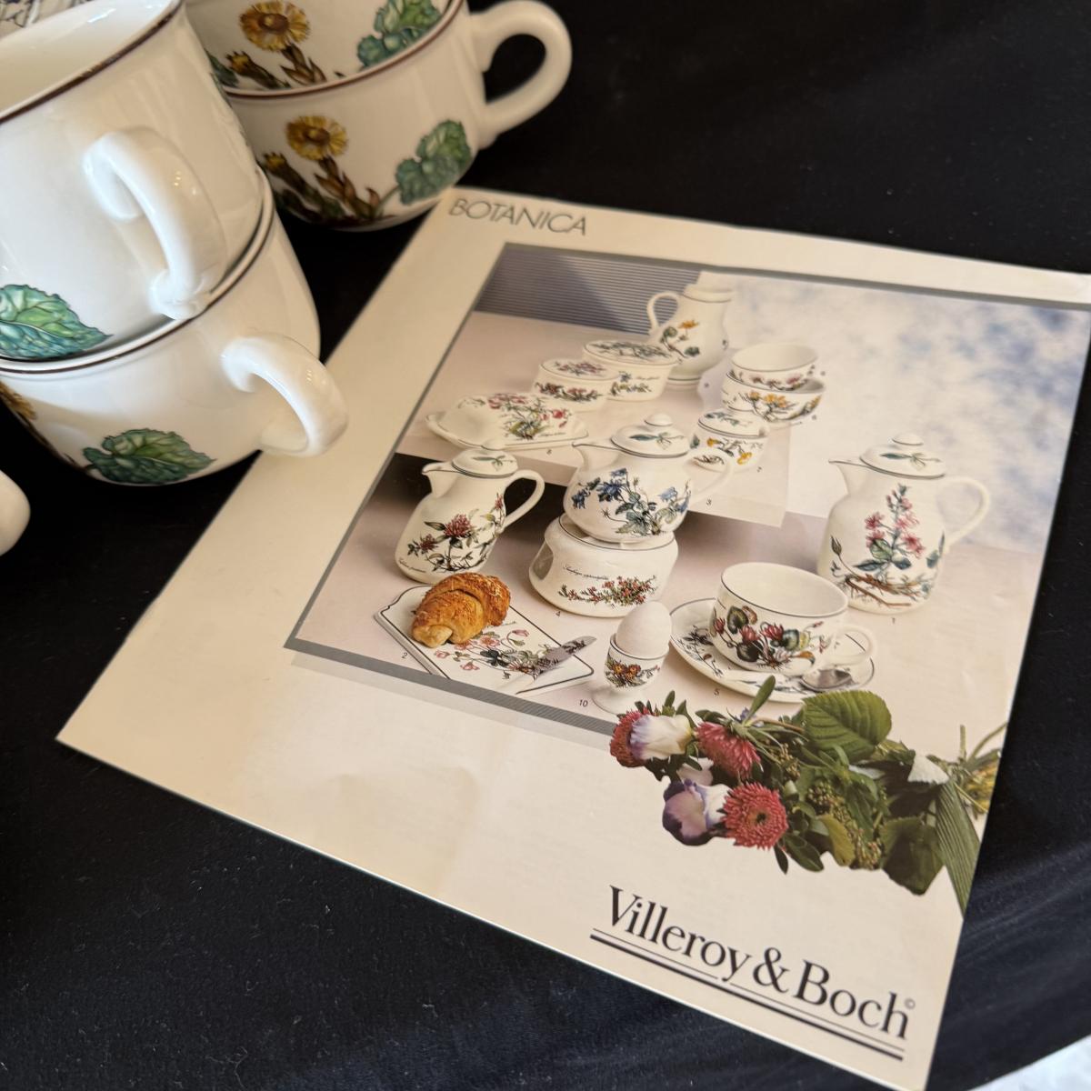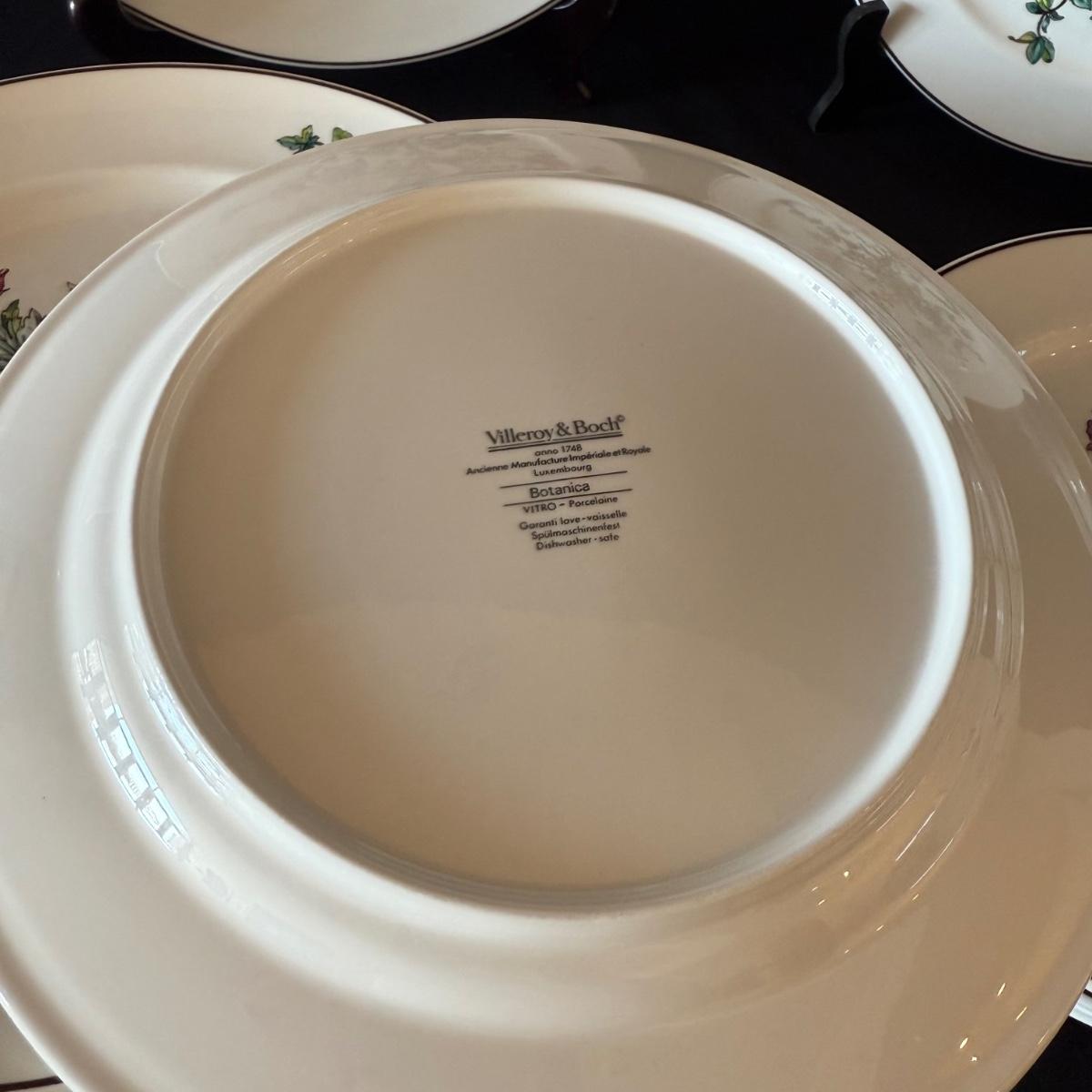 Large set of Villeroy & Boch ‘Botanica’ dishes includes over 60 pieces! Set includes a variety of plates, bowls, serving dishes, teacups, and more. One extra lid for the sugar bowl is included. For a size reference, the rectangular Viola Adorata dish seen at the bottom of the picture that includes the total lot inventory (picture #2), the dish measures 13.25” x 6.25”. Please see photos for inventory.