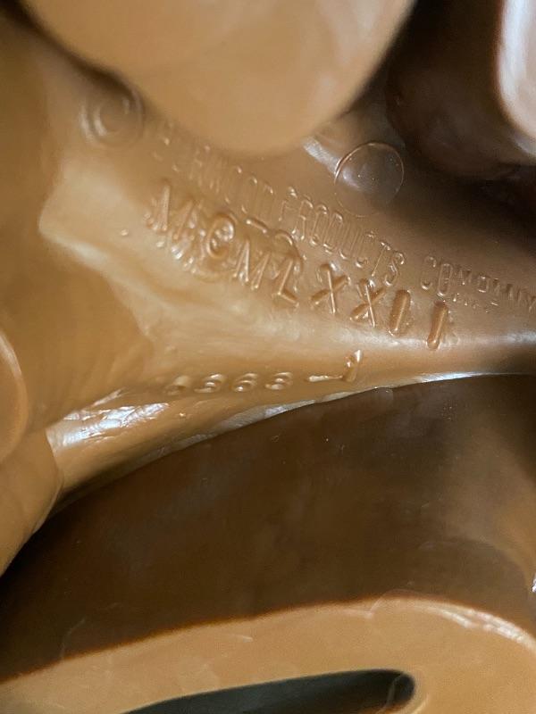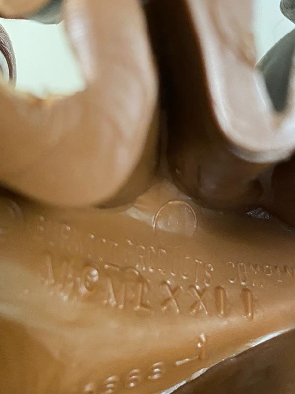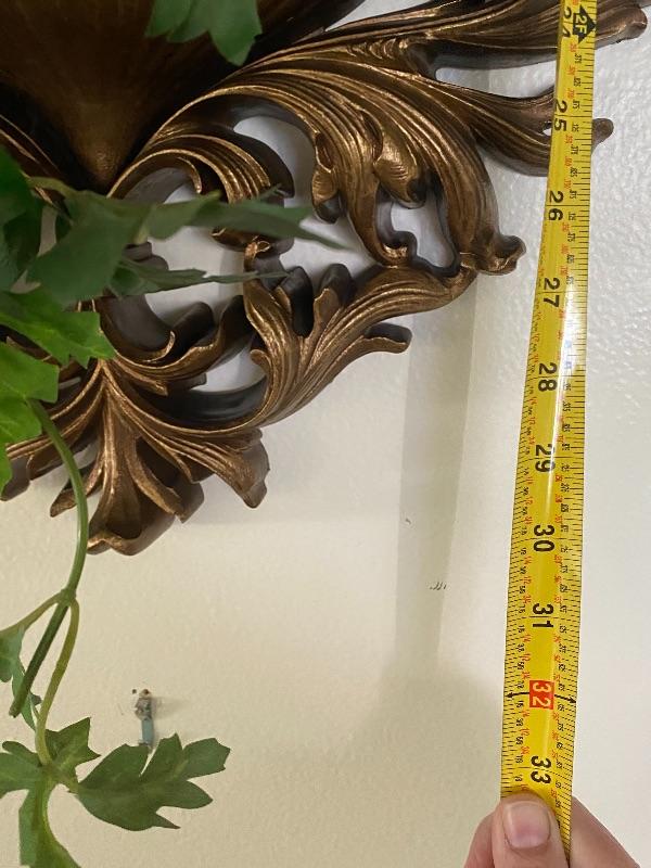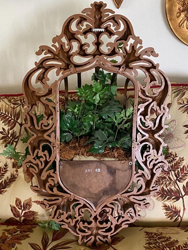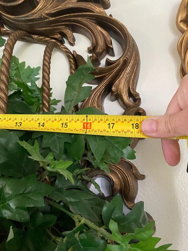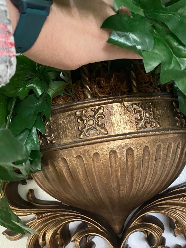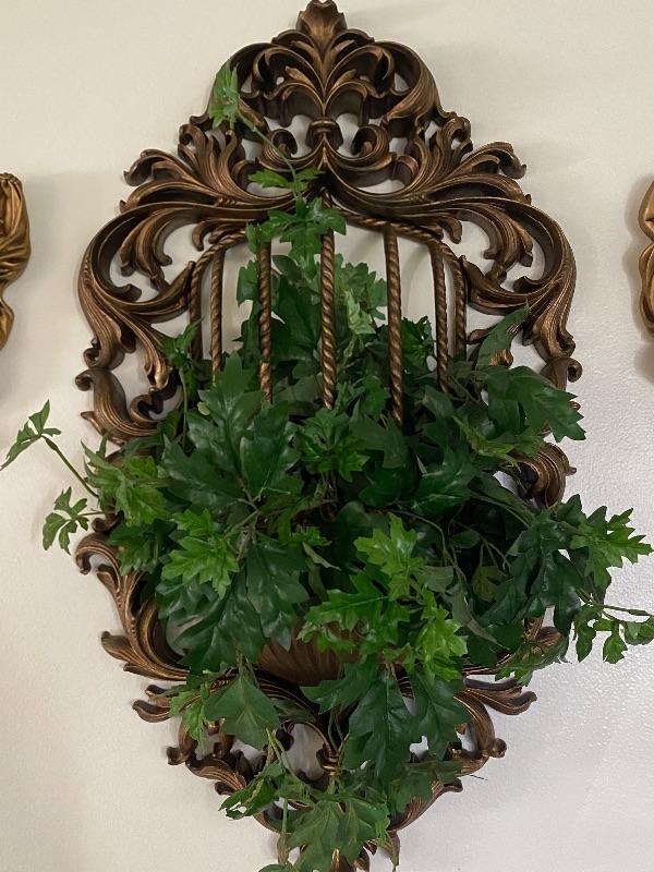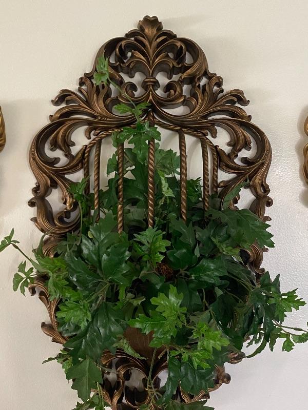 Vintage Burwood Products Co. wall hanging planter cage. Mid Century regency style. Made of plastic, in a dark gold bronze color. Has artificial greenery added. About 30" length. Dated 1972.