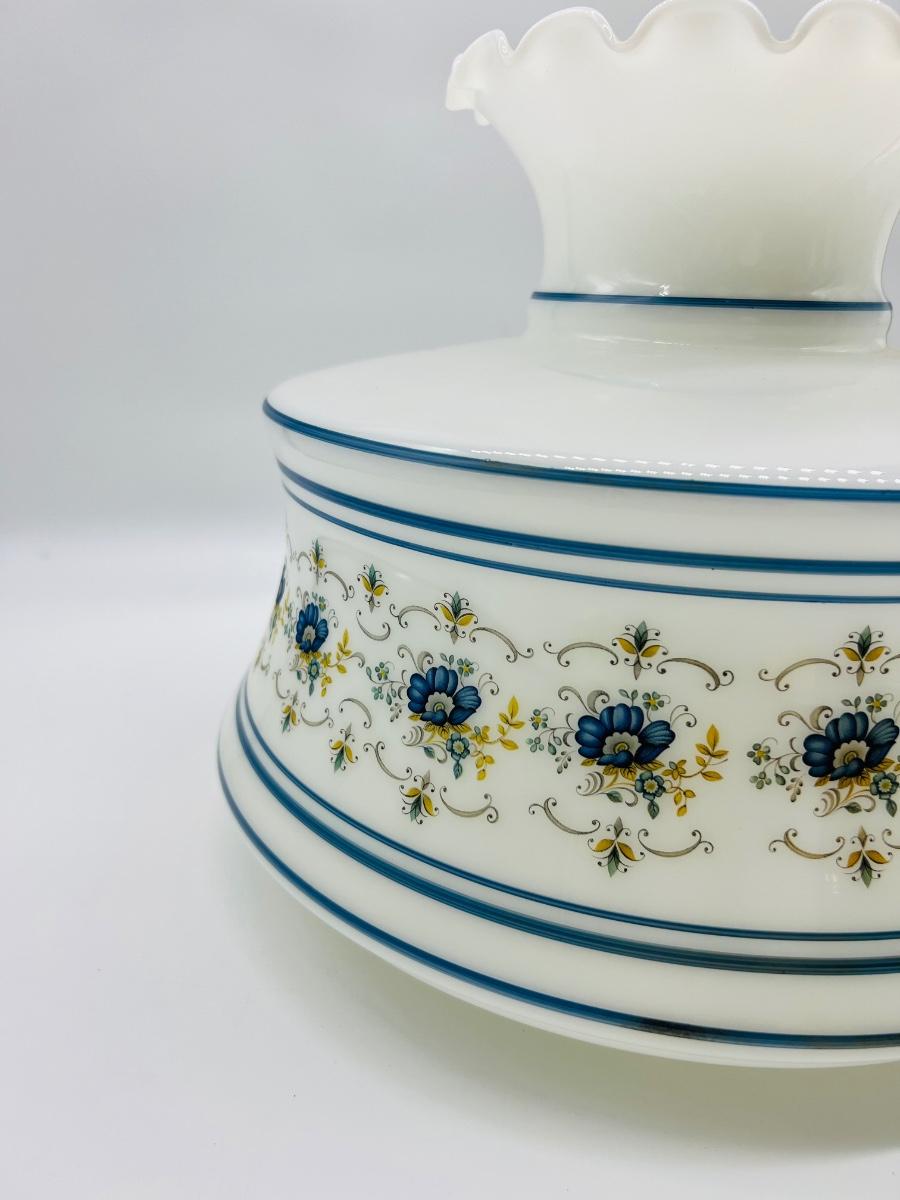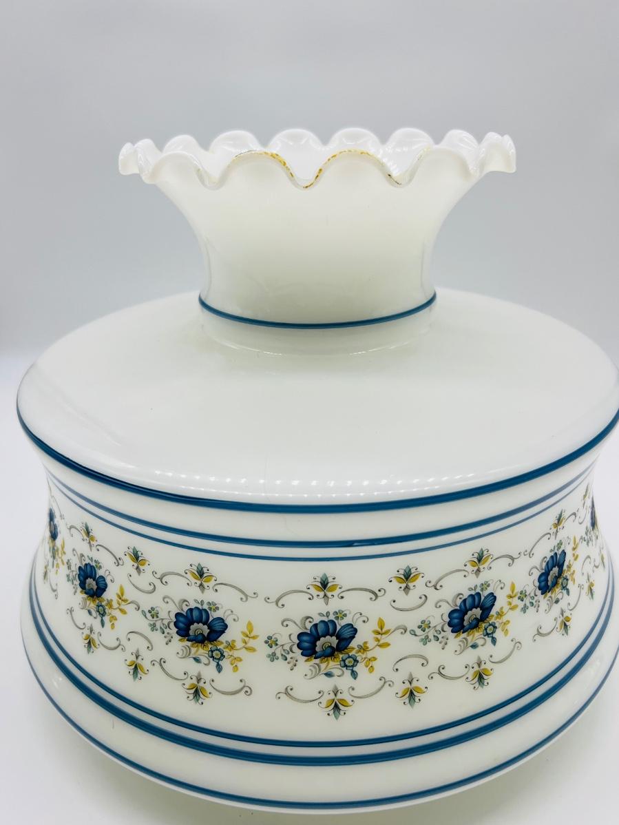 Large Vintage Abigail Adams Quoizel Milk Glass Blue Floral GLOBE ONLY! Measures 11 inches tall and 14 inches wide.