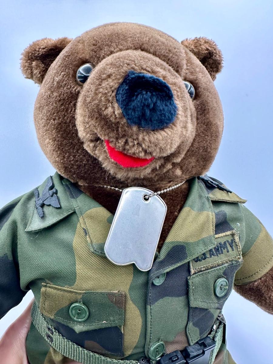 Vintage Army Bear Forces of America 1989 Ira Green 20”. Features jacket with US ARMY patch, lapel pins, dog tags, pants, belt and boots.