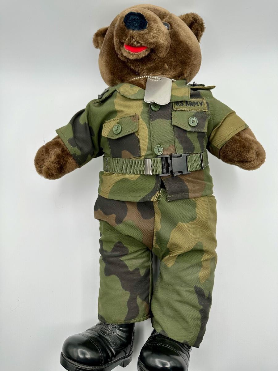 Vintage Army Bear Forces of America 1989 Ira Green 20”. Features jacket with US ARMY patch, lapel pins, dog tags, pants, belt and boots.