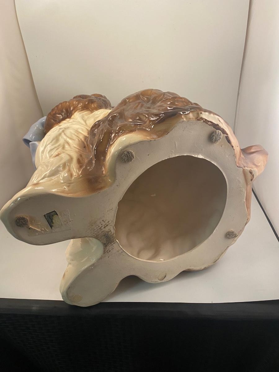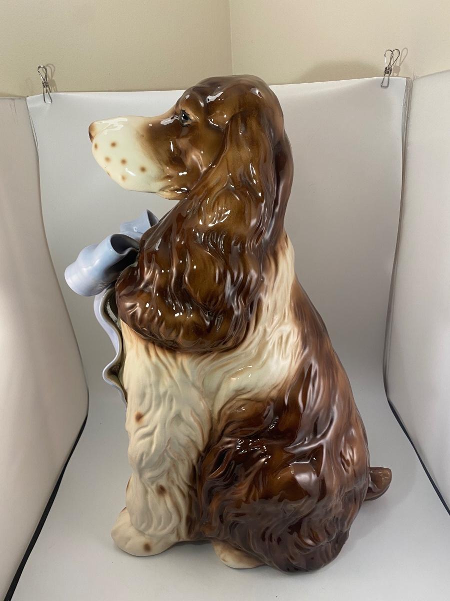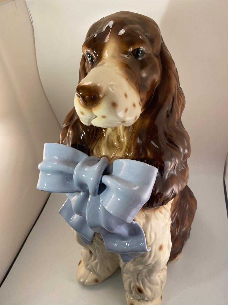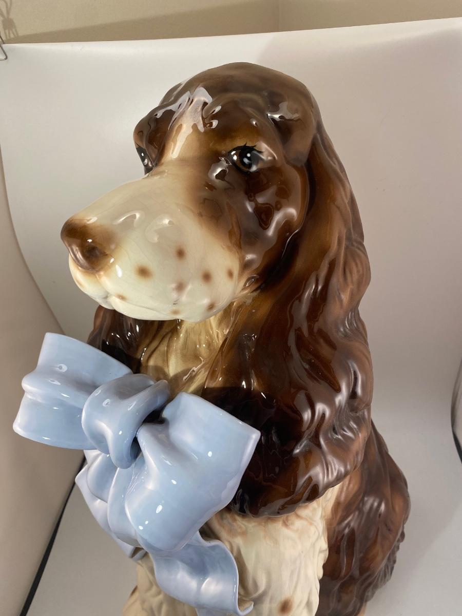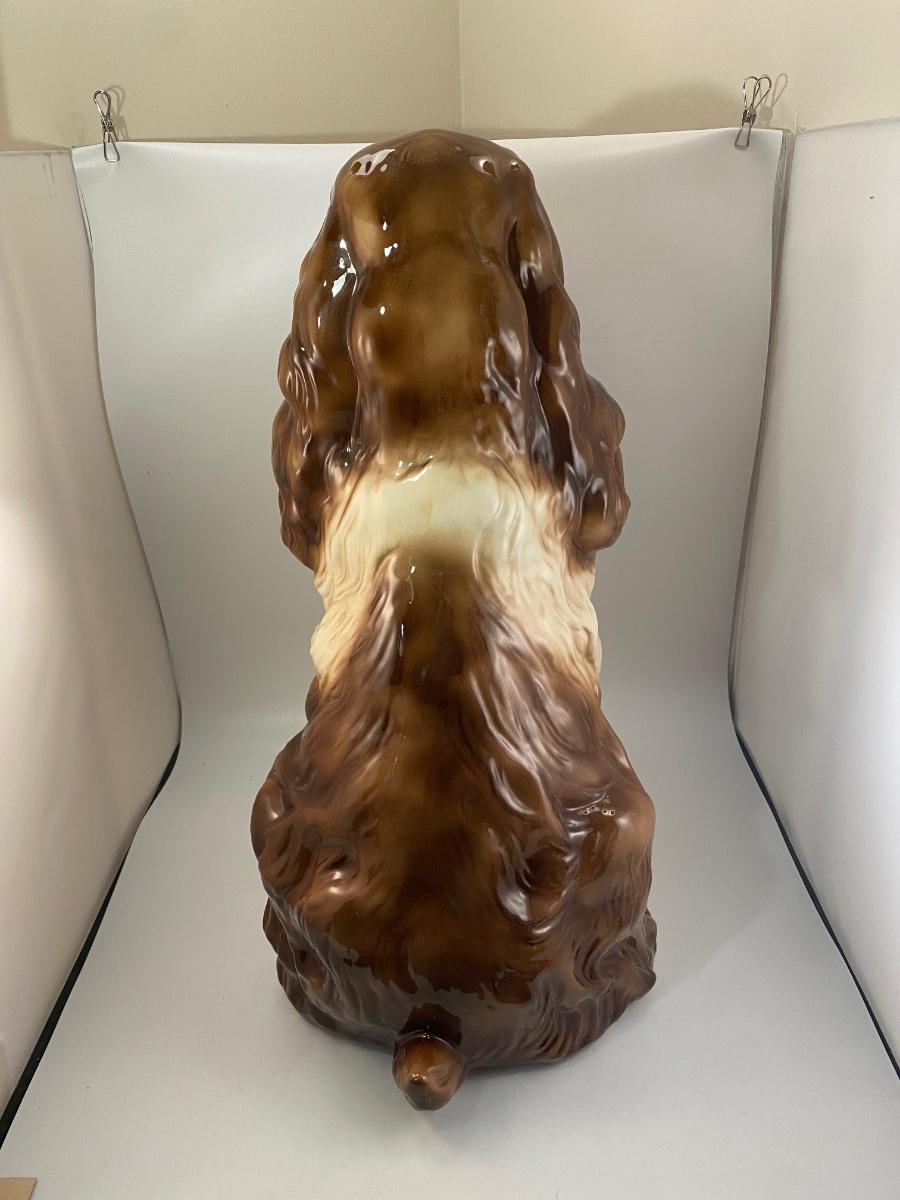 This dog reminds me of "Nanny Dog" from Disney's Peter Pan. This vintage life-size BetLar Inc ceramic Springer Spaniel dog is wearing pale blue bow around his neck. It is about 24" tall and in good vintage condition. There is crazing as expected with aged ceramics. There are some spots along the bows edge that aren't glazed, unsure if they are flaws or small nicks to glaze, not sharp like chipped ceramic. No other damage or flaws noticed.