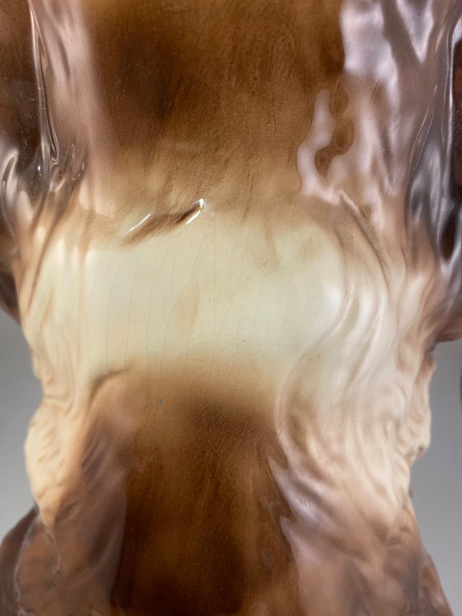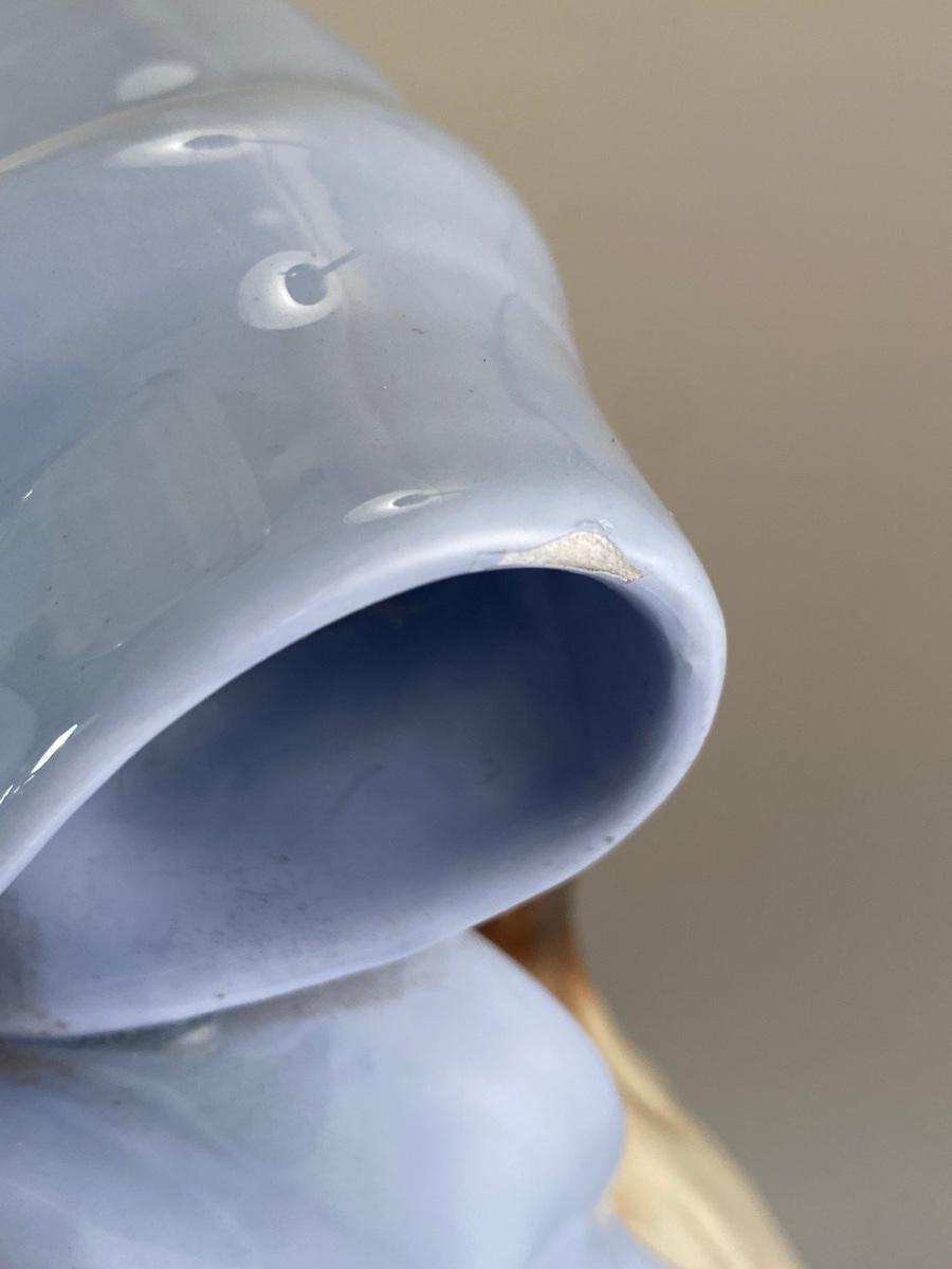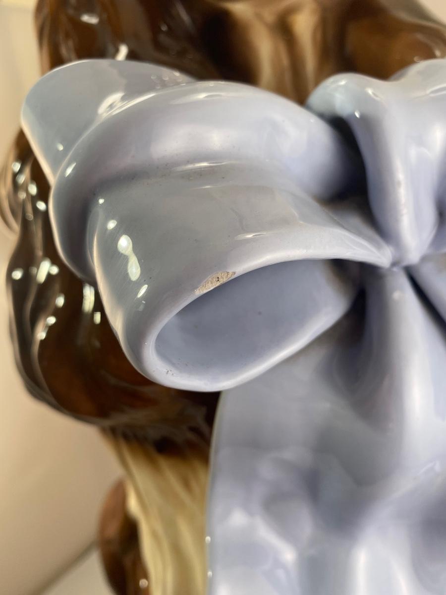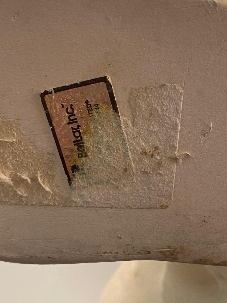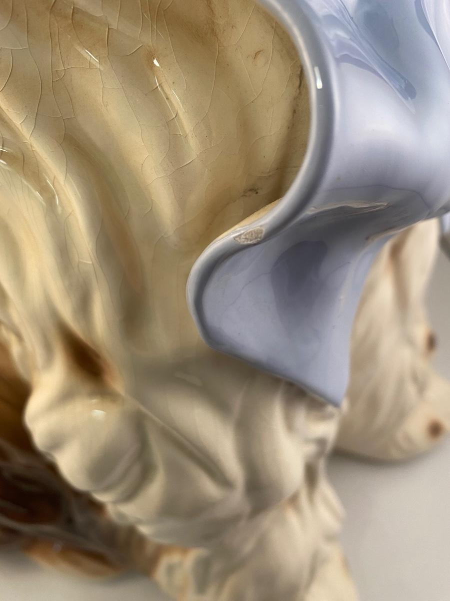 This dog reminds me of "Nanny Dog" from Disney's Peter Pan. This vintage life-size BetLar Inc ceramic Springer Spaniel dog is wearing pale blue bow around his neck. It is about 24" tall and in good vintage condition. There is crazing as expected with aged ceramics. There are some spots along the bows edge that aren't glazed, unsure if they are flaws or small nicks to glaze, not sharp like chipped ceramic. No other damage or flaws noticed.