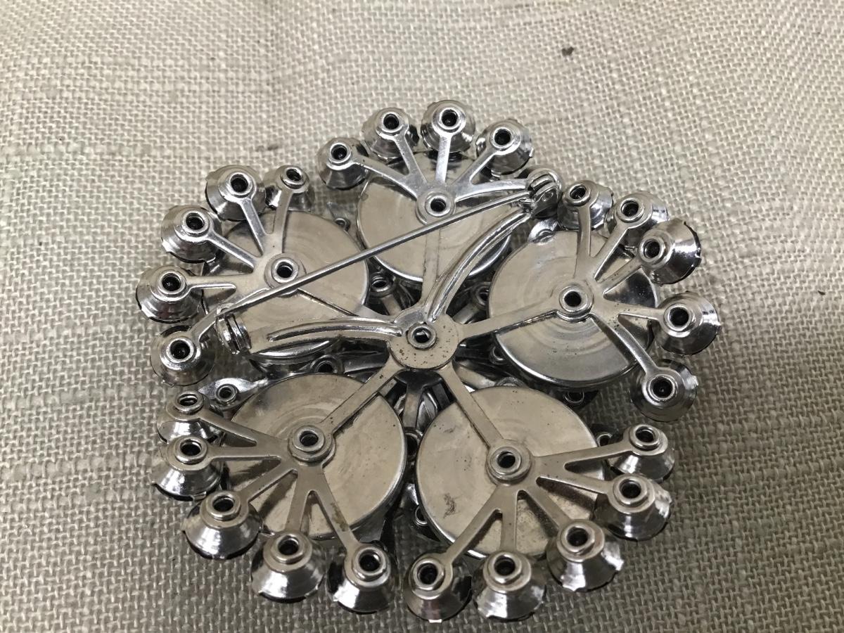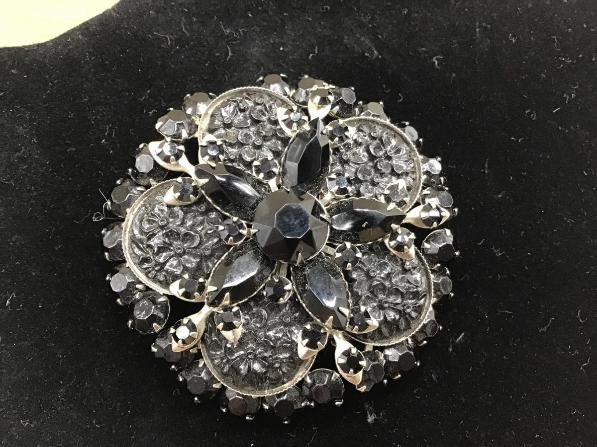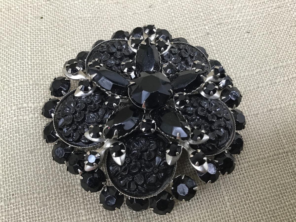 Large Vintage Black Celluloid and Glass Brooch