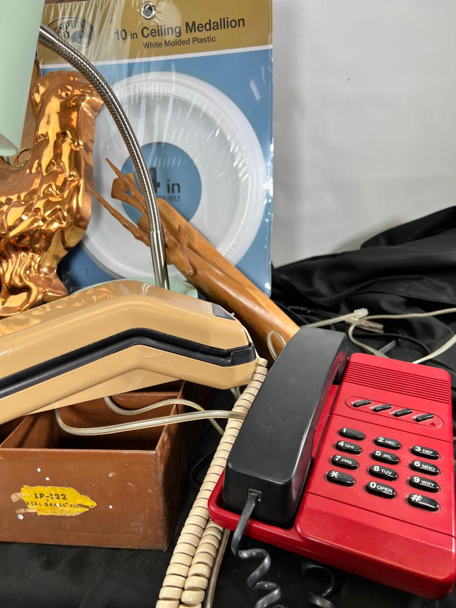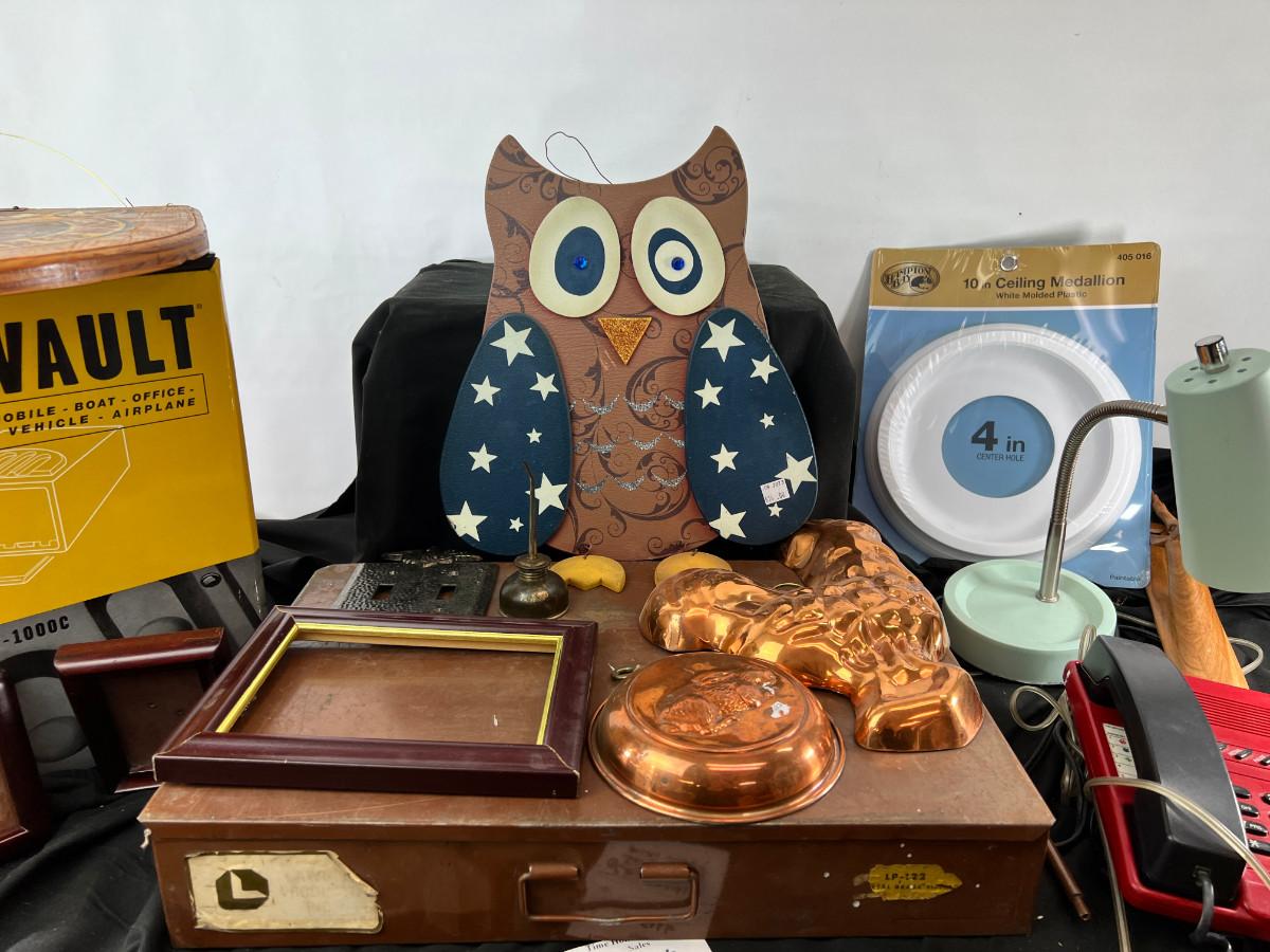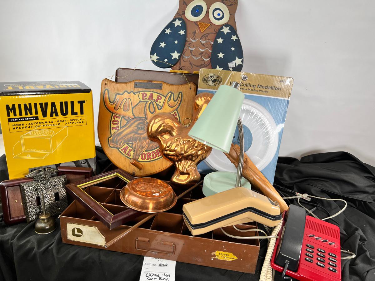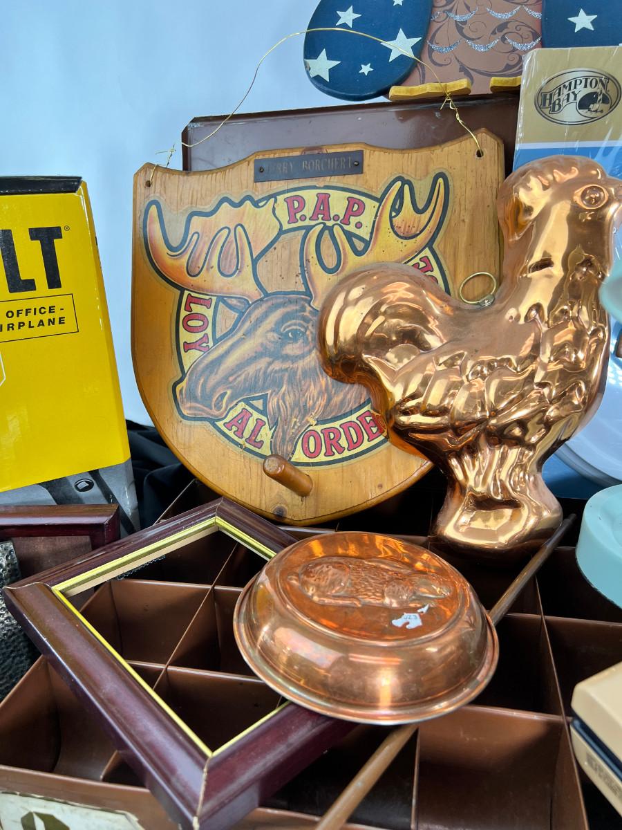 Vintage telephones, copper molds, Moose lode plaque. Small oil can, Ceiling medallions.