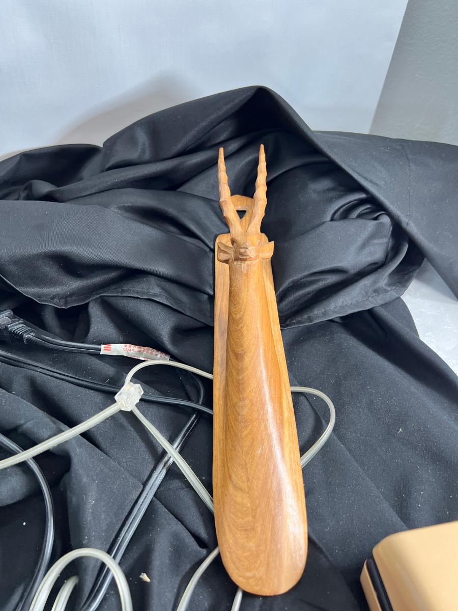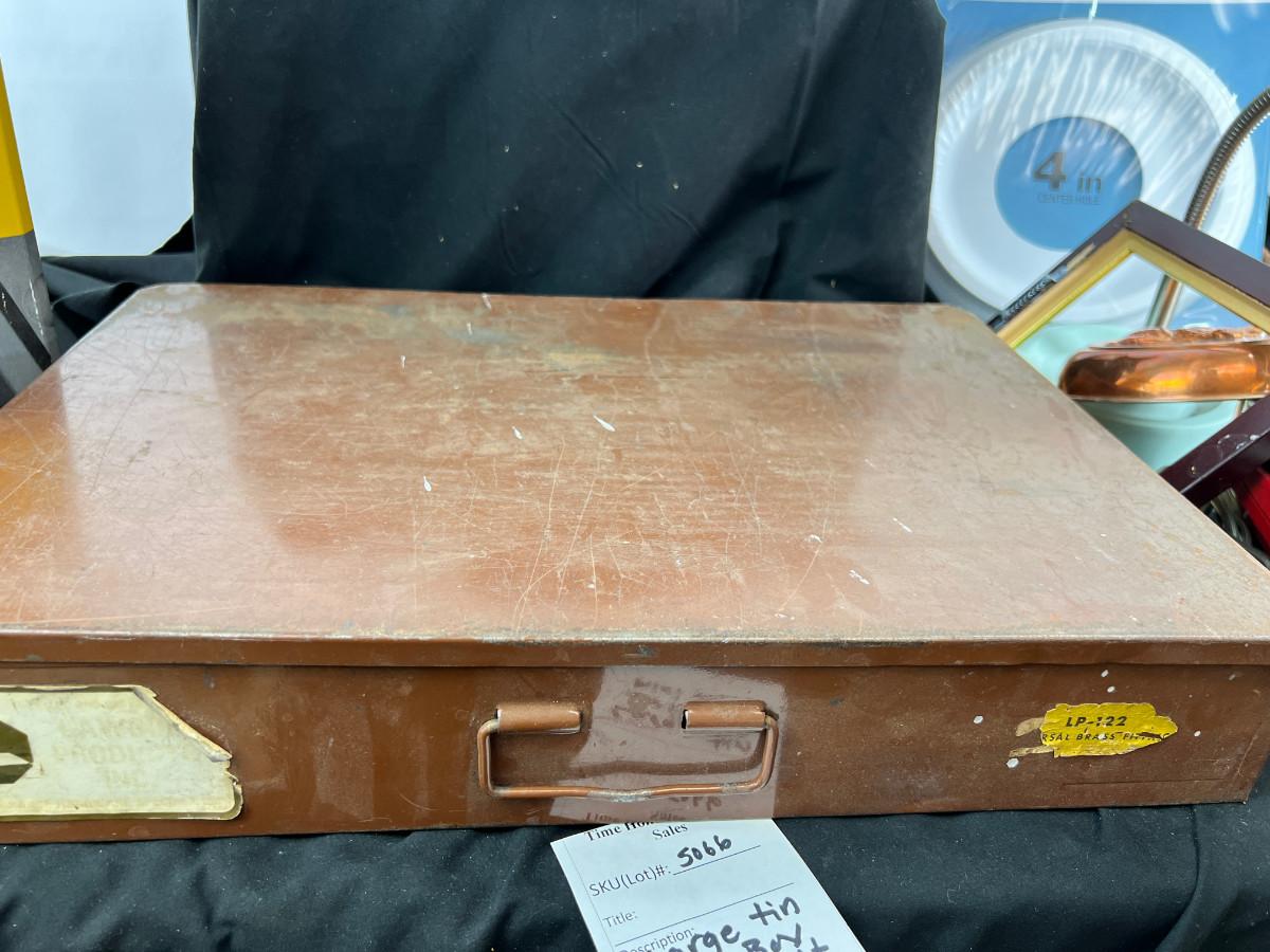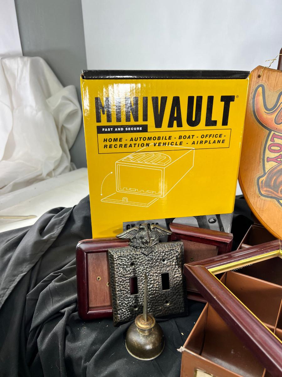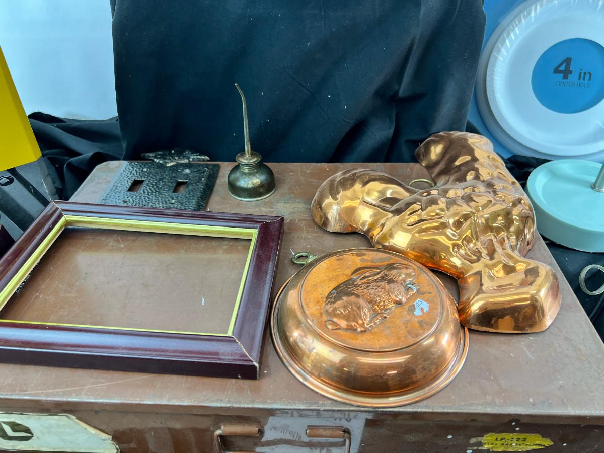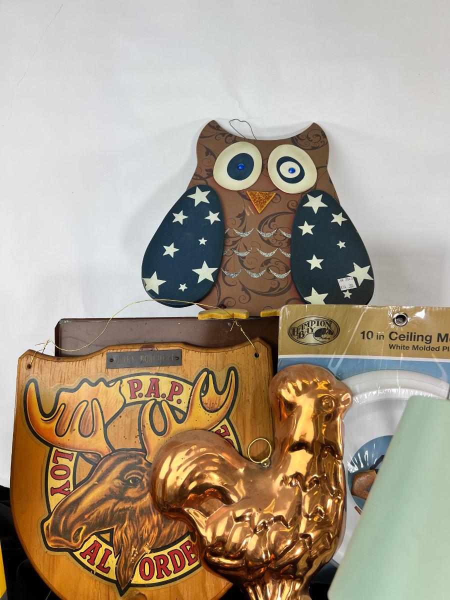 Vintage telephones, copper molds, Moose lode plaque. Small oil can, Ceiling medallions.