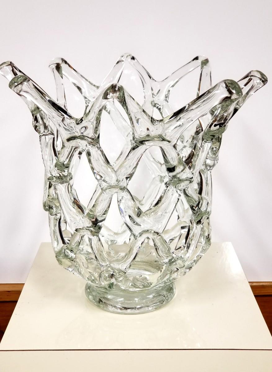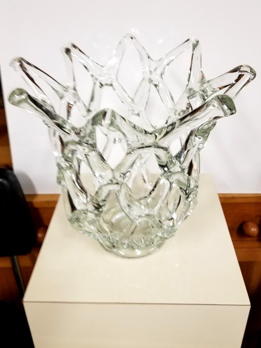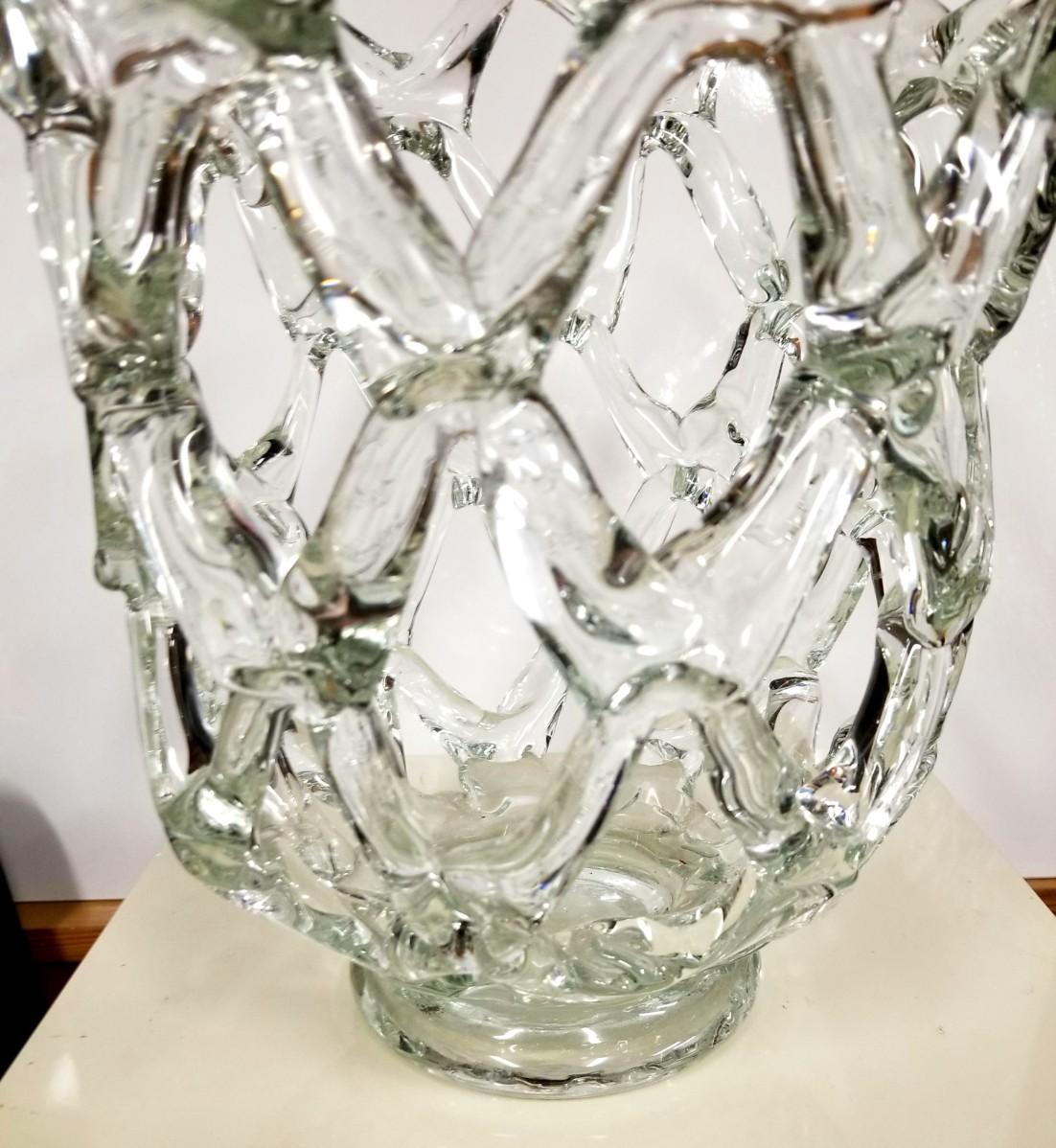 Large Vintage brutalist glass vase with rare basket-weave design