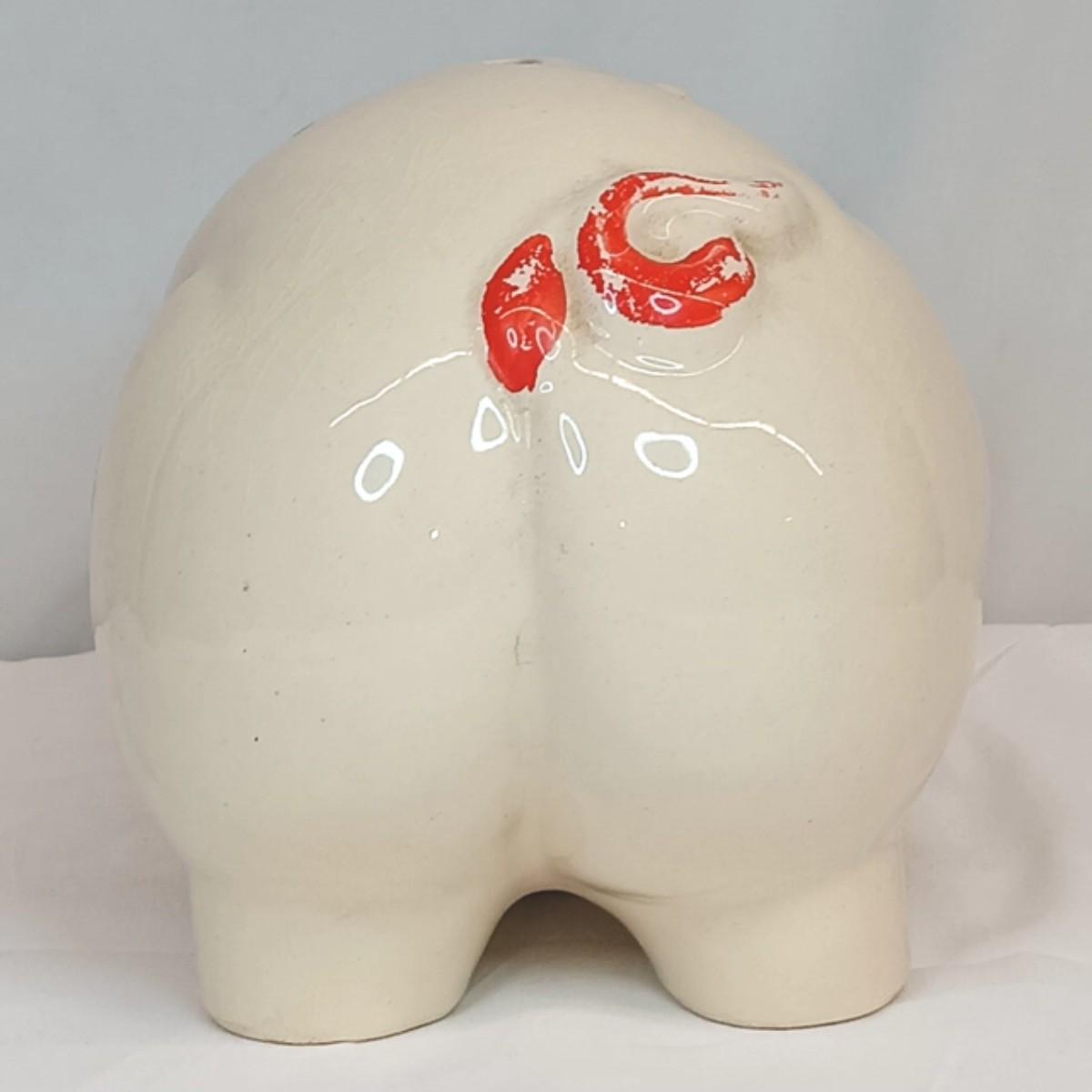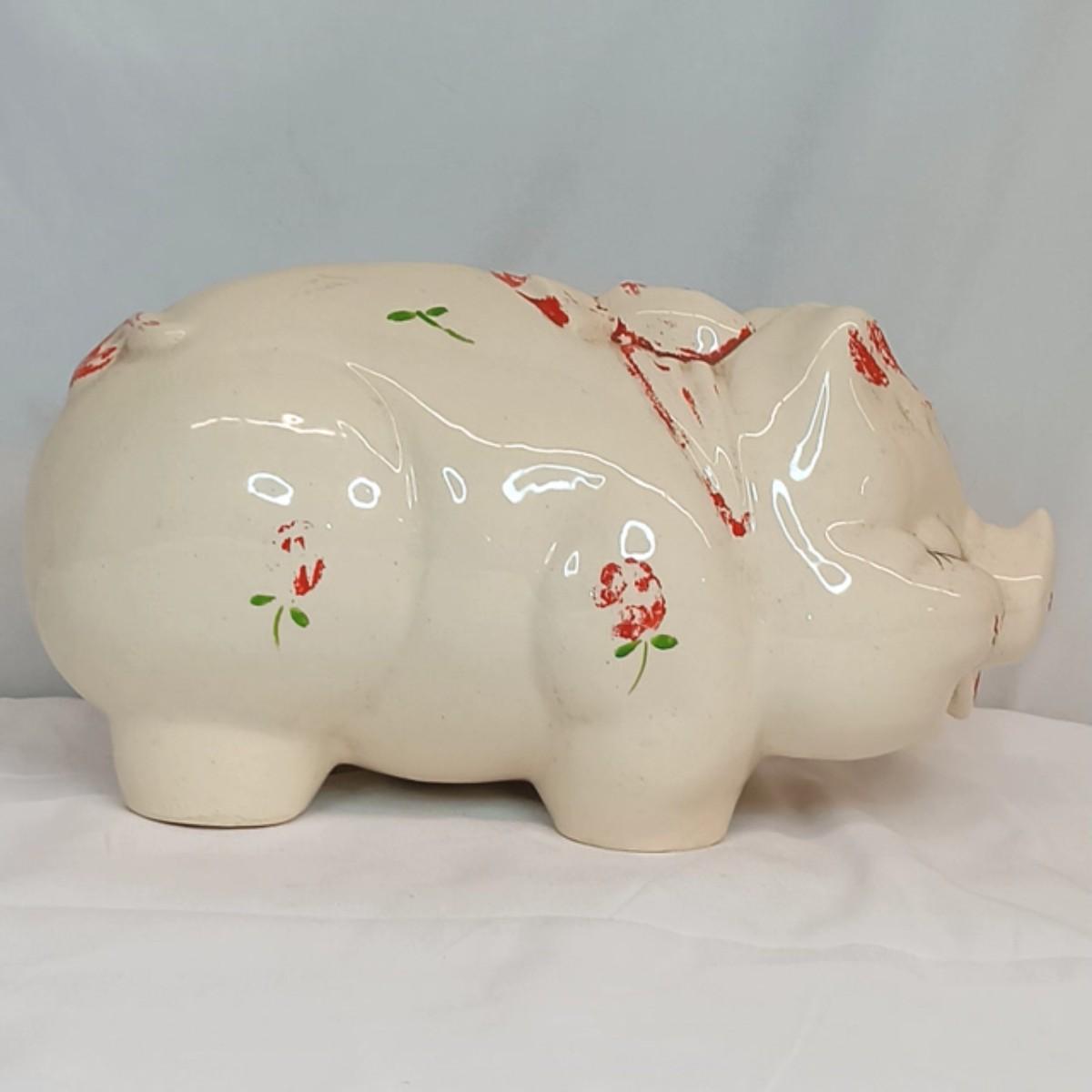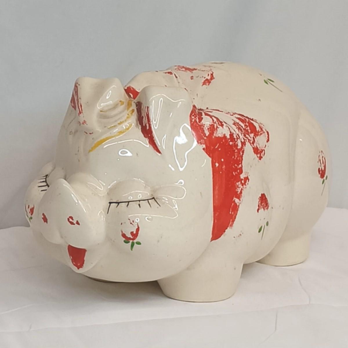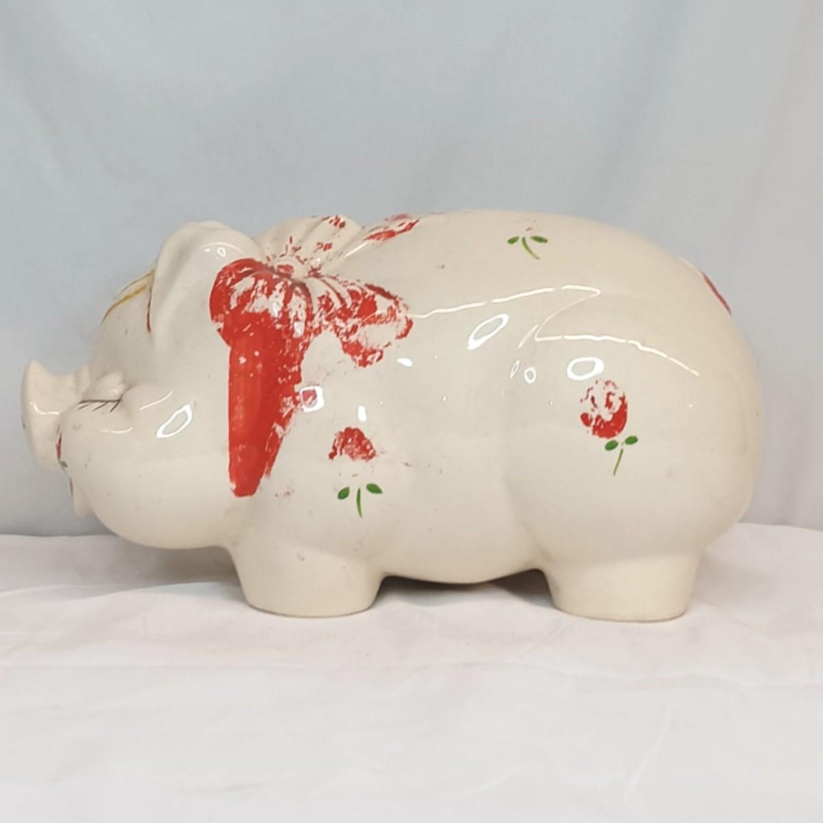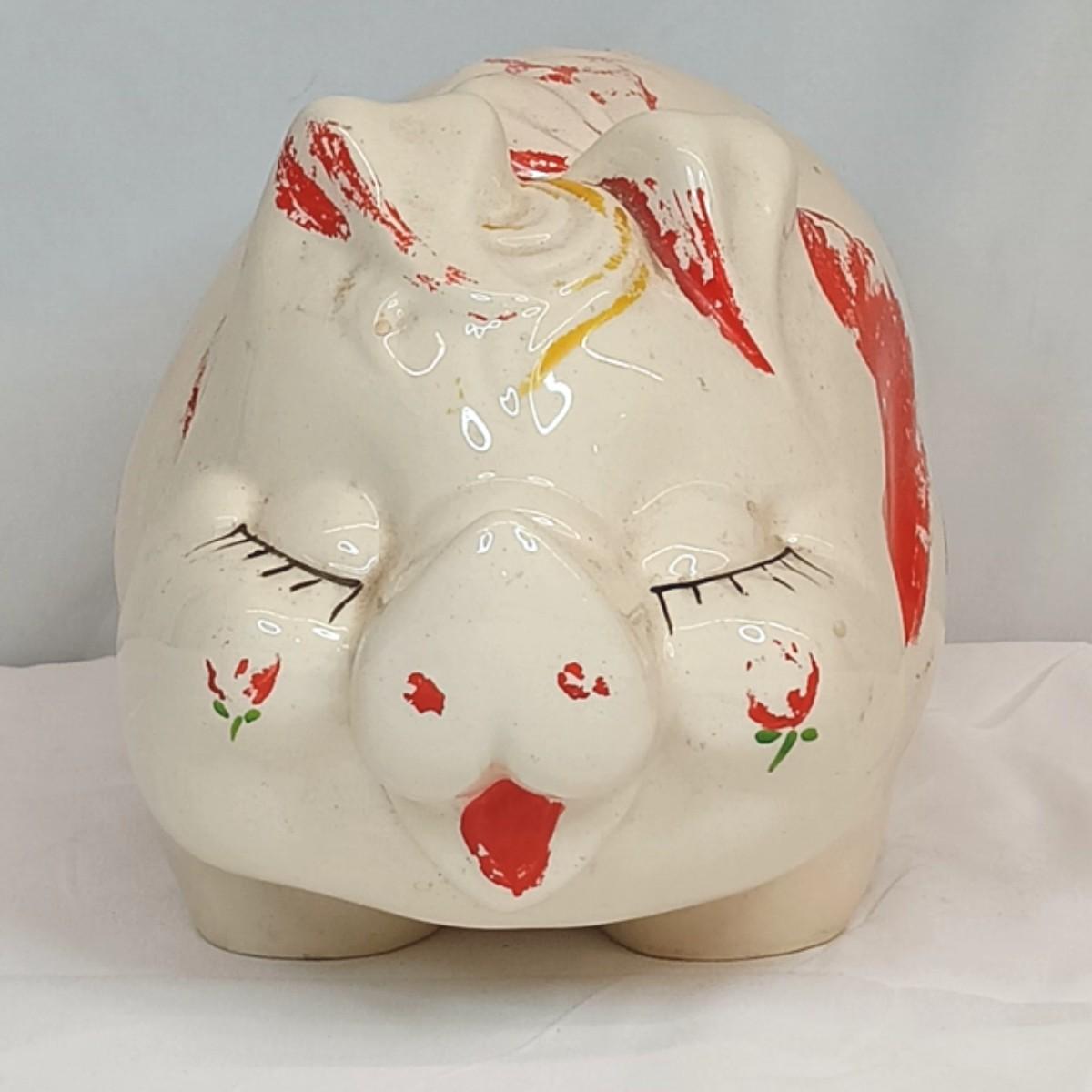 This large, vintage ceramic piggy bank is in good condition. The finish has crazing and there is paint loss from age and use. The plug is inside the piggy bank and we will leave removing up to the new owner. The bank measures approximately 14" long and 7" high.