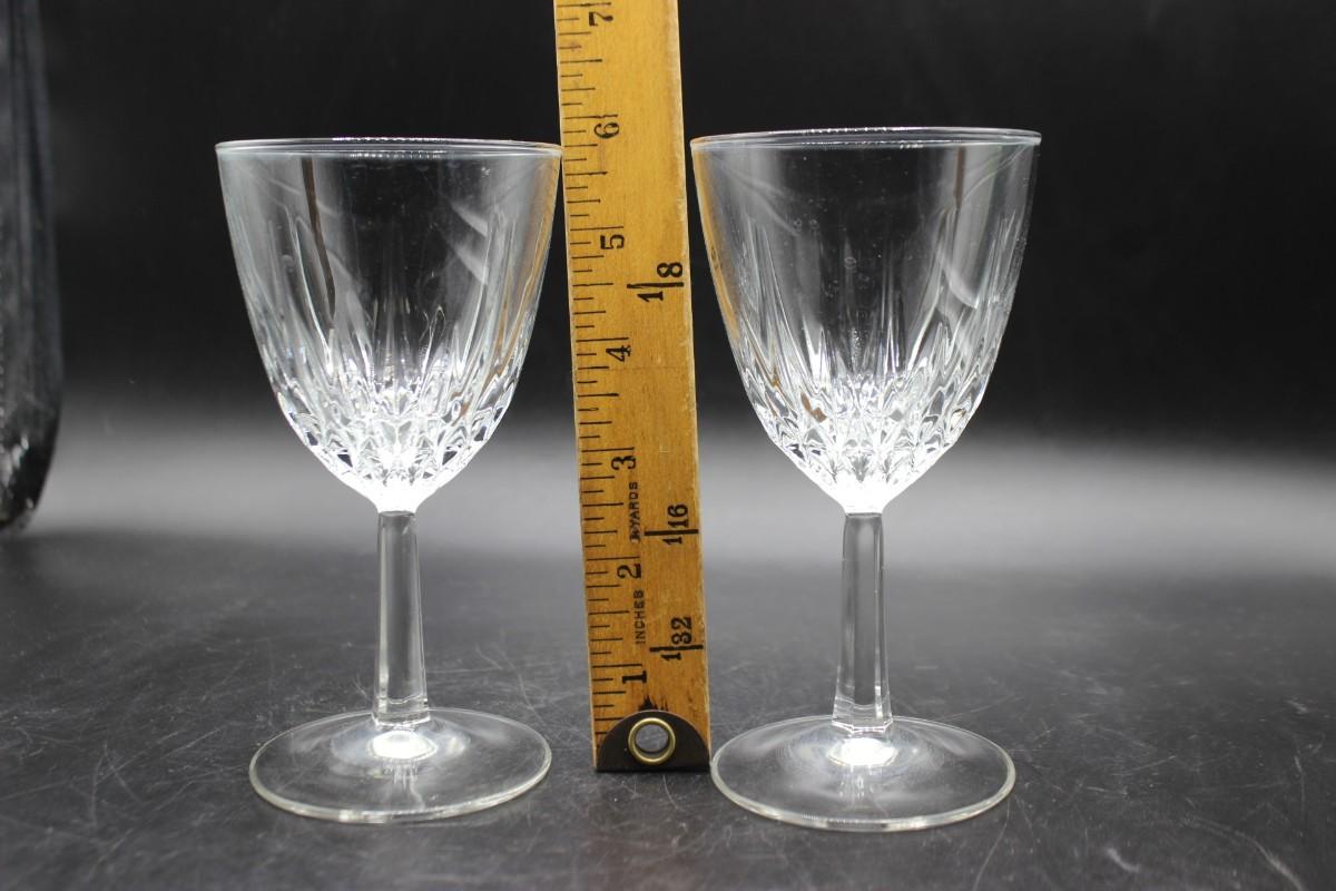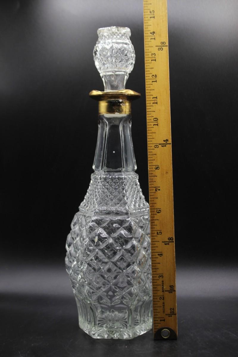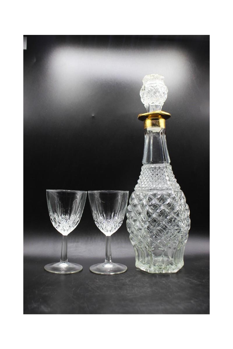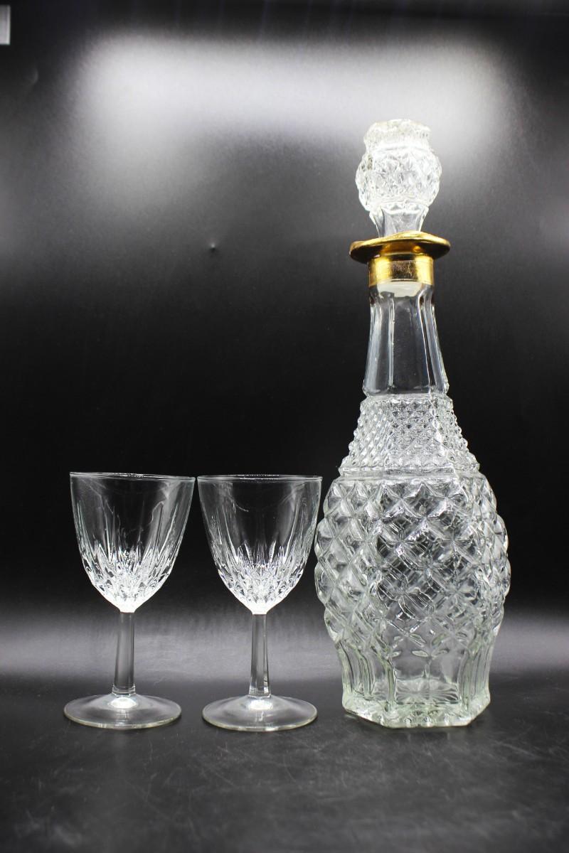 Large decanter with pair of glasses. Decanter feels more like pressed glass while the glasses feel like crystal. All are in good condition. Decanter is tall about 14" with stopper.
