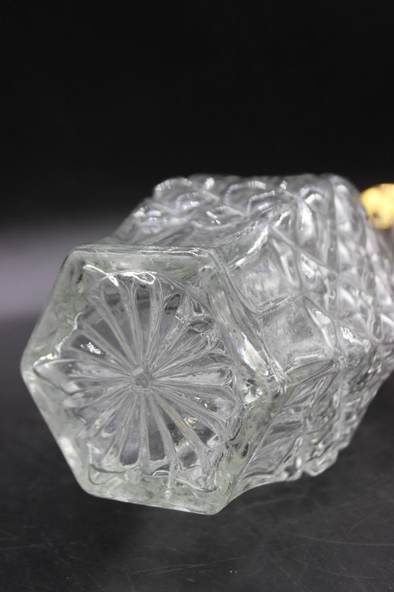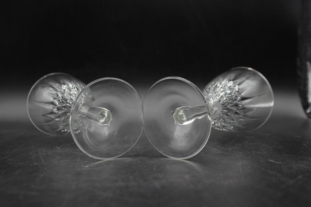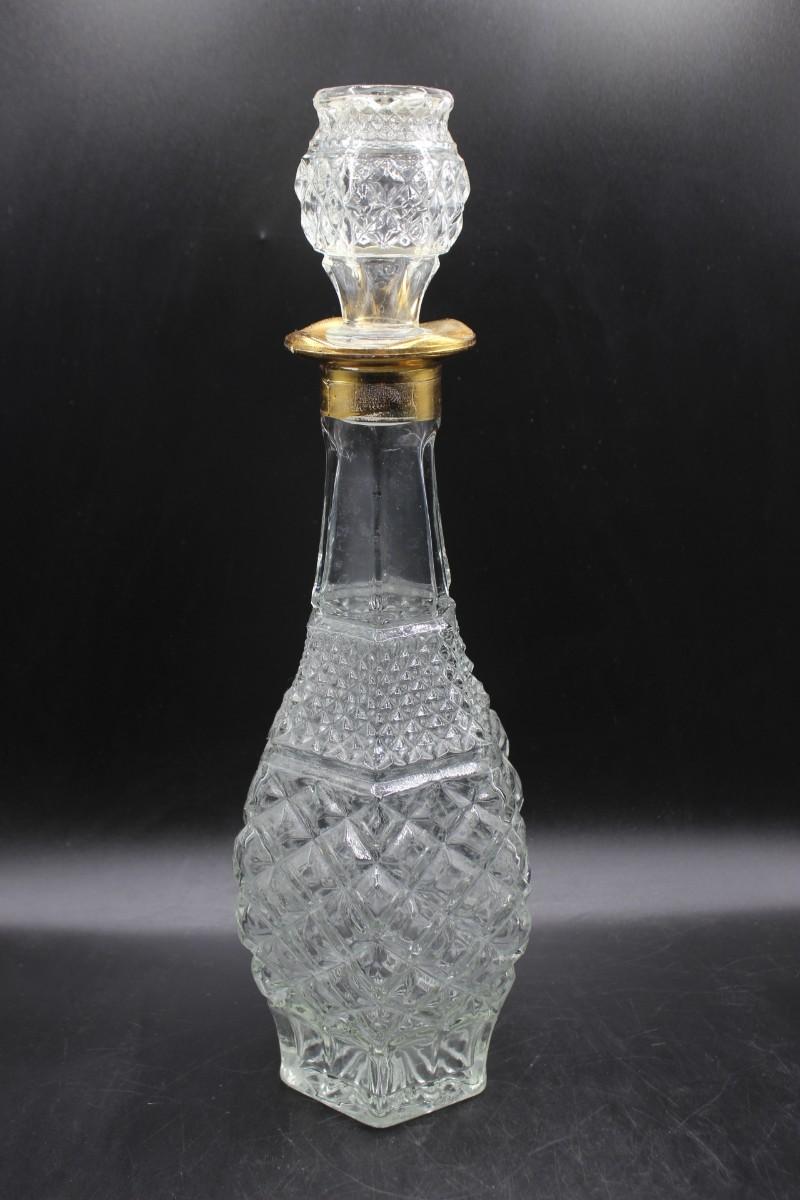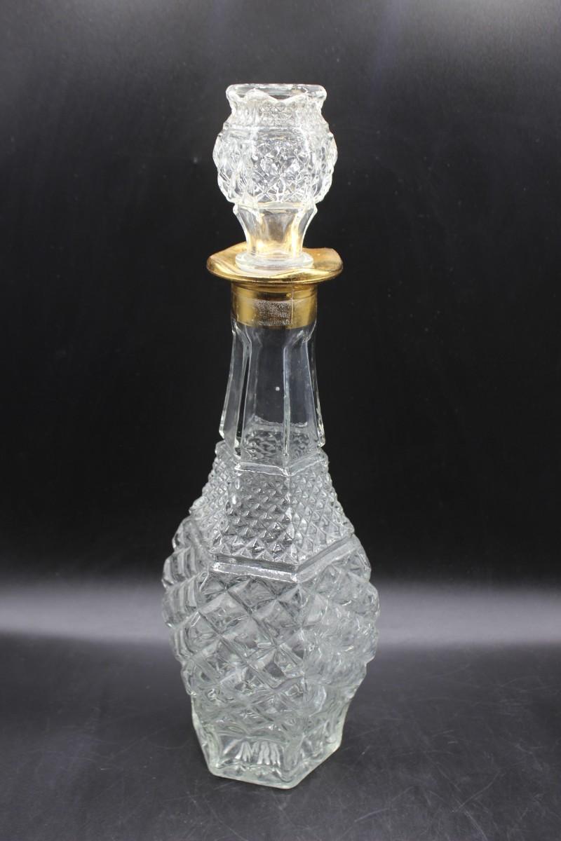 Large decanter with pair of glasses. Decanter feels more like pressed glass while the glasses feel like crystal. All are in good condition. Decanter is tall about 14" with stopper.