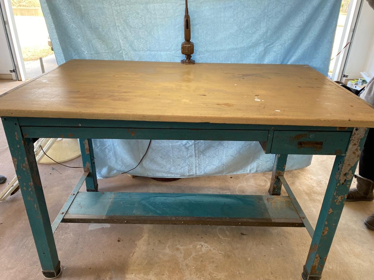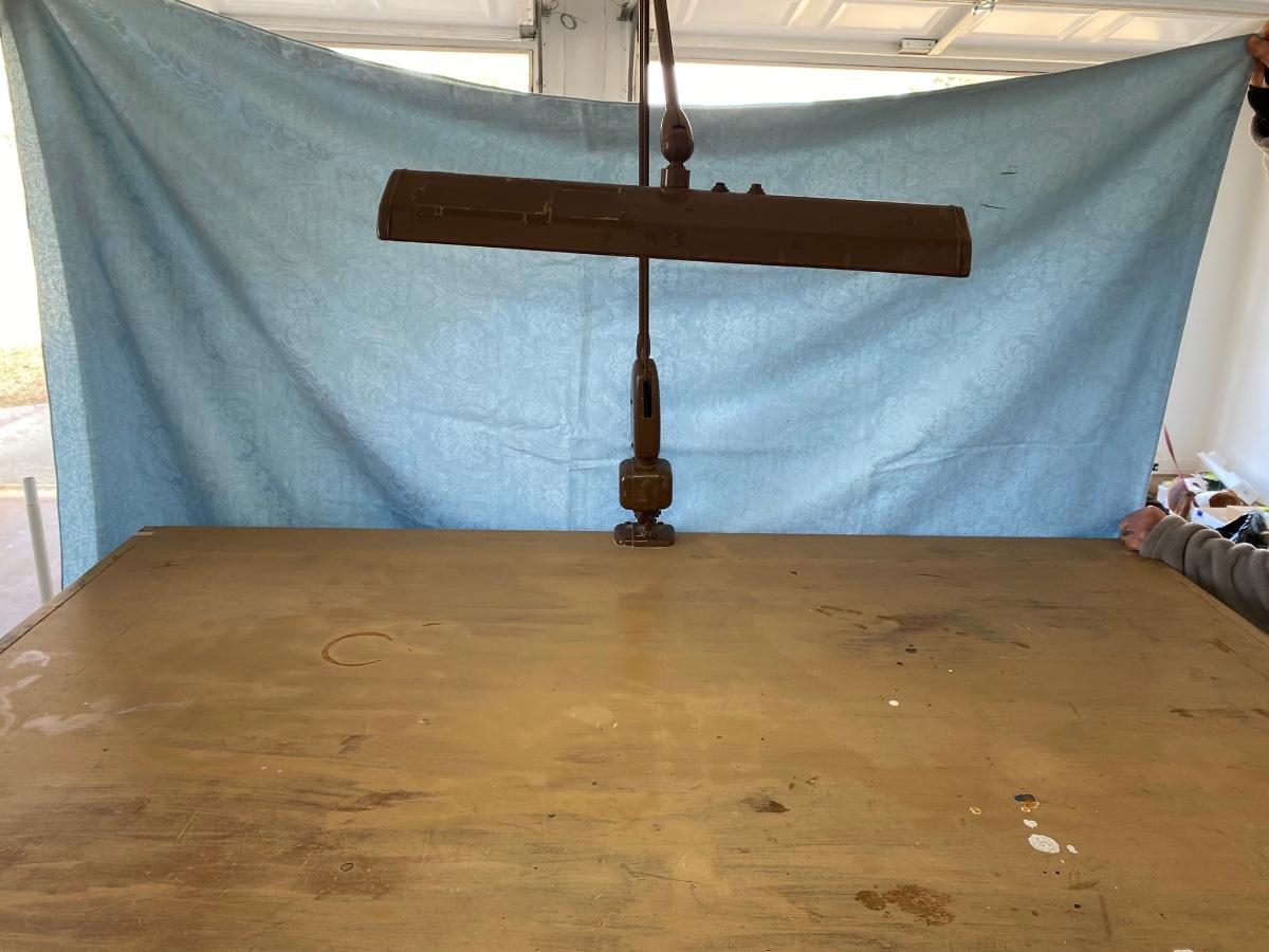 Large vintage drafting/work table with industrial light