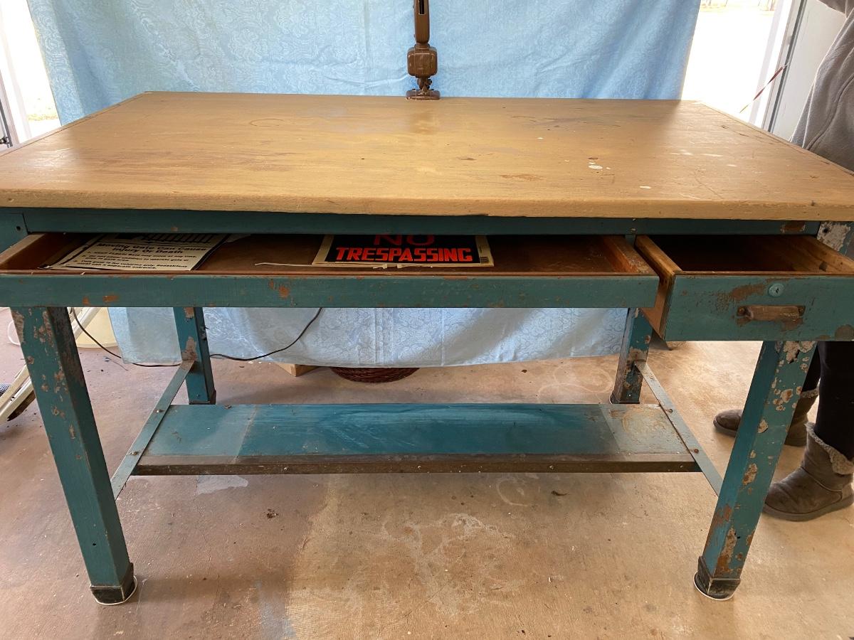Large vintage drafting/work table. There are knobs on each side but the table only raises to a slight slant. Makes a great work table. 5’ x 3’ x 38”h. Adjustable industrial light attached.
