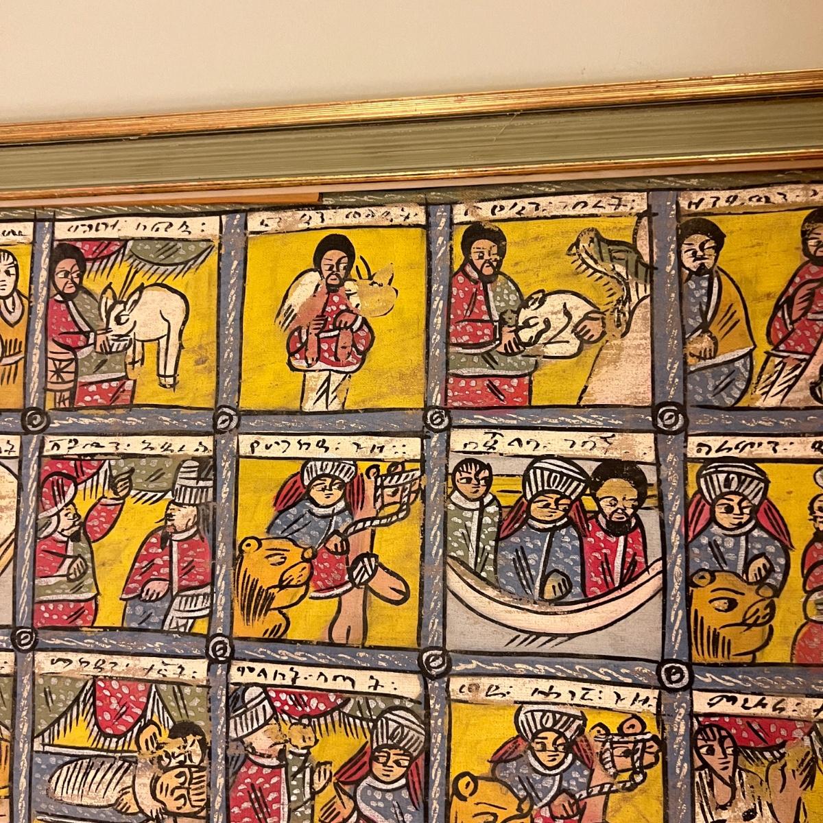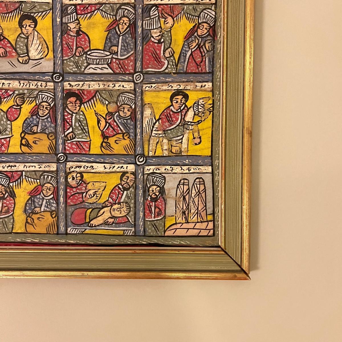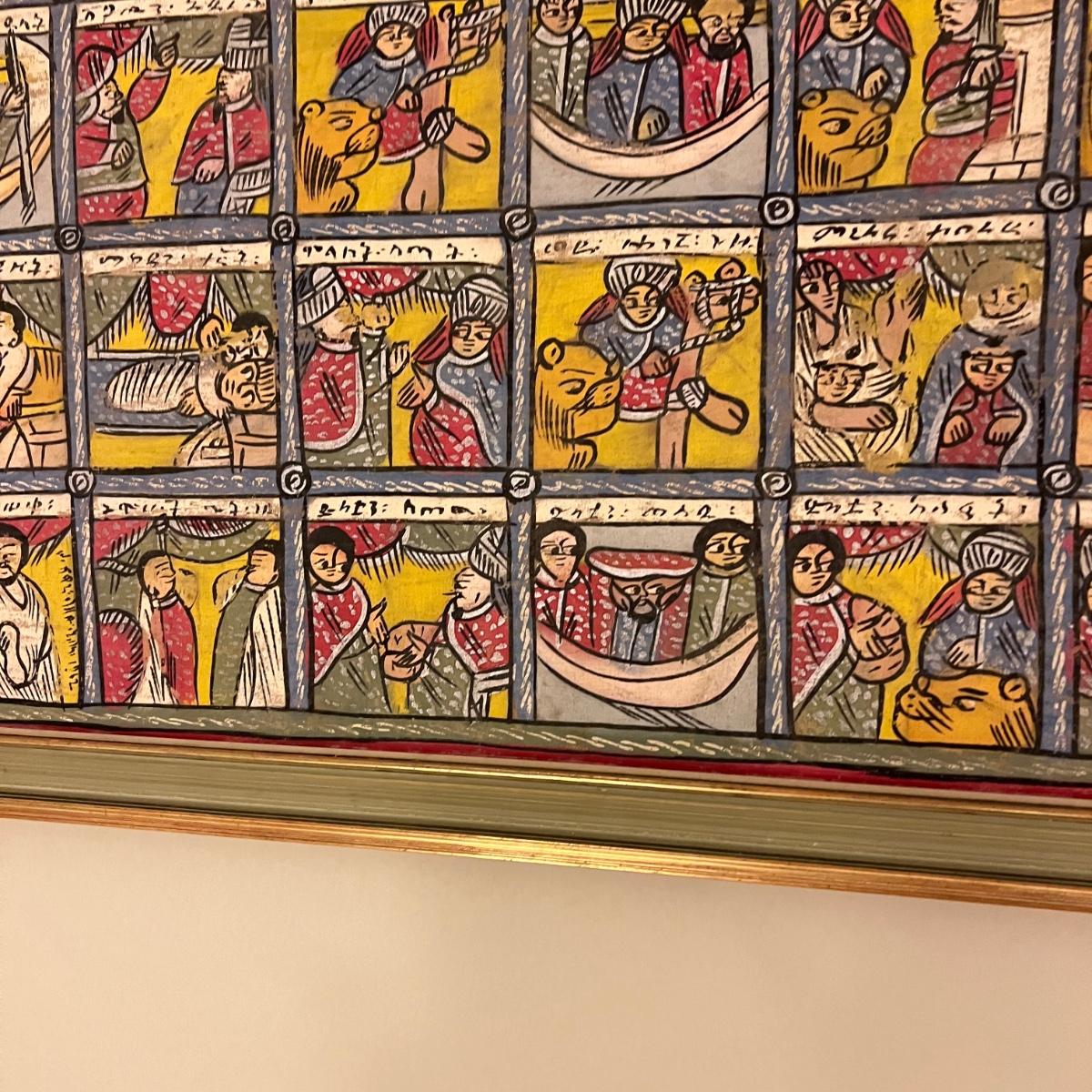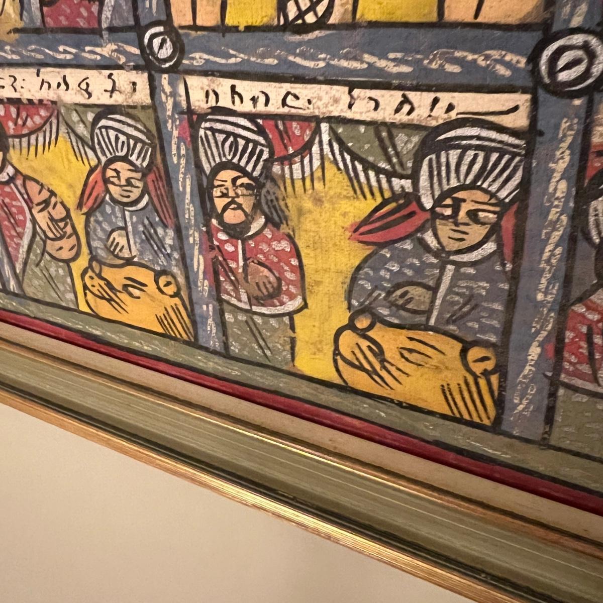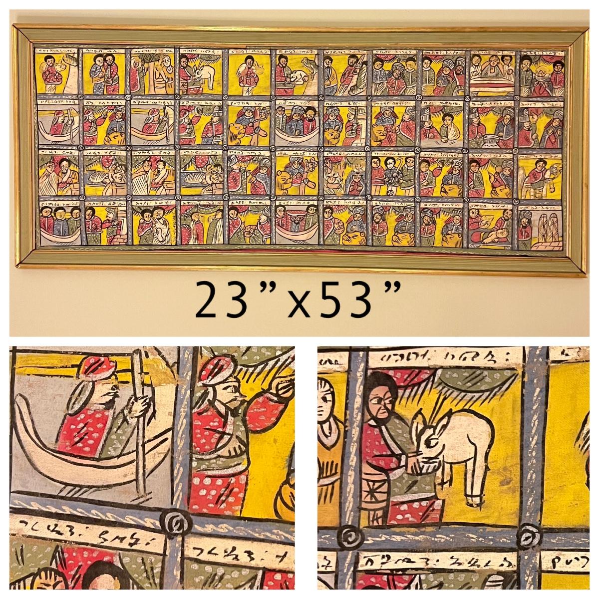 Large Vintage Ethiopian Painting on Wood King Solomon Narrative 23”x53”