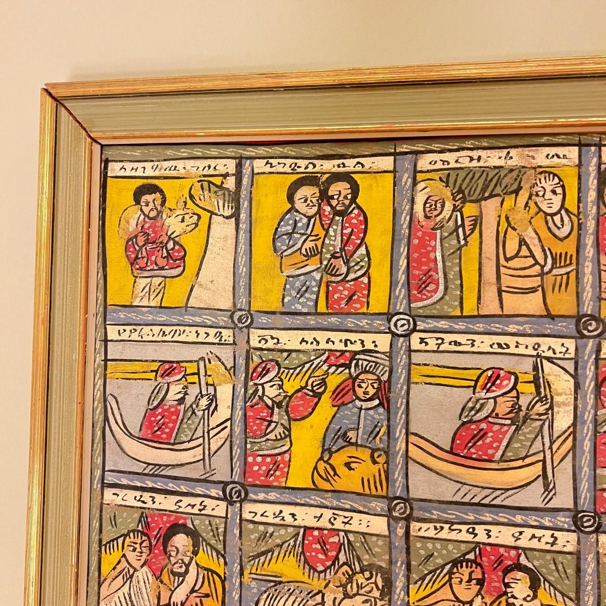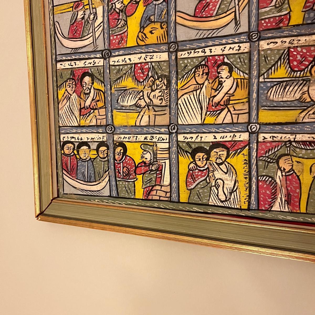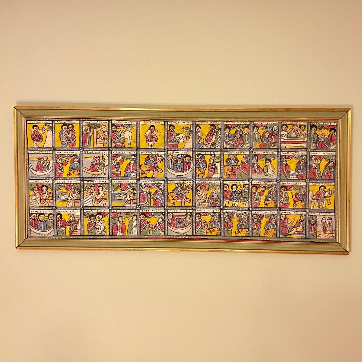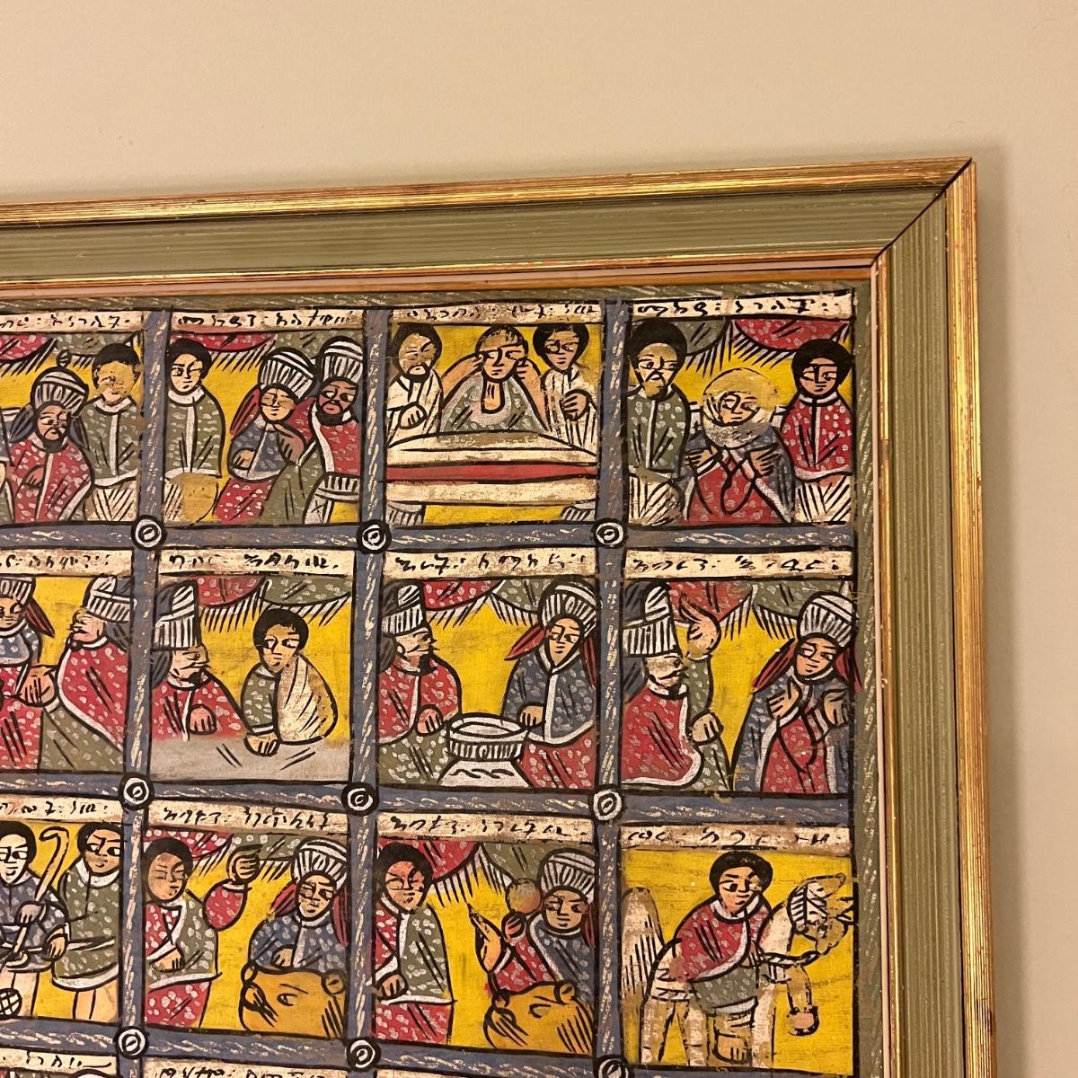 Large Vintage Ethiopian Painting on Wood King Solomon Narrative 23”x53”