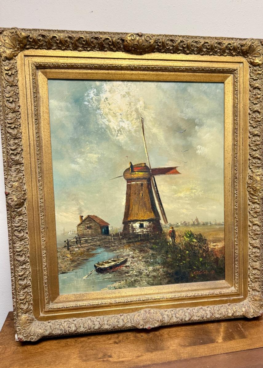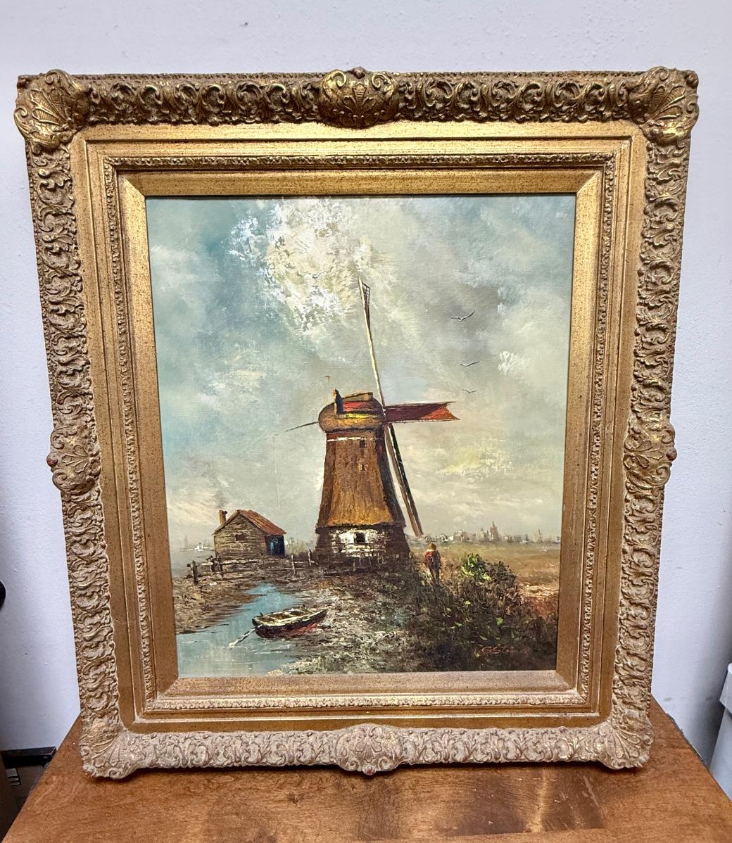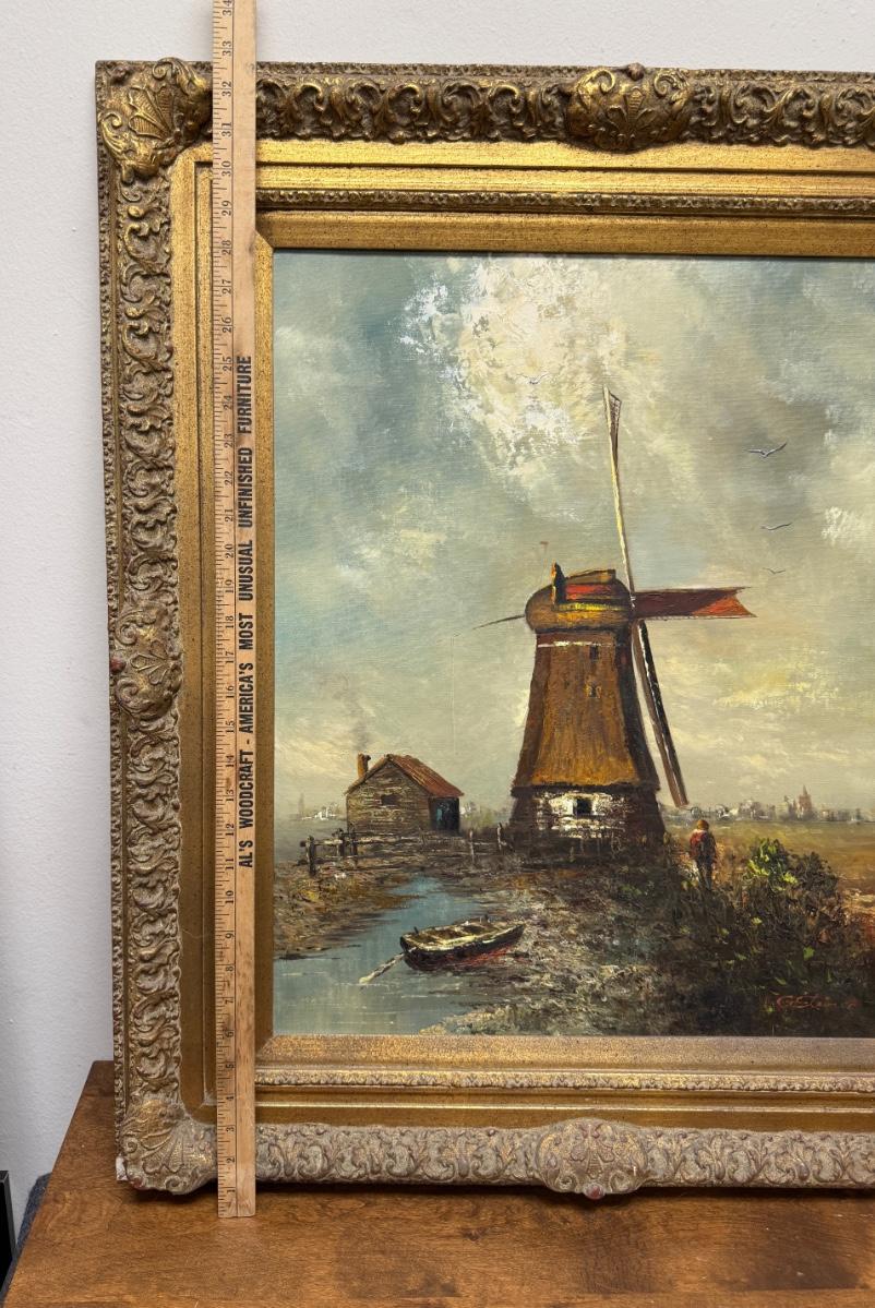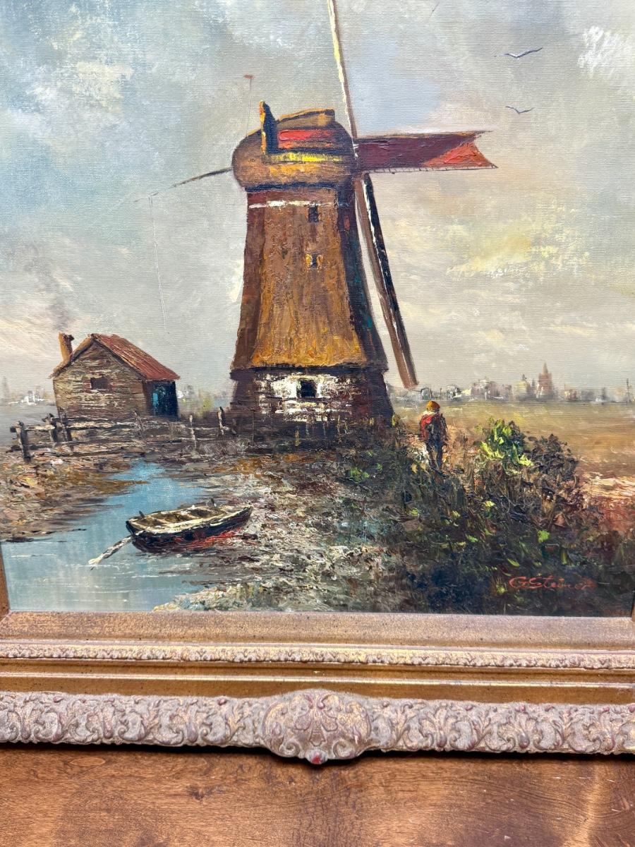 Large Vintage Framed Art: Oil Painting on Canvas of a Windmill artist G. Steiner