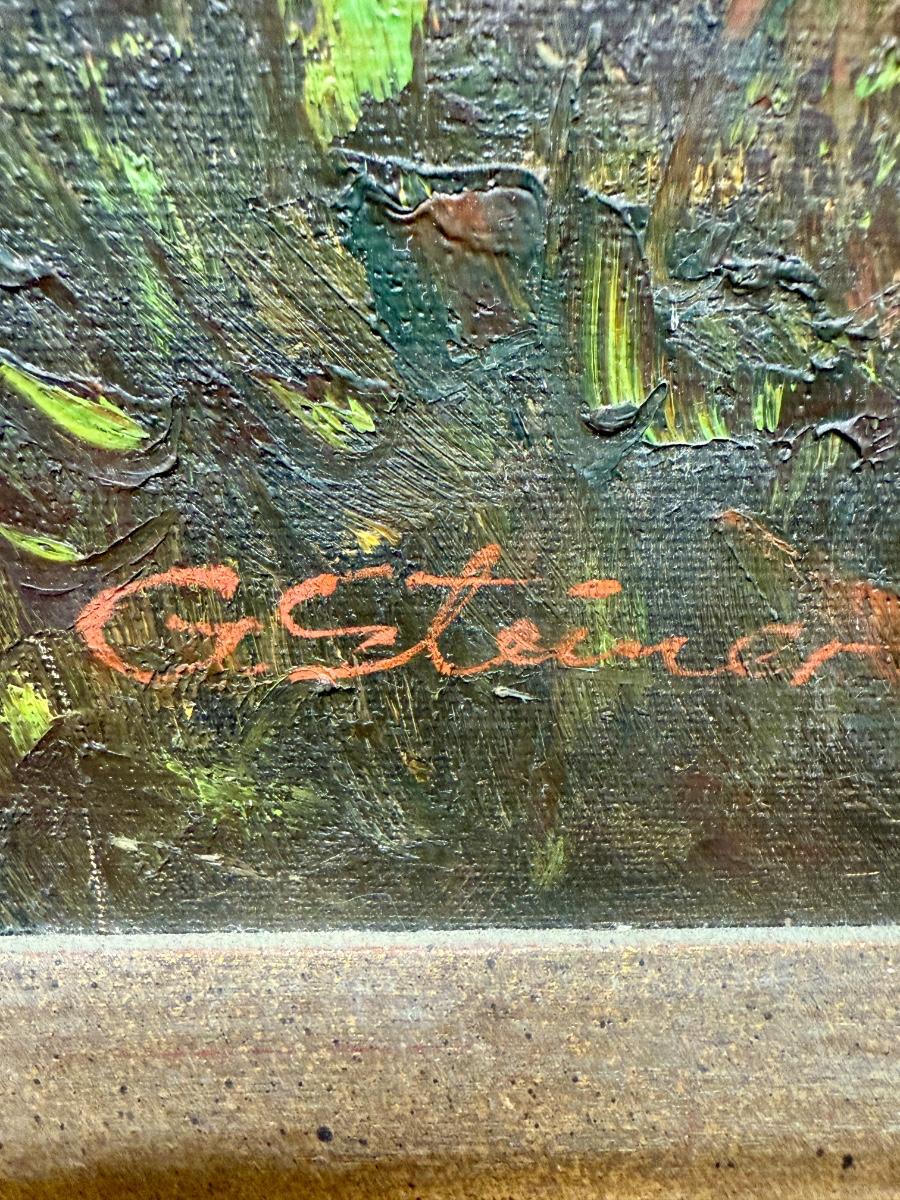 Approx. 33” x 29”, good condition except for a small split in the paint to the left of the windmill (canvas is OK). Artist is G. Steiner, looks to be inspired by a work titled “In the Month Of July” by Herbe.