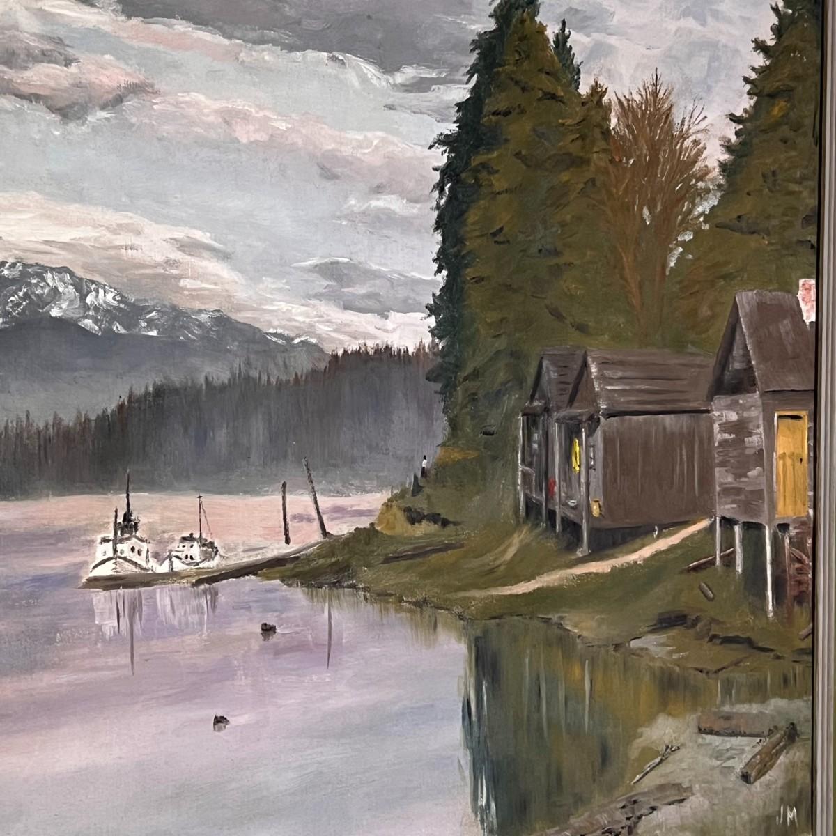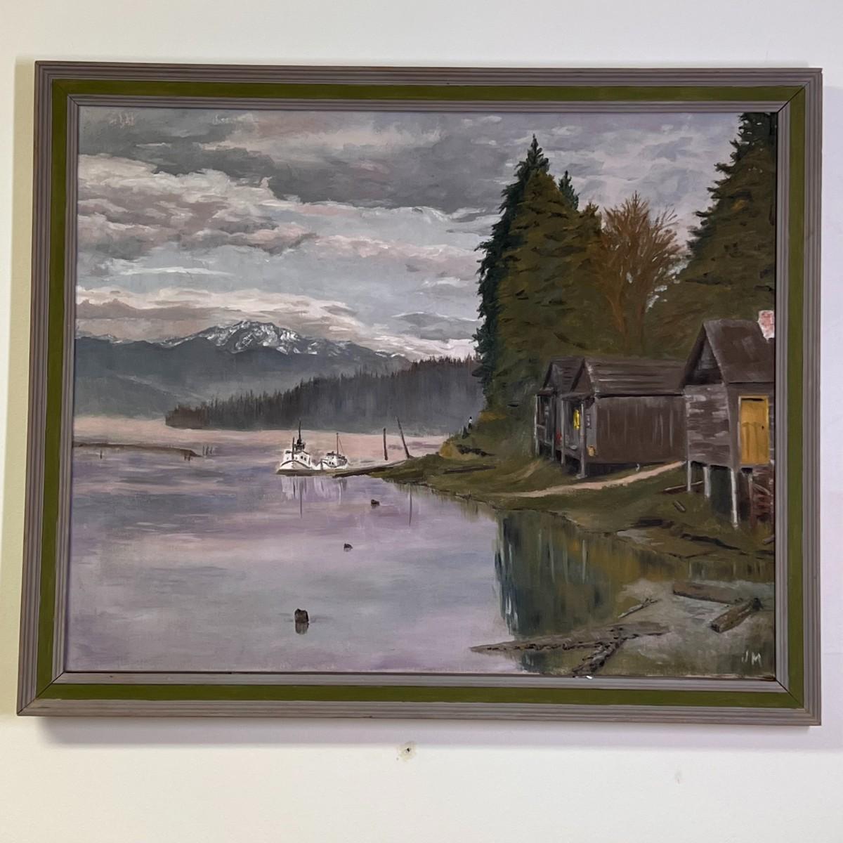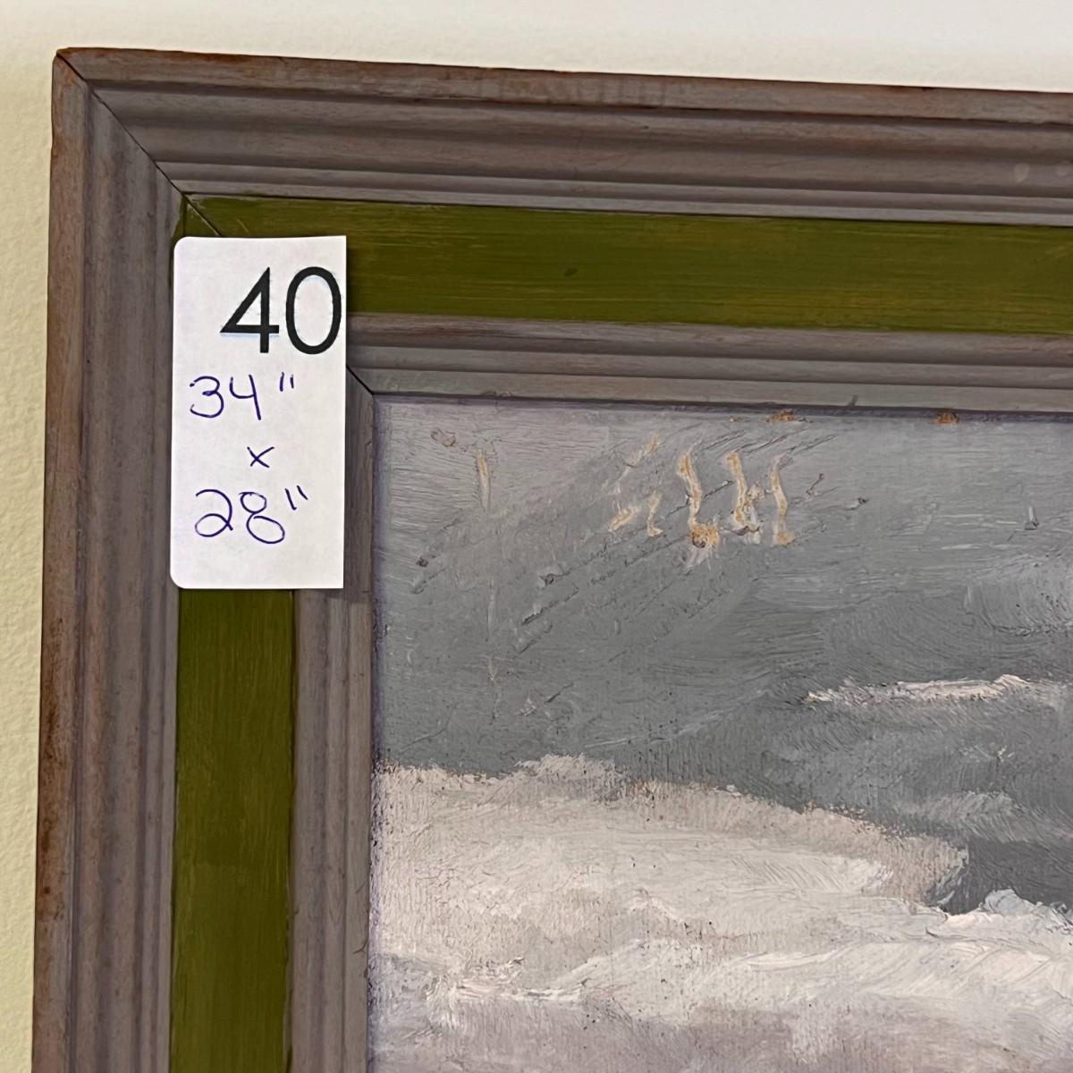 Large oil painting. Framed is painted to match the art. Canvas is slightly loose from frame. 34" x 28"