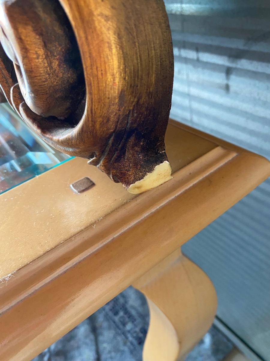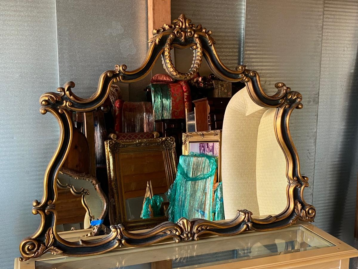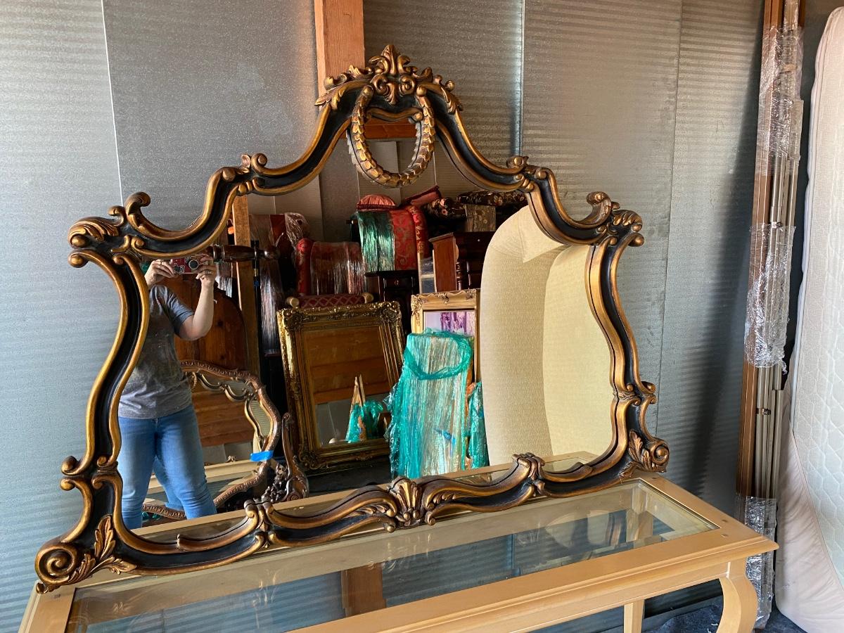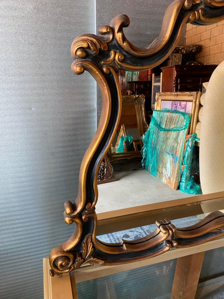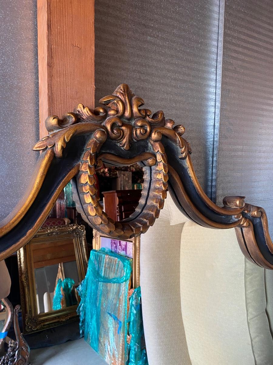 Large Vintage French Provincial Hollywood Regency Hanging Wall Mirror. Black with gold frame. In good condition. Has a Thick wire for hanging. About 5'x3.5' size. There is a damaged corner piece at the bottom right side, but it doesn't show too much.