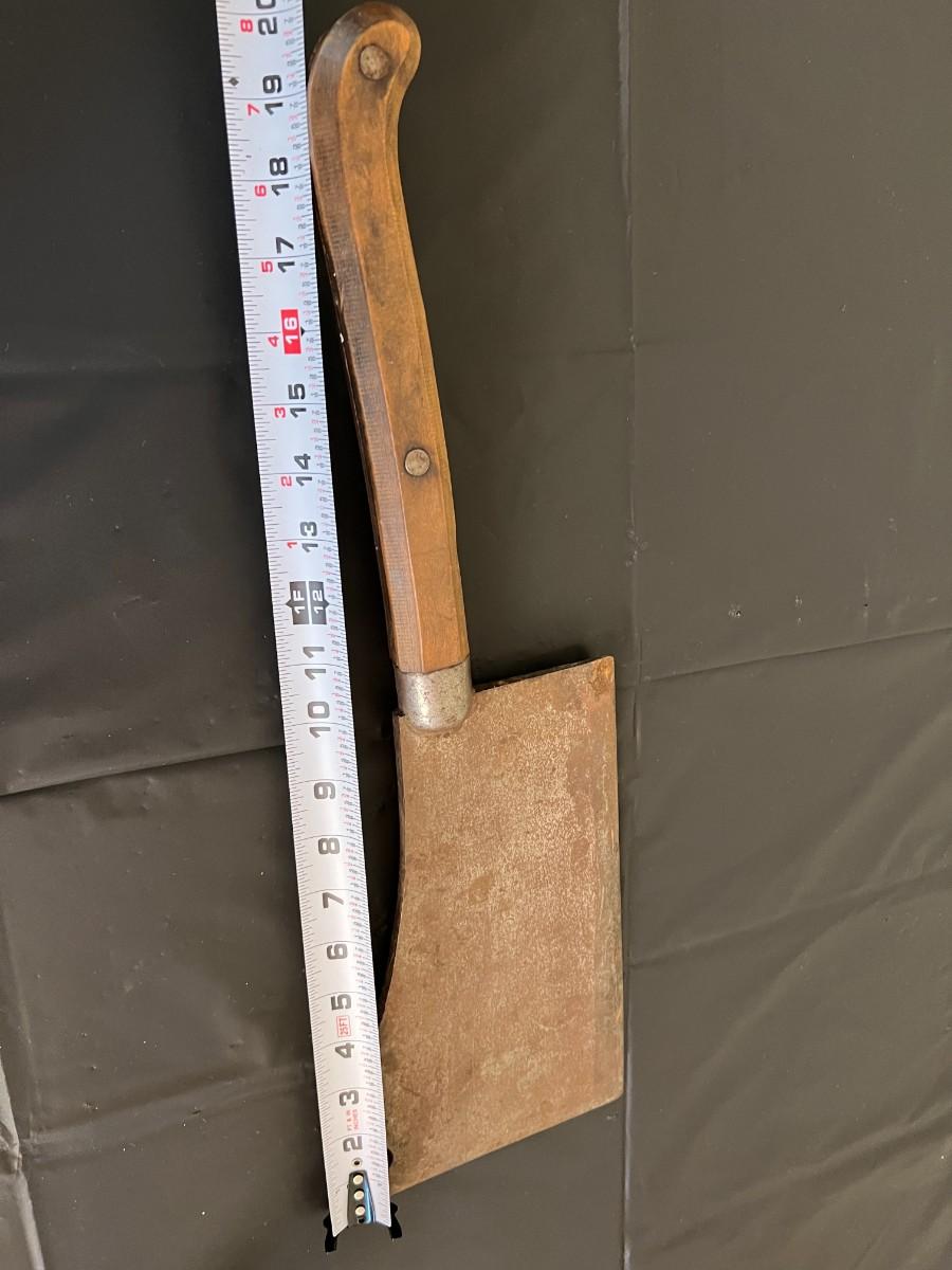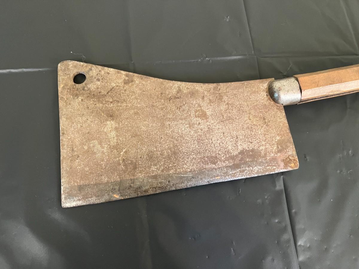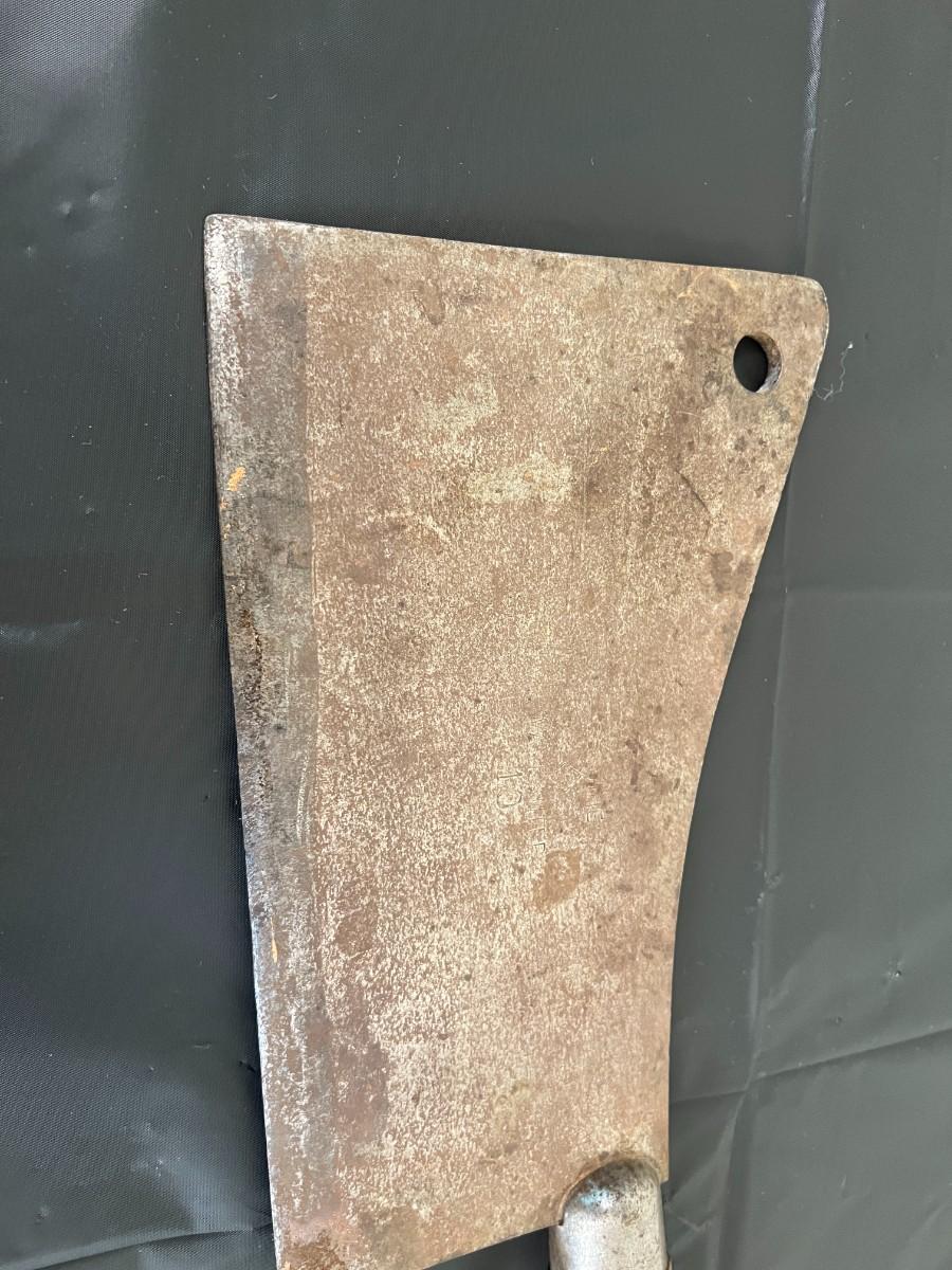 Large Vintage Genuine Warranted 10 Butchers Meat Cleaver Knife. Has an A stamps inside a diamond shape. Condition as shown.