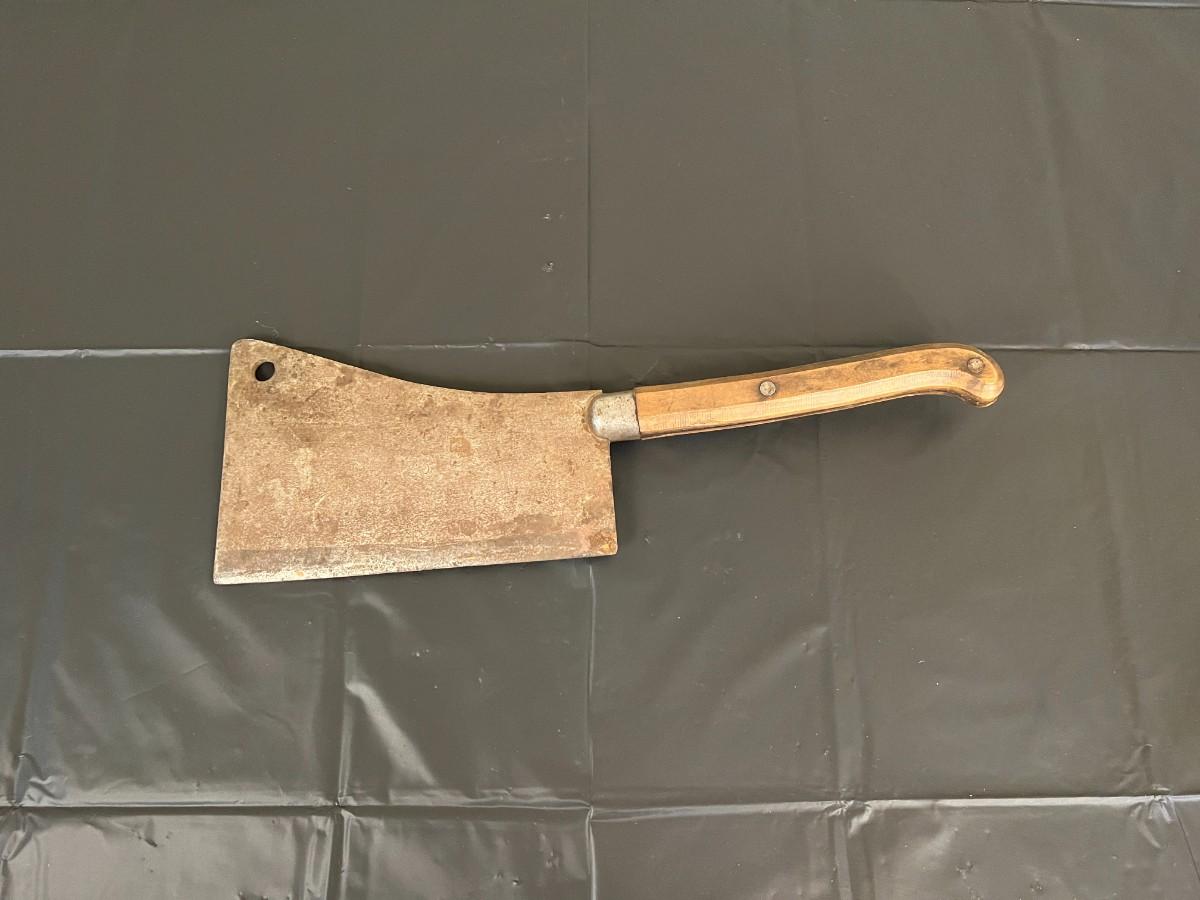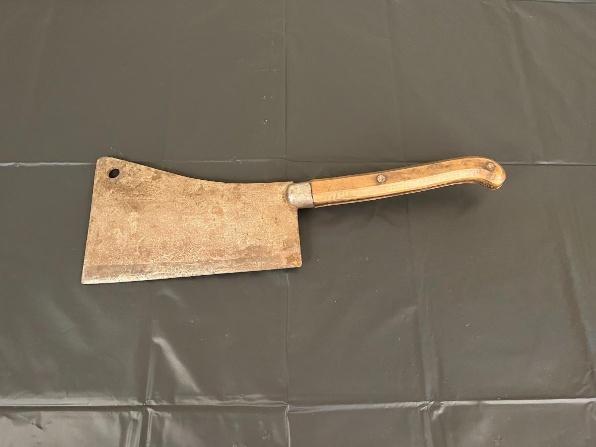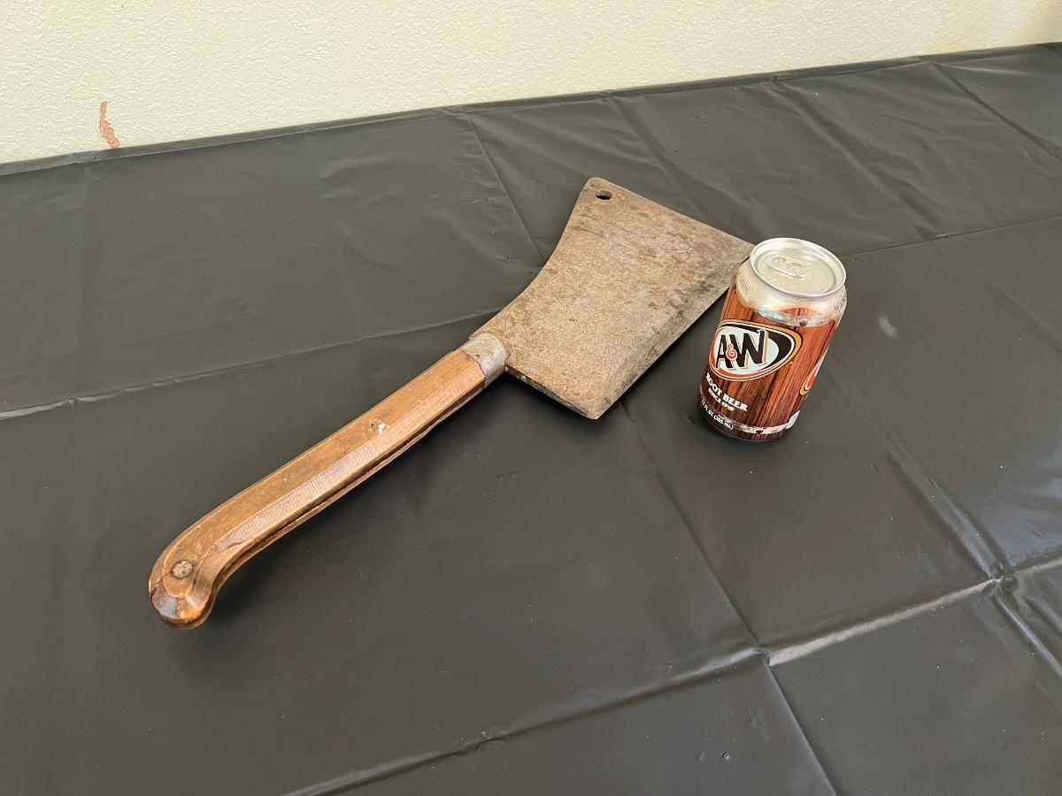 Large Vintage Genuine Warranted 10 Butchers Meat Cleaver Knife. Has an A stamps inside a diamond shape. Condition as shown.
