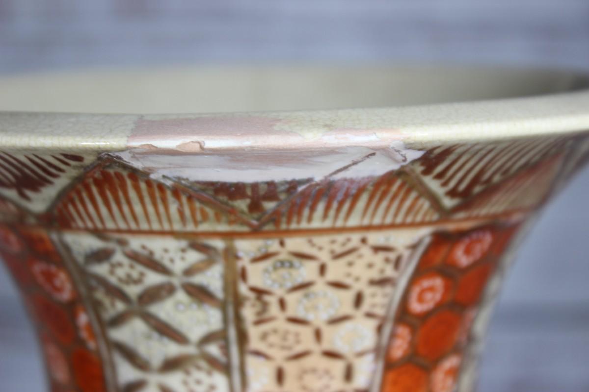 Large Vintage Japanese Satsuma Style Moriage Decorative Art Vase, there are signs of repair on the lip of the vase, but there are no significant chips or cracks to the vase and is in good vintage condition. The entire vase is finely decorated and textured with royal scenes, check pictures for more details and for sizing.