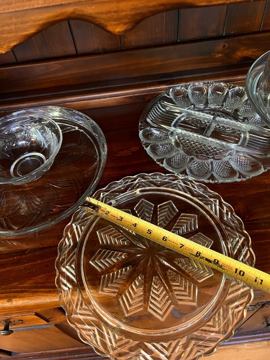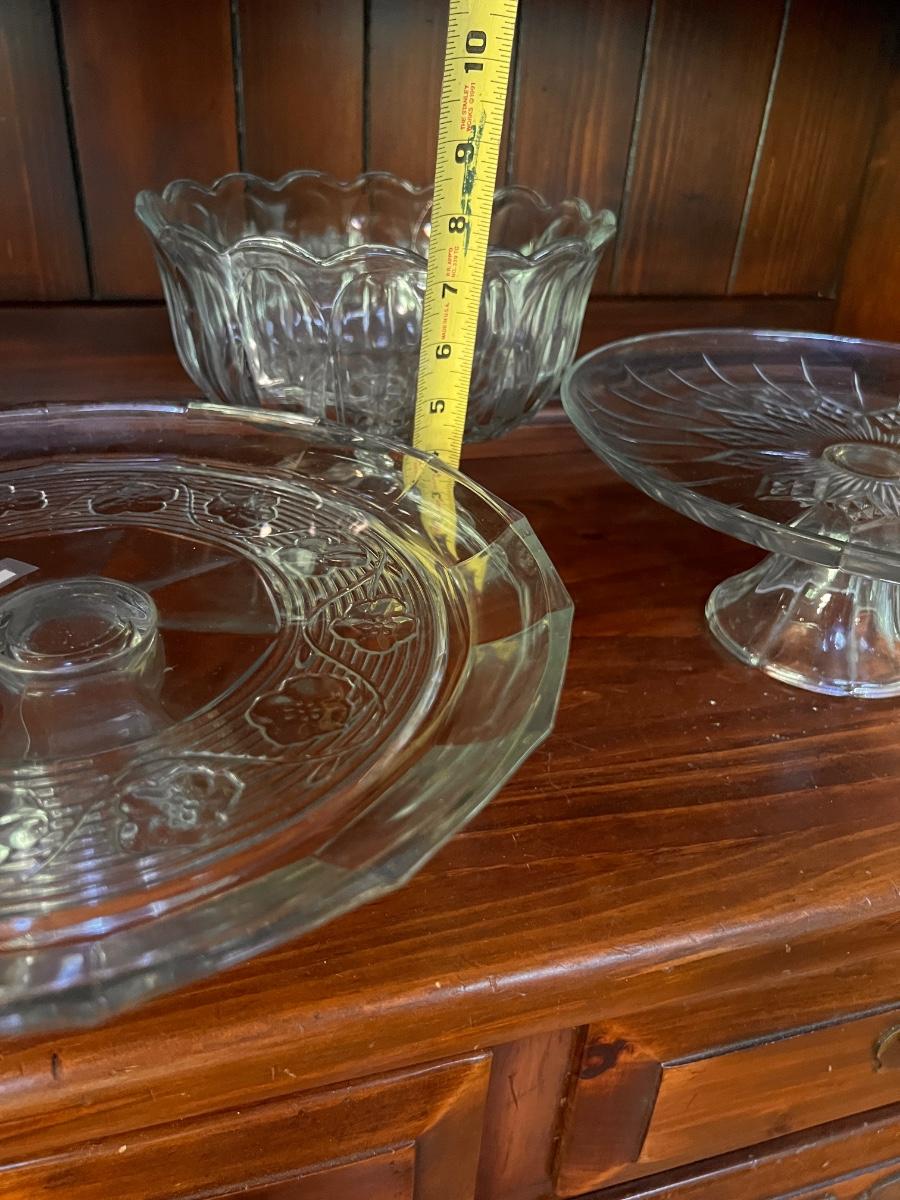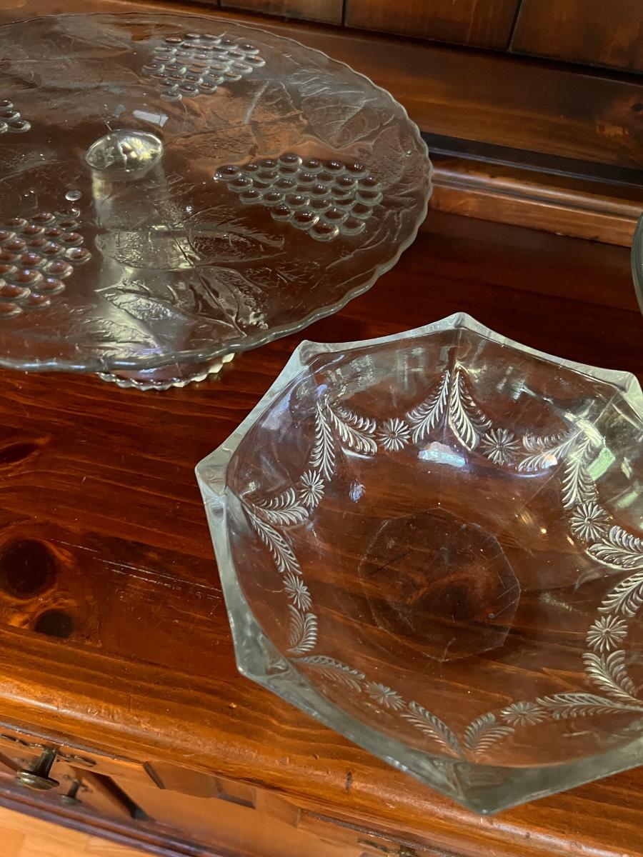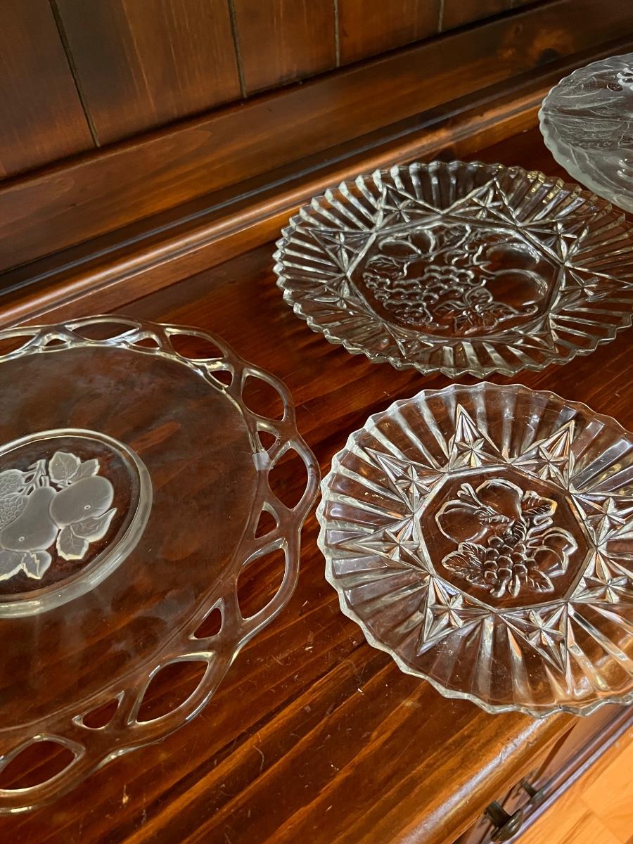 Etched glass, cut glass, possible crystal? Cake stands, plates, bowls, pitchers, cannisters, dispensers, etc.
