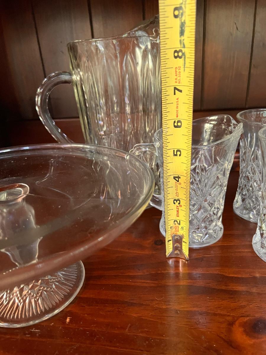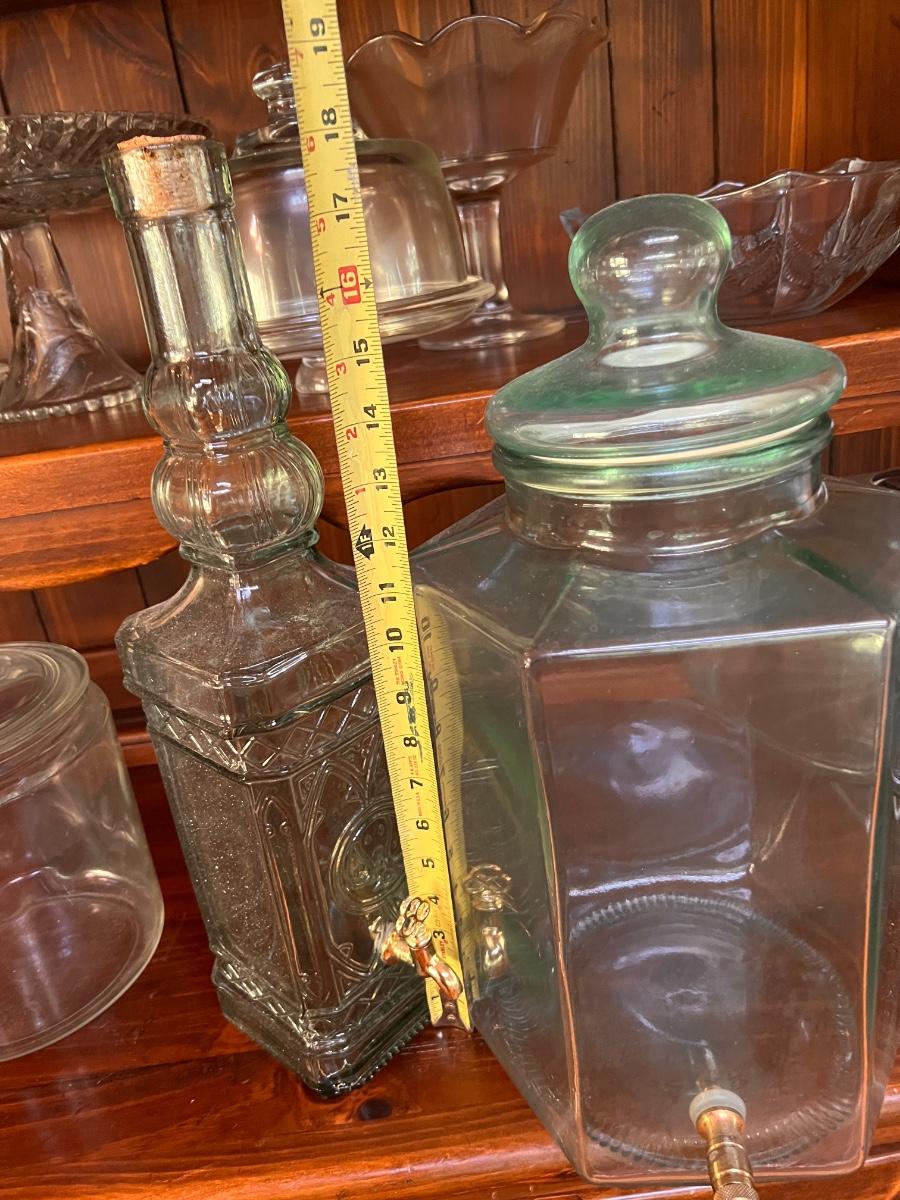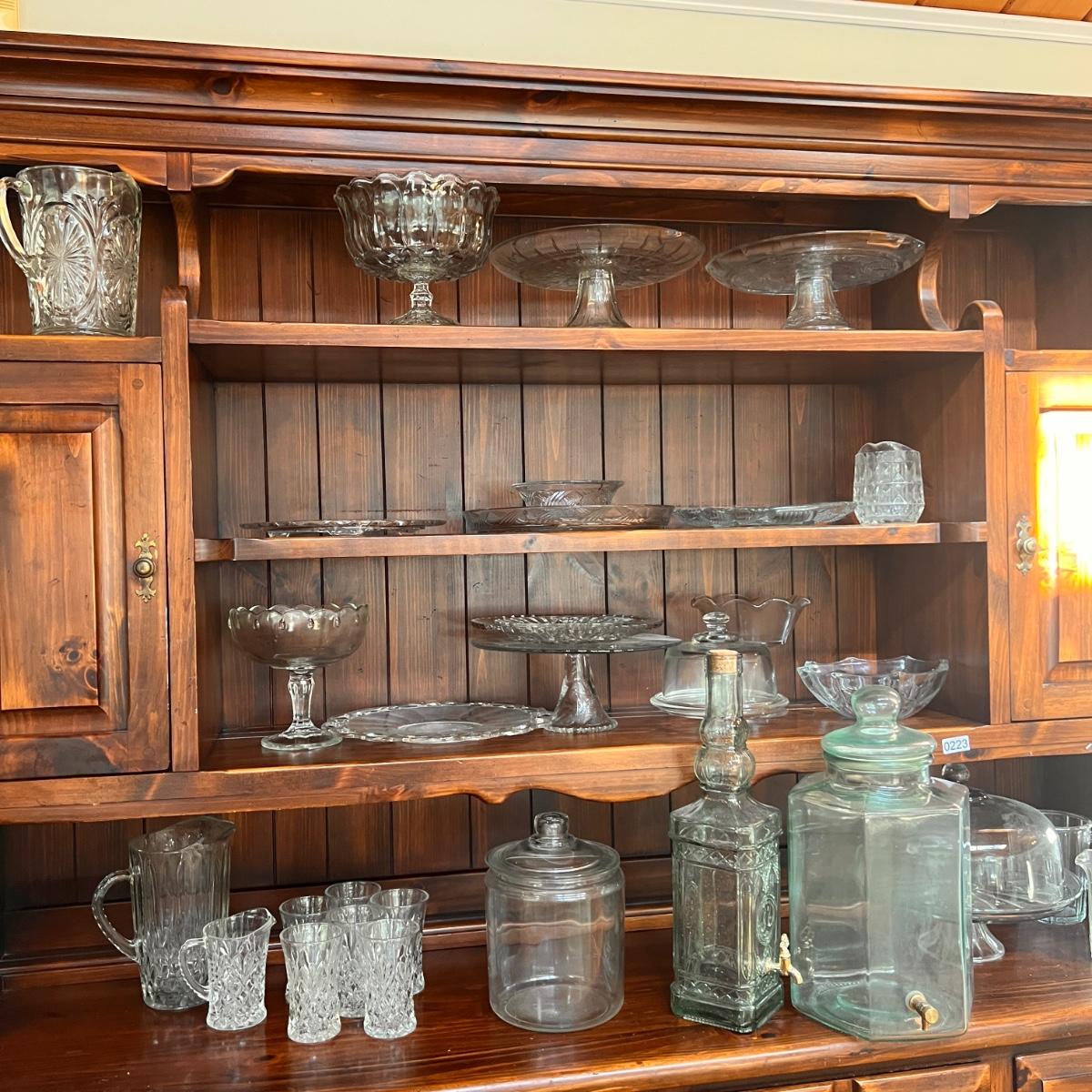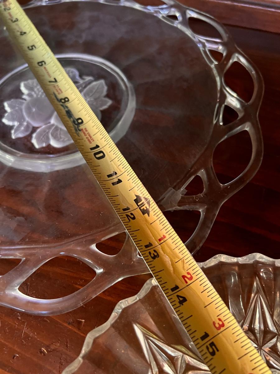 Etched glass, cut glass, possible crystal? Cake stands, plates, bowls, pitchers, cannisters, dispensers, etc.