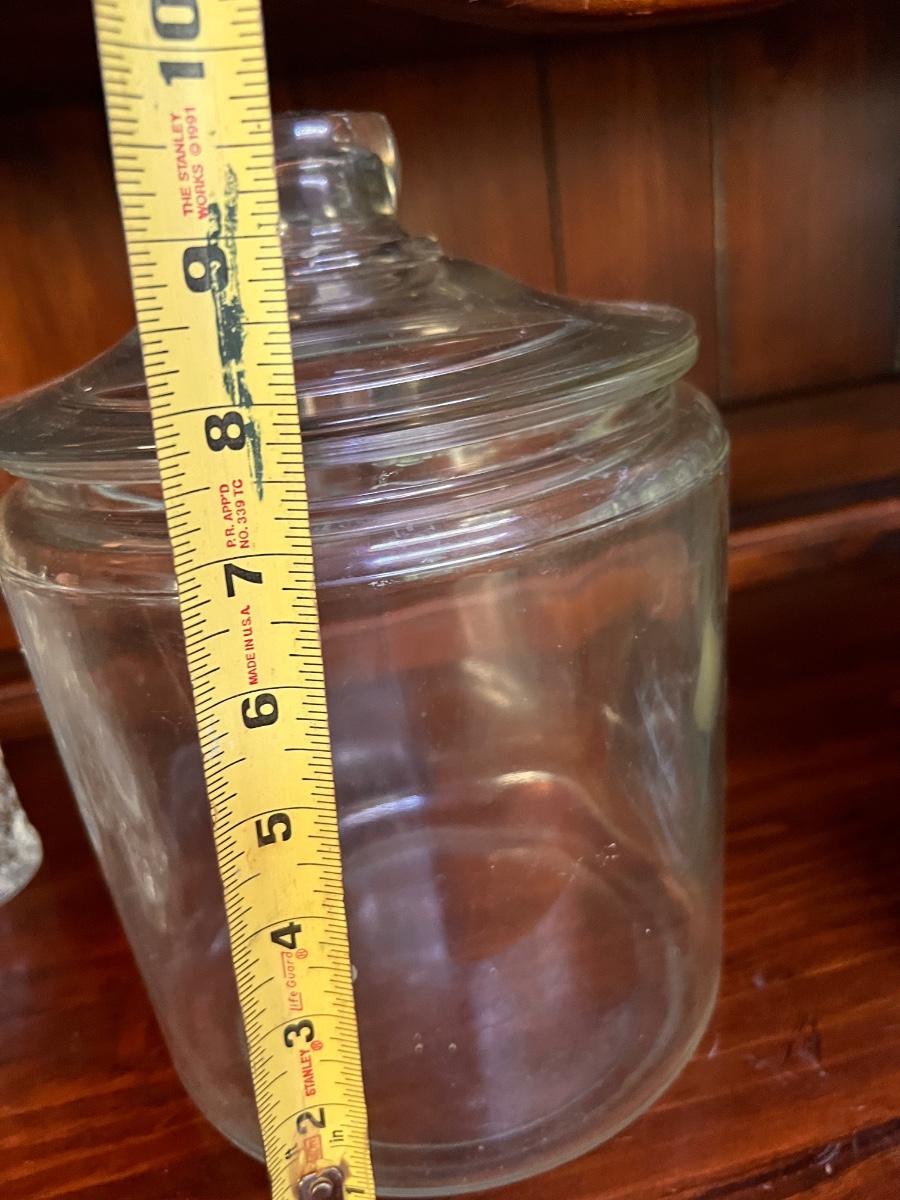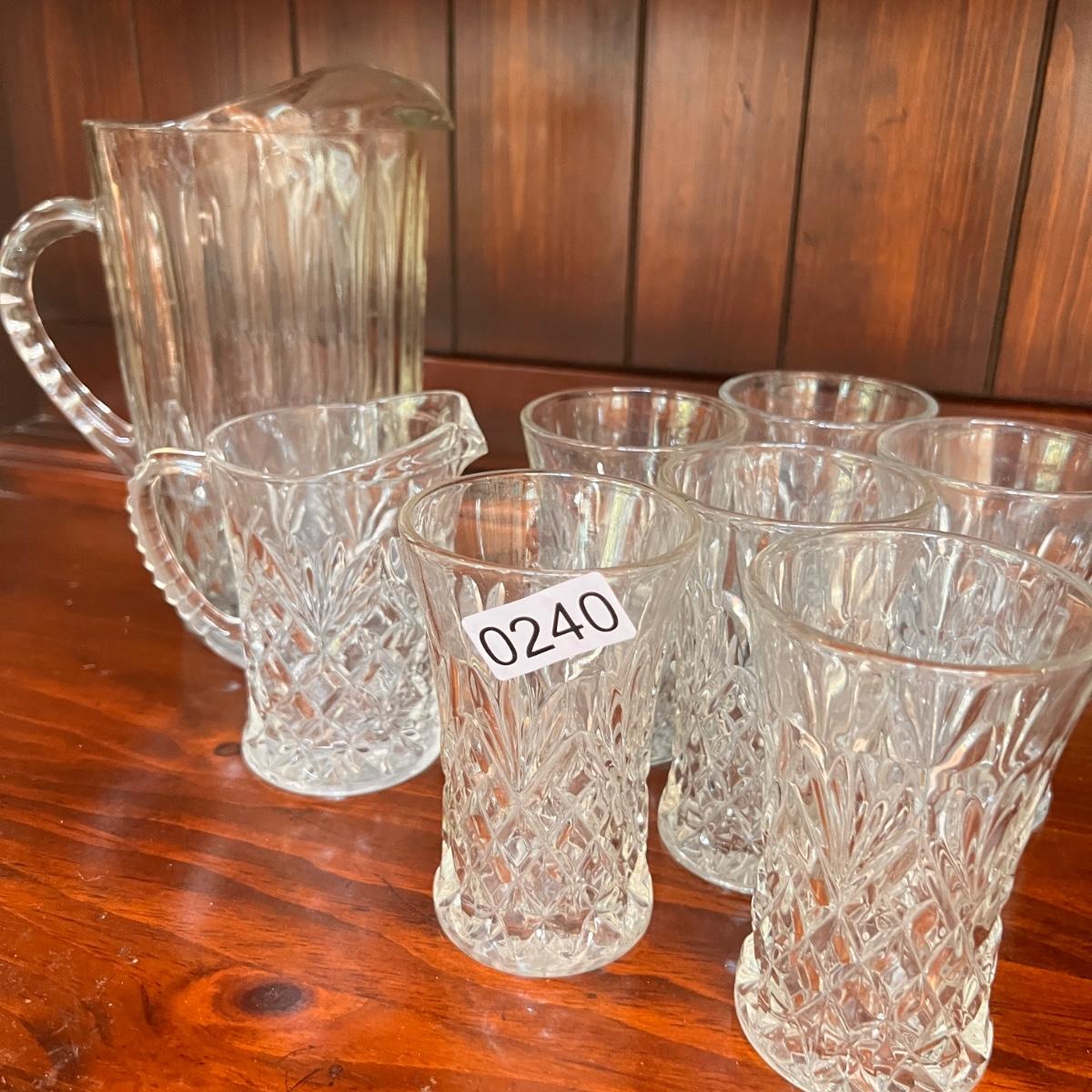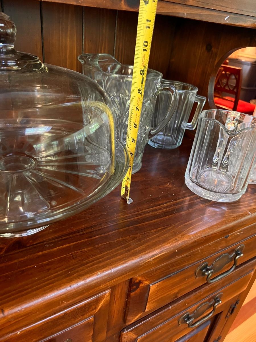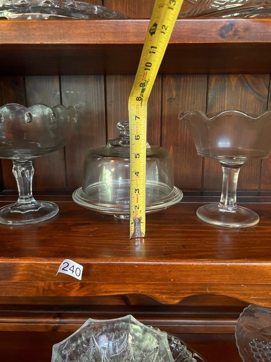 Etched glass, cut glass, possible crystal? Cake stands, plates, bowls, pitchers, cannisters, dispensers, etc.