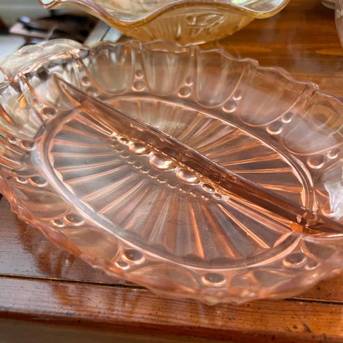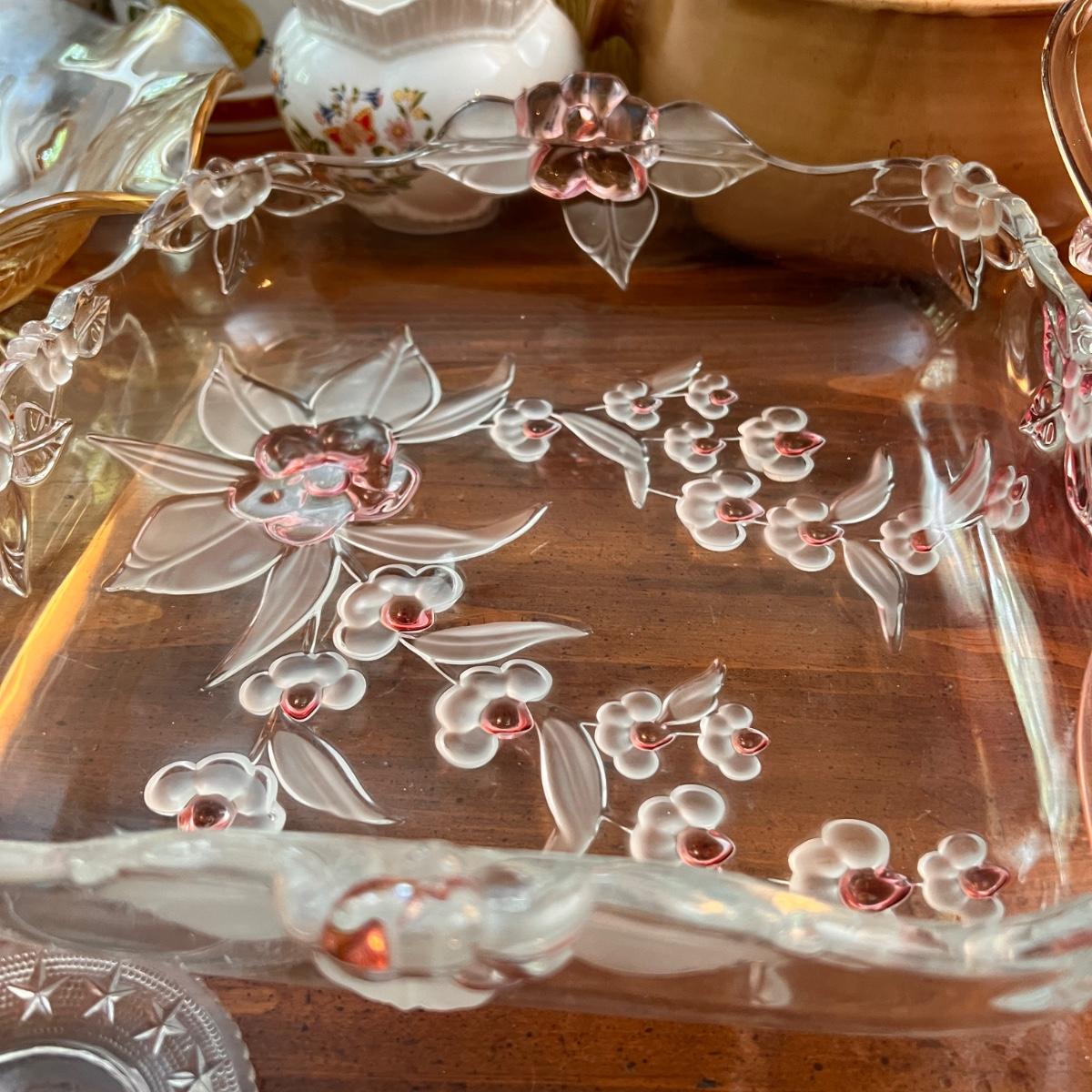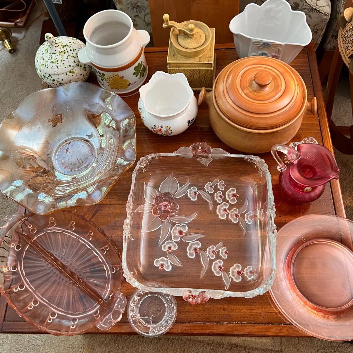 The large square dish is believed to be Mikasa blossom time Toska serving dish. Iridescent possible carnival glass large bowl. Pink (looks to be Depression glass) 2 sided serving dish. MCM atomic ceramic bowl with top white with green specks, 2 blush pink etched (looks to be Depression) glass plates plus more!