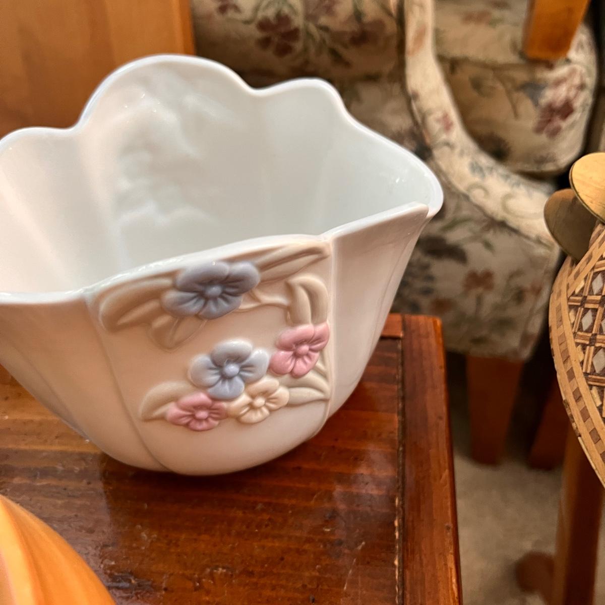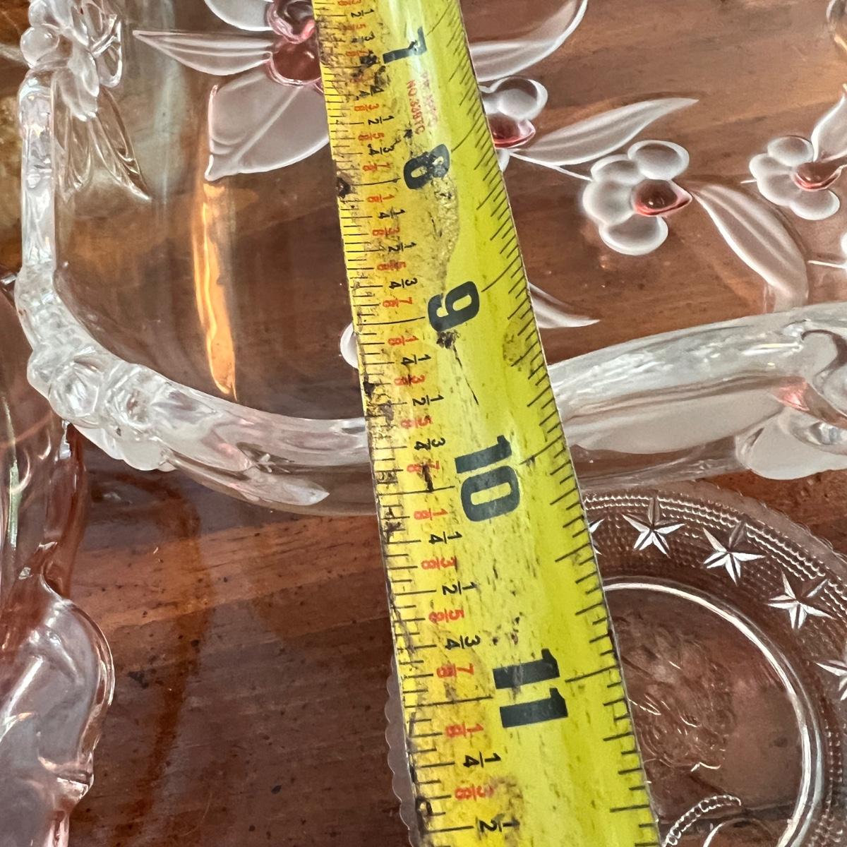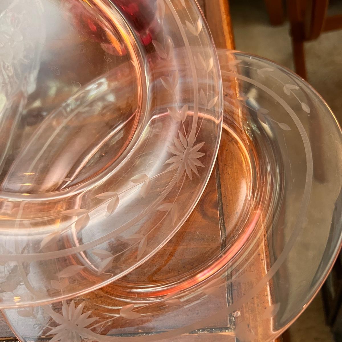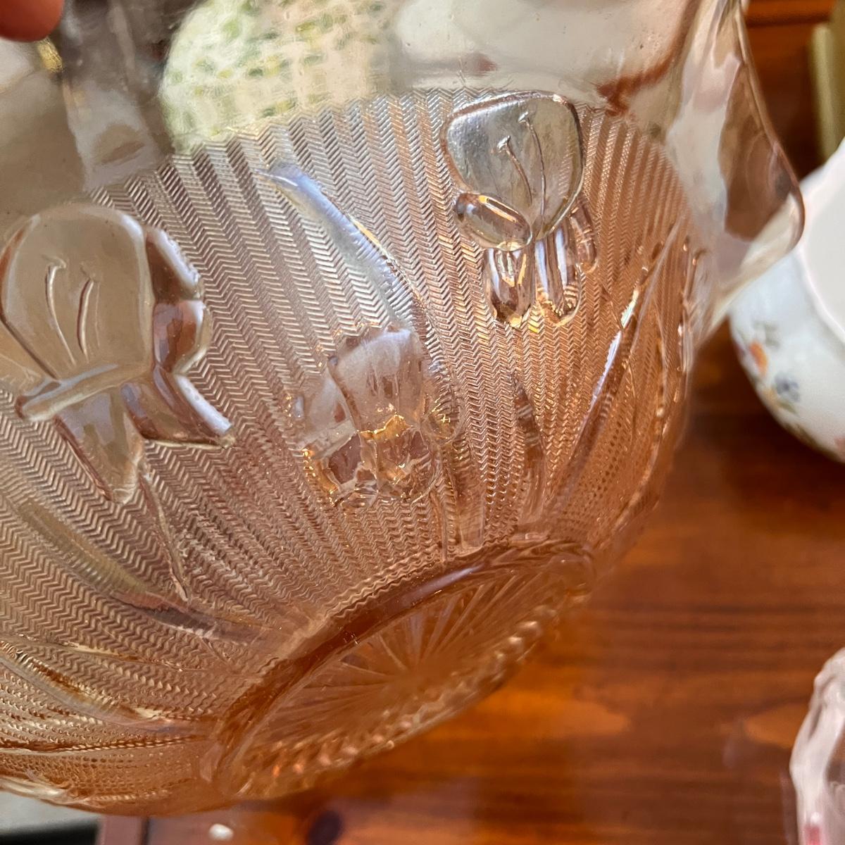 The large square dish is believed to be Mikasa blossom time Toska serving dish. Iridescent possible carnival glass large bowl. Pink (looks to be Depression glass) 2 sided serving dish. MCM atomic ceramic bowl with top white with green specks, 2 blush pink etched (looks to be Depression) glass plates plus more!