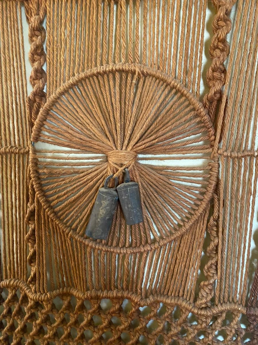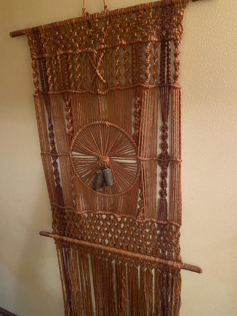 Large vintage macrame wall hanging, tan color with heavy metal bells. Approx 72h x 29w. Could use a cleaning.